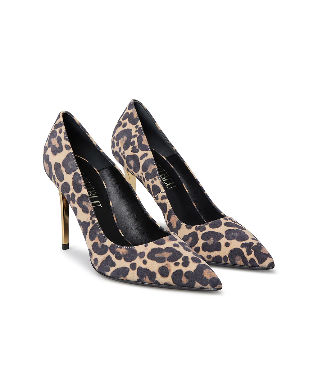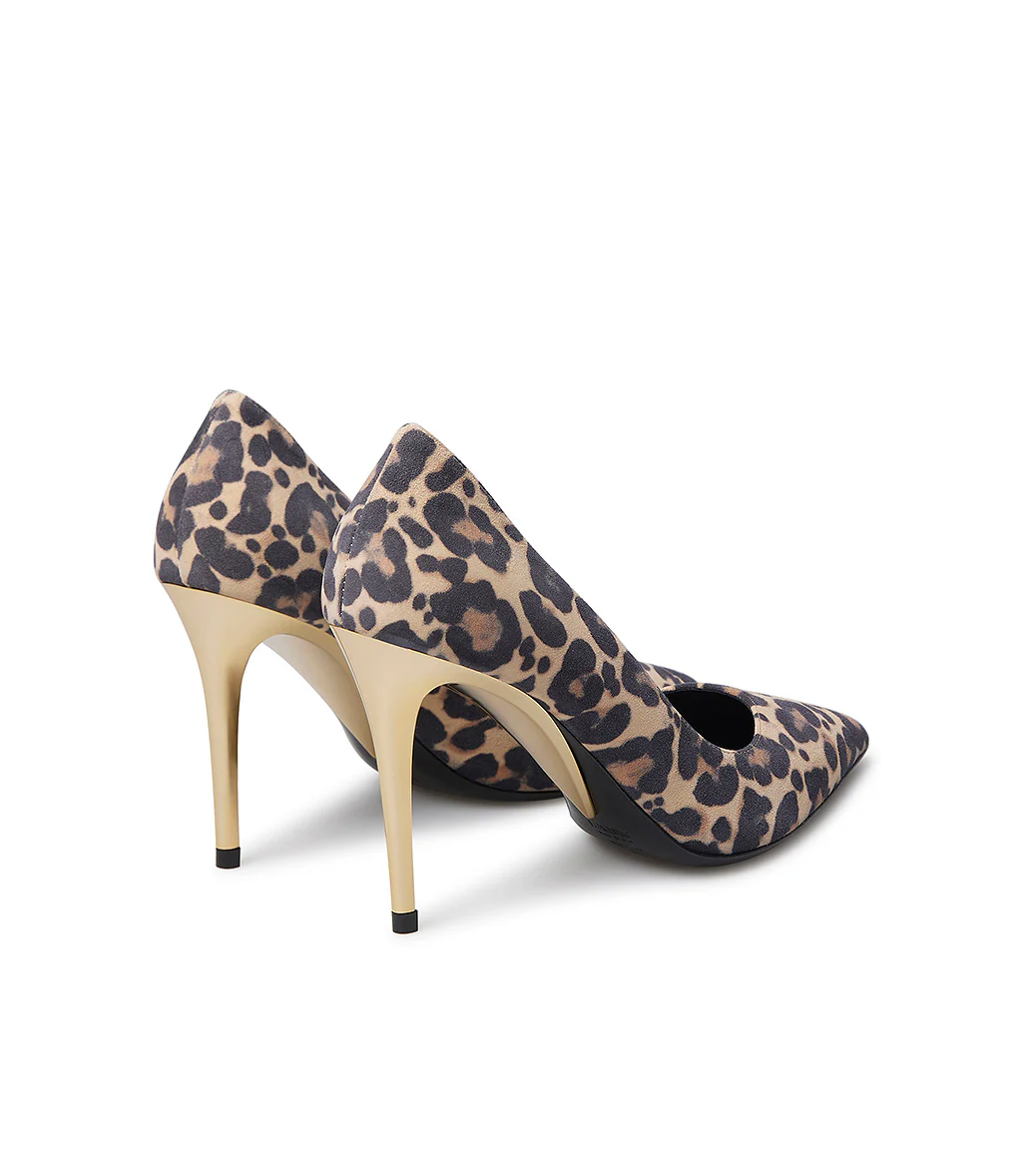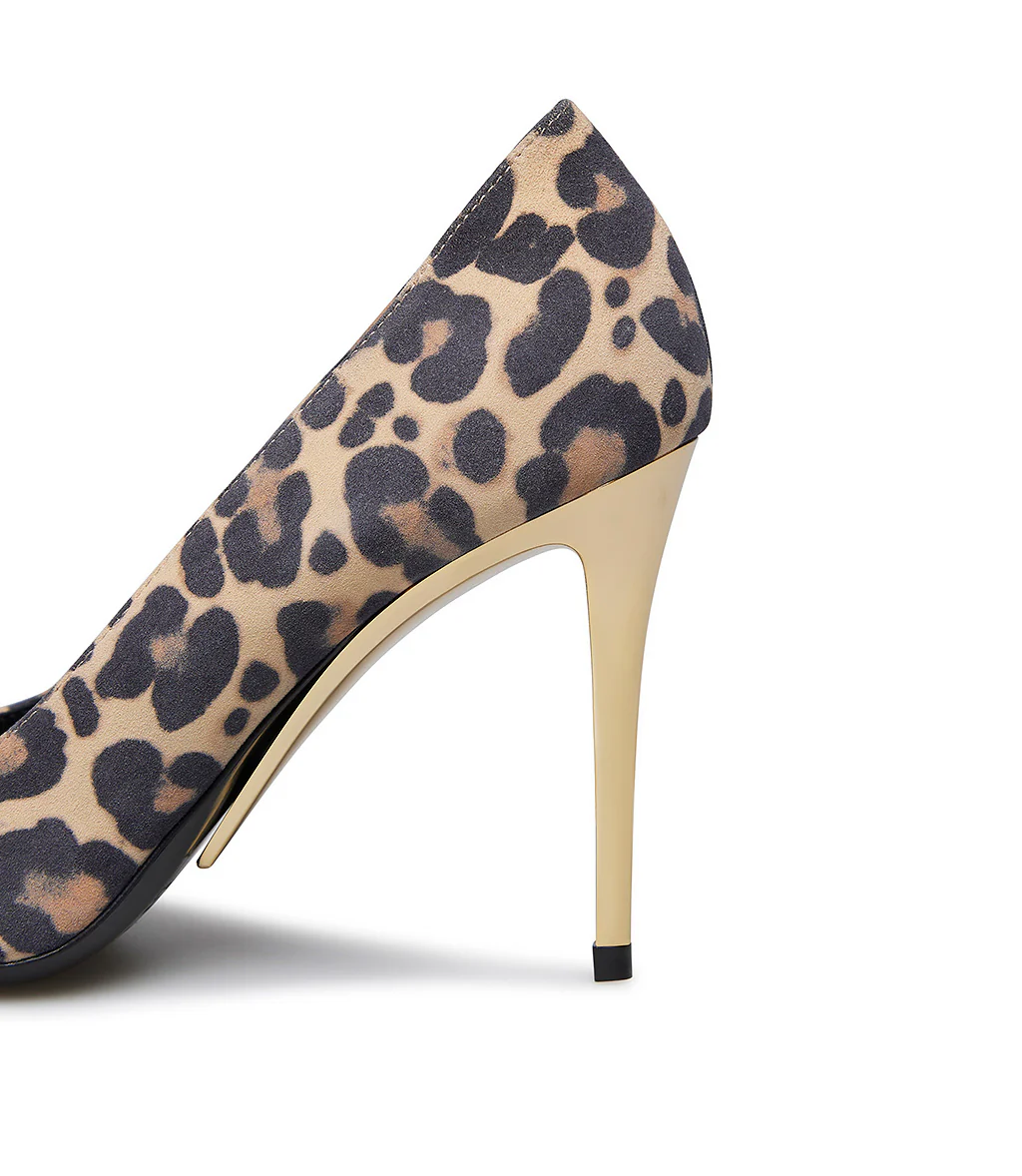 Le fantasie animalier sono protagoniste della nuova collezione di Loriblu. Realizzate in Italia, queste favolose décolleté presentano una silhouette affusolata, tomaia in stampa leopard e un originale alto tacco a spillo in metallo oro che si estende alla suola. Mettile in risalto con un abito elegante e completa il tuo look con una clutch gioiello.