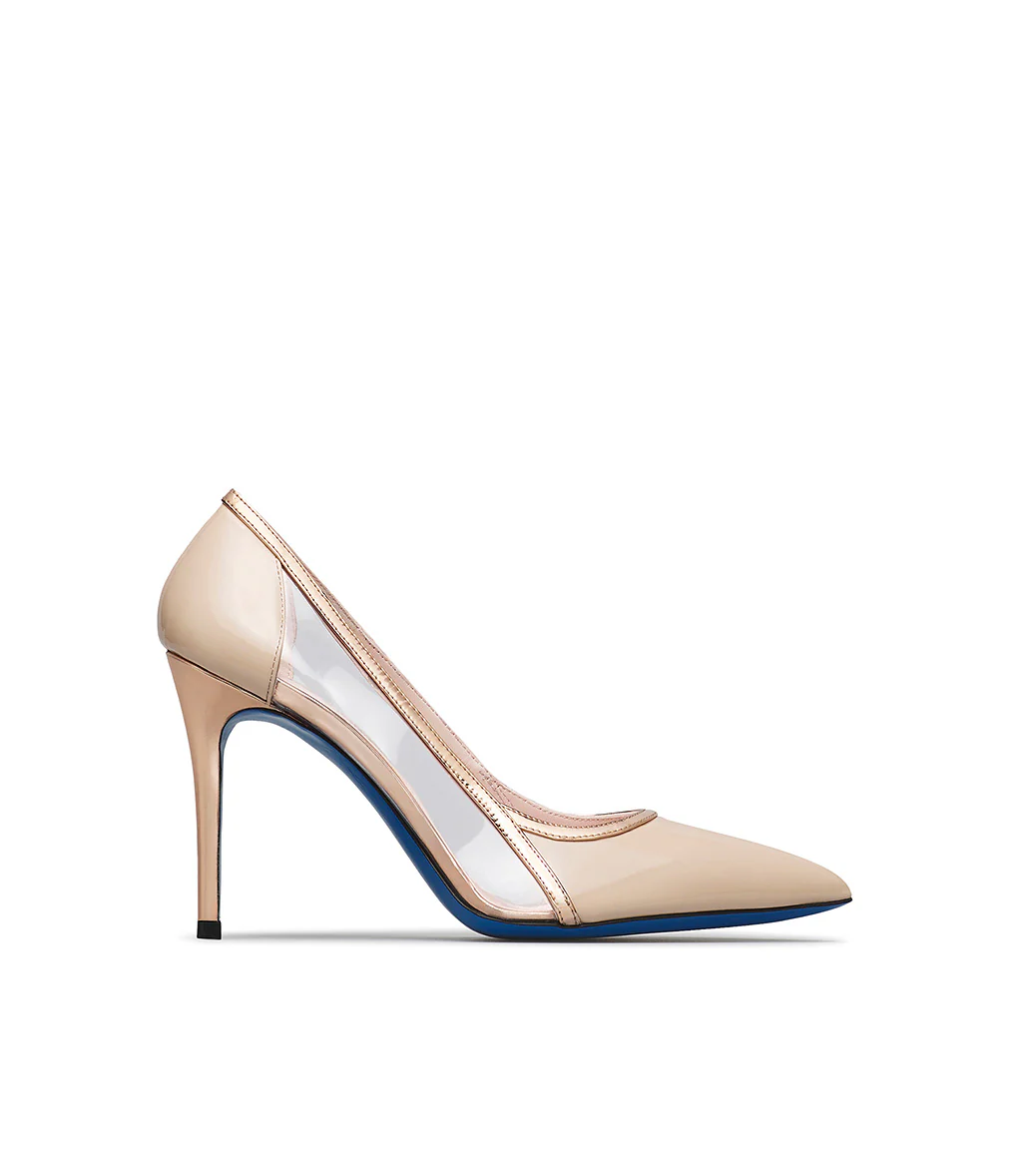 Sensuali e femminili, le nostre décolleté in nappa nuance crema sono impreziosite dagli inserti laterali in plexi trasparente che conferiscono una nota escusiva al modello. Realizzate con cura in Italia, poggiano su di un alto tacco a spillo e rivelano la nostra iconica suola in cuoio blu. Sfoggiale con i tuoi looks più eleganti della stagione.