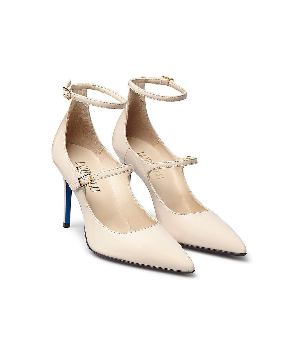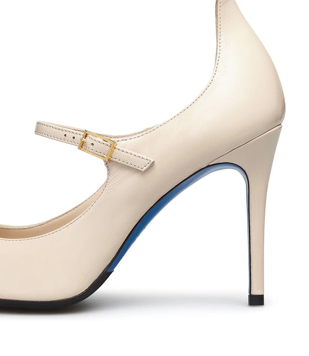 Realizzate con cura in Italia in pelle lucida sabbia, le nostre décolleté sono perfette da indossare sia di giorno che di sera con outfits eleganti e contemporanei. Presentano una punta affusolata, un doppio ciunturino sul collo del piede, un sensuale tacco a spillo e la nostra distintiva suola in cuoio blu.