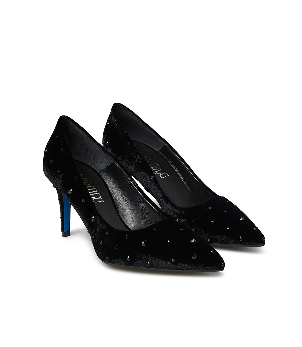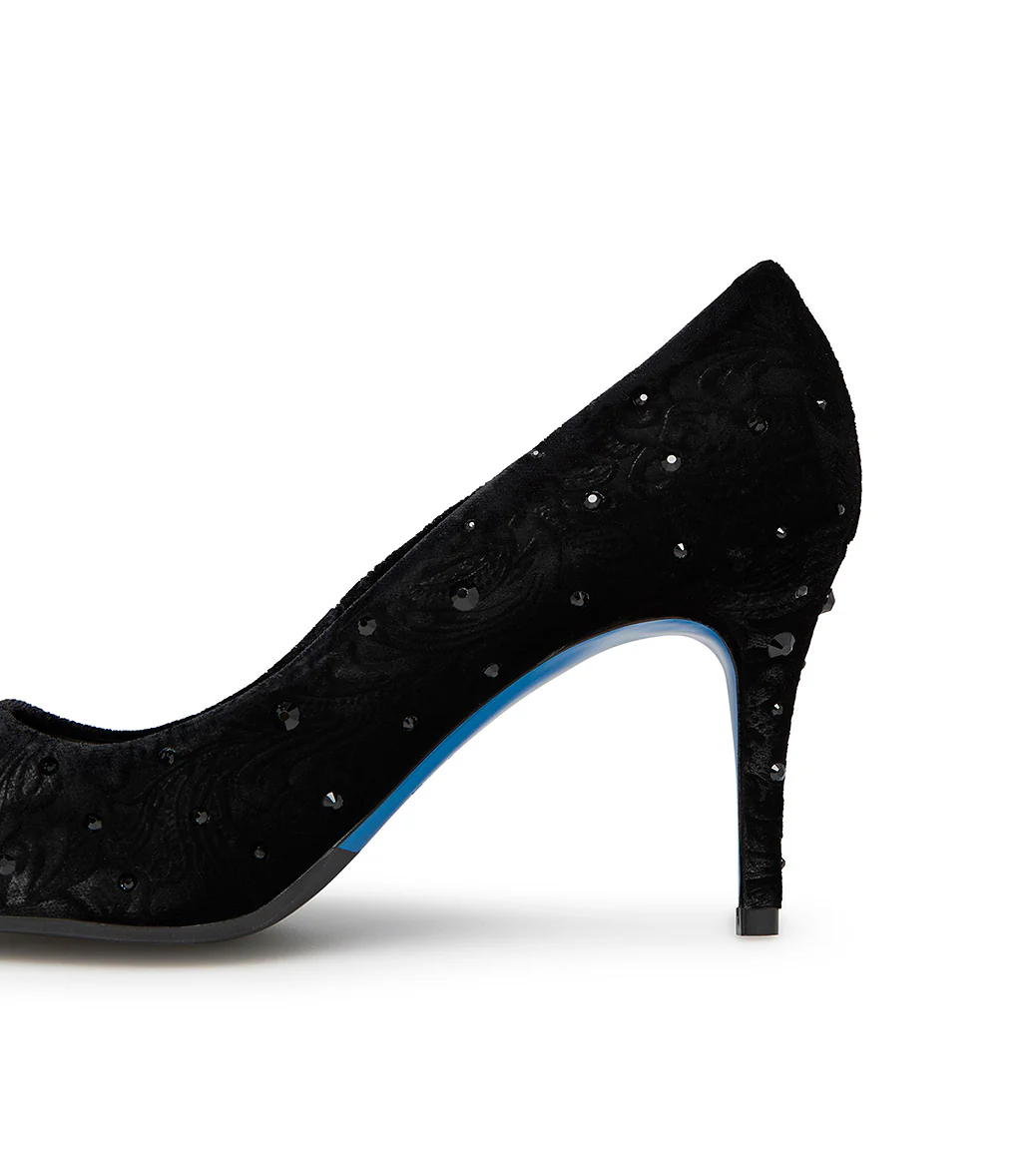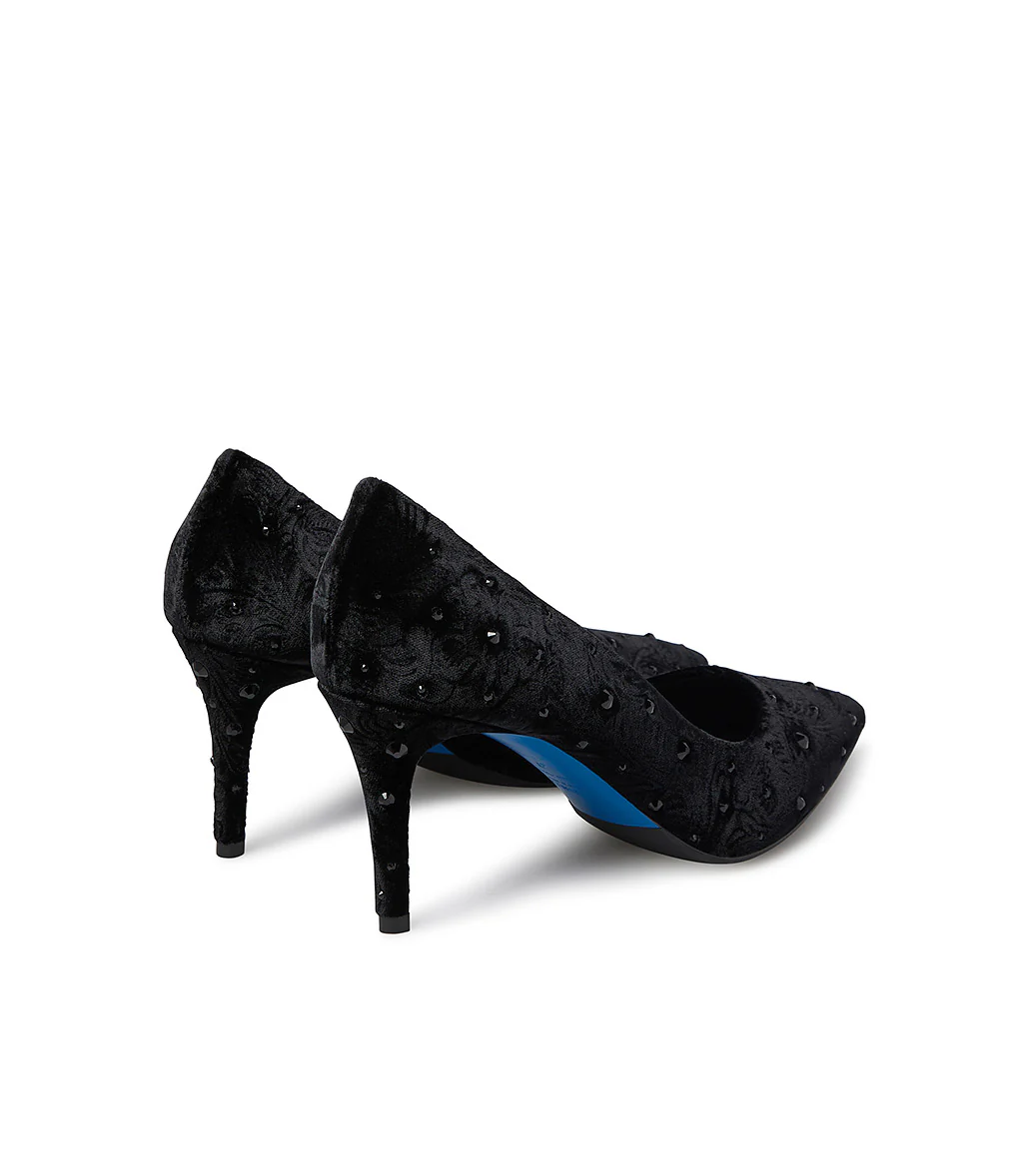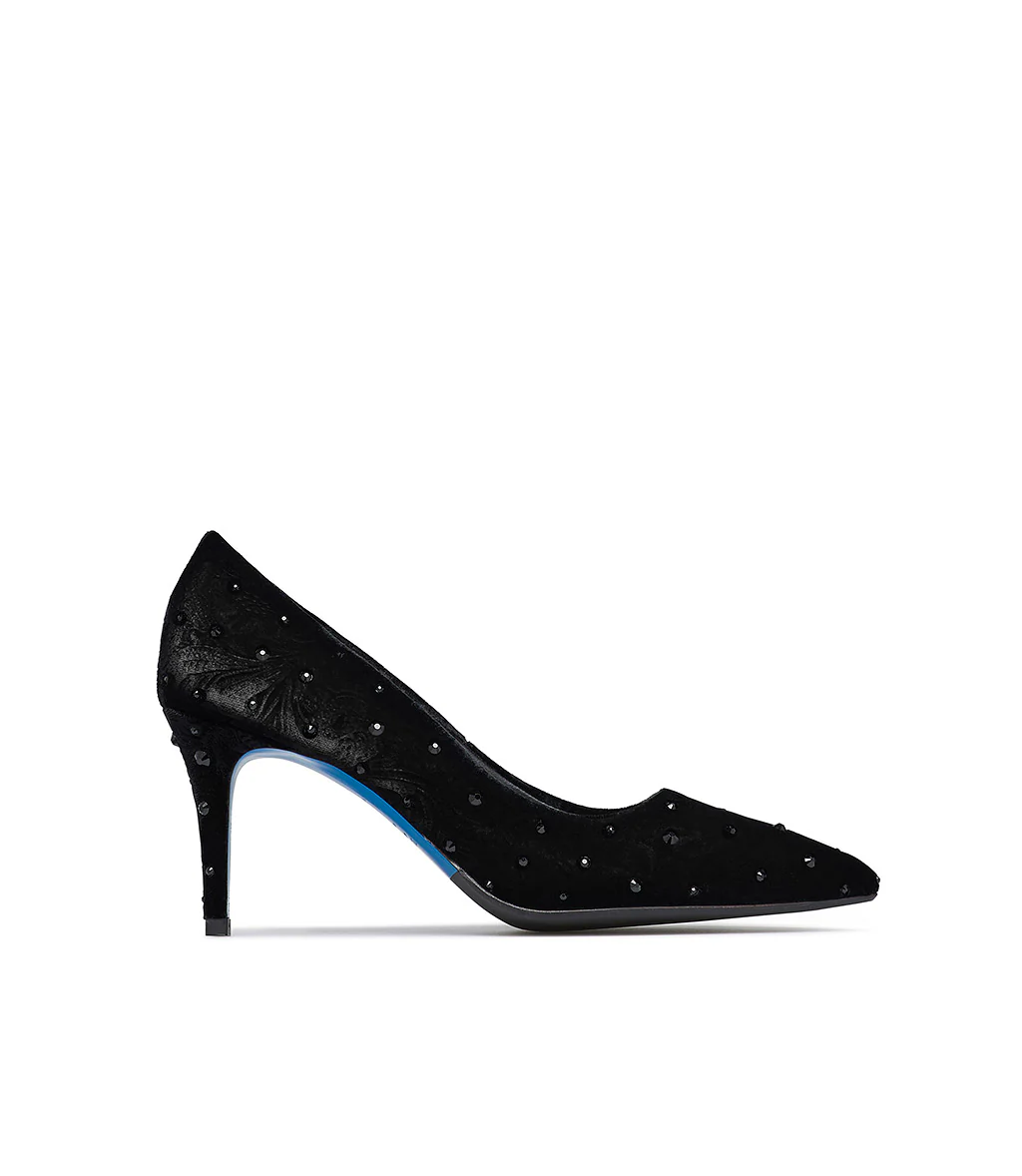 Questa nuova décolléte in pregiato velluto damascato nero rivela una silhouette affusolata, con cristalli ton-sur-ton su tutta la tomaia, un confortevole tacco medio a spillo e la nostra iconica suola in cuoio blu. Indossale con abiti eleganti o pantaloni sartoriali