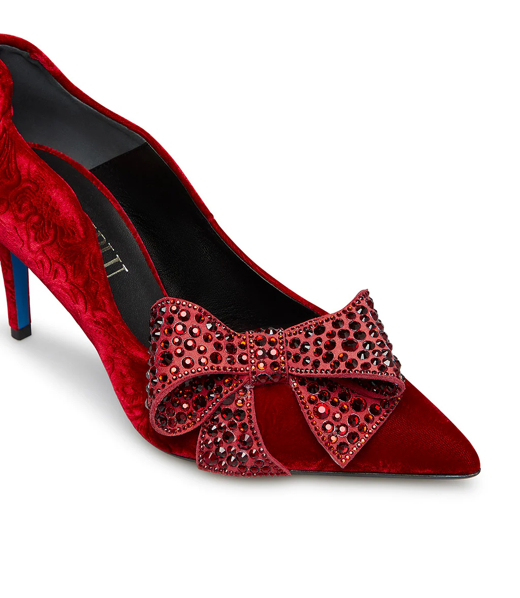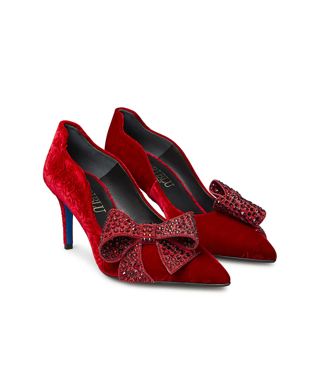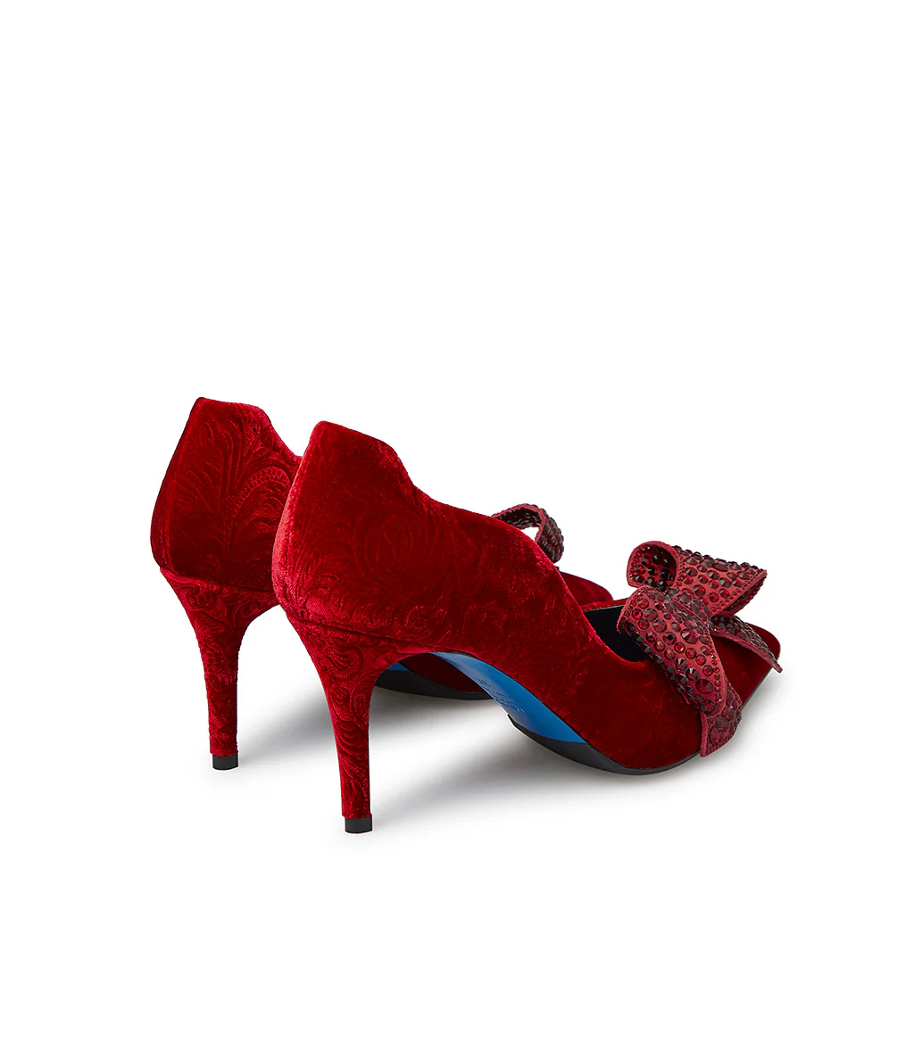 Femminili e raffinate, le nostre décolleté in morbido velluto rosso spiccano grazie al design affusolato e i bordi dolcemente ondulati. Un maxi fiocco impreziosito da cristalli ton-sur ton esalta l’eleganza della tomaia in velluto damascato, tacco a spillo e suola iconica blu. Lasciati sedurre dalle nostre nuove décolleté e abbinale con morbidi pullover e gonne midi in raso per un perfetto mix & match da sfoggiare al prossimo cocktail party.