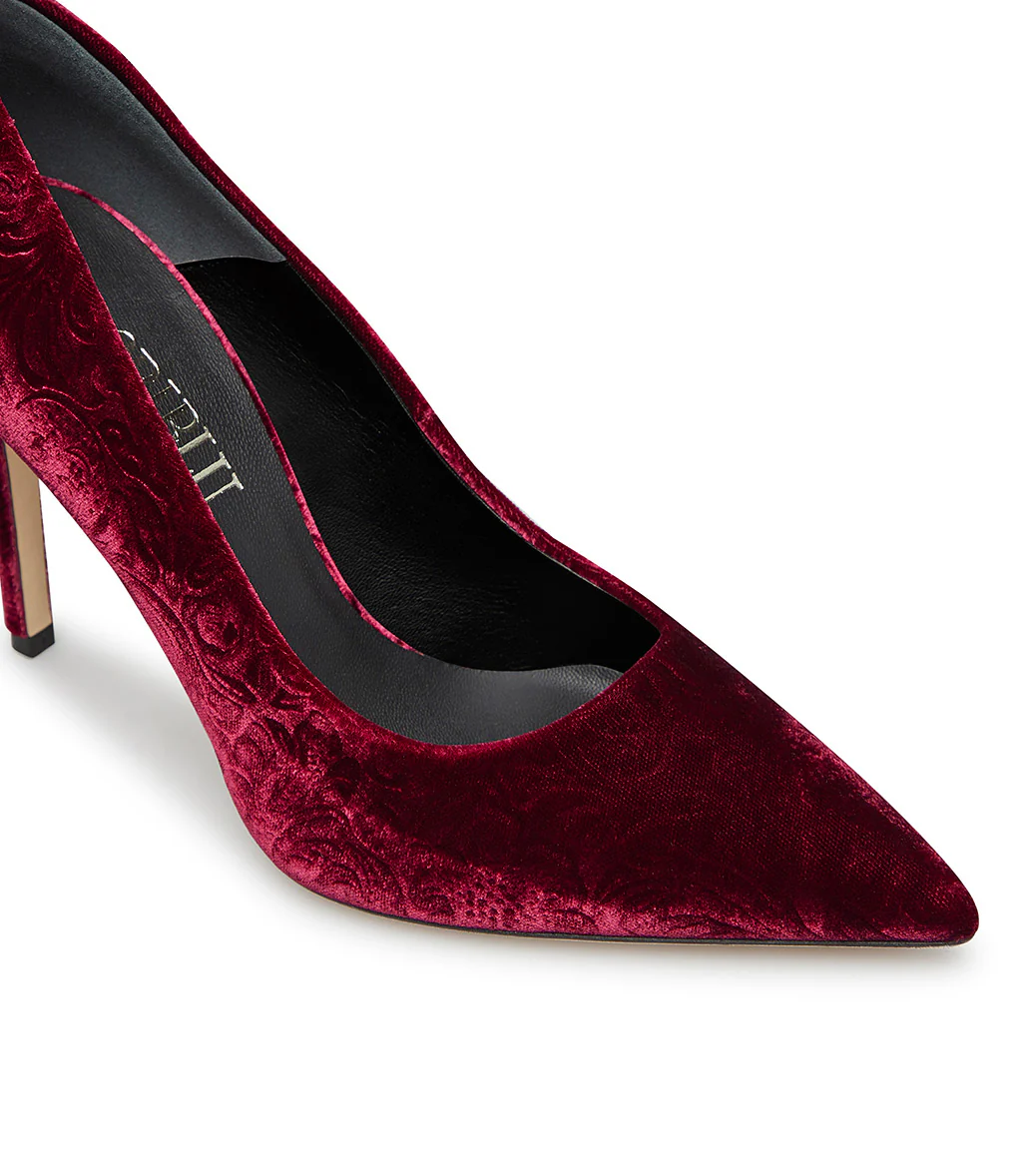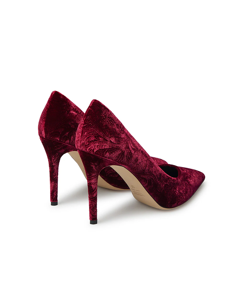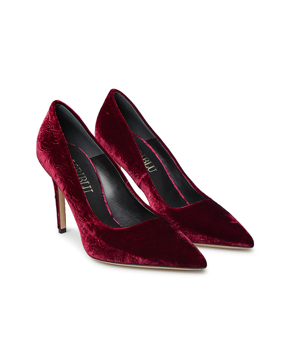 Design elegante e senza tempo per le nuove décolléte Loriblu in velluto rosso rubino damascato capaci di esaltare l’outfit più raffinato sia per il giorno che per la sera. Un classico tacco a spillo e l’iconica suola blu completano il modello