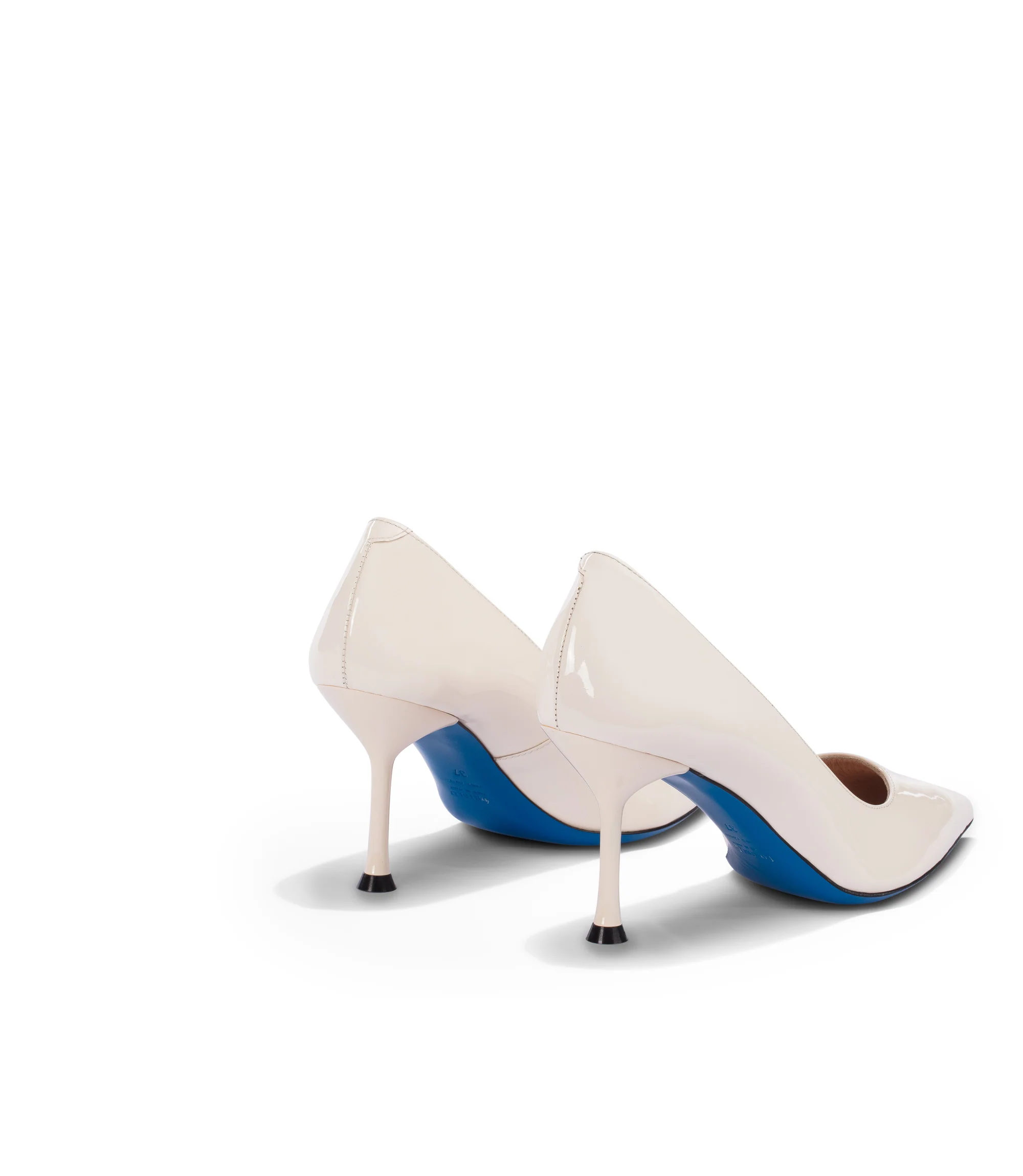 Raffinate e femminili, le nostre décolleté in vernice color panna rivelano una silhouette a punta affusolata, classico tacco a spillo, fodera e soletta in pelle e iconica suola in cuoio blu. Sono realizzate con cura in Italia e perfette da sfoggiare con completi ricercati e abiti da cocktail.