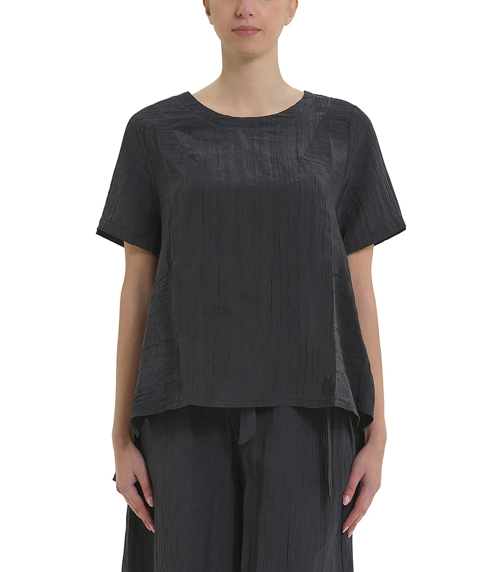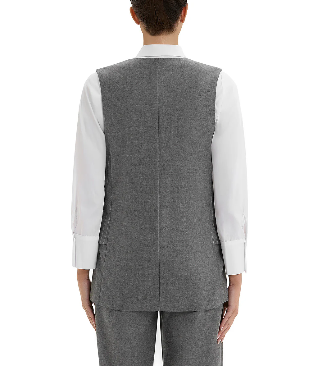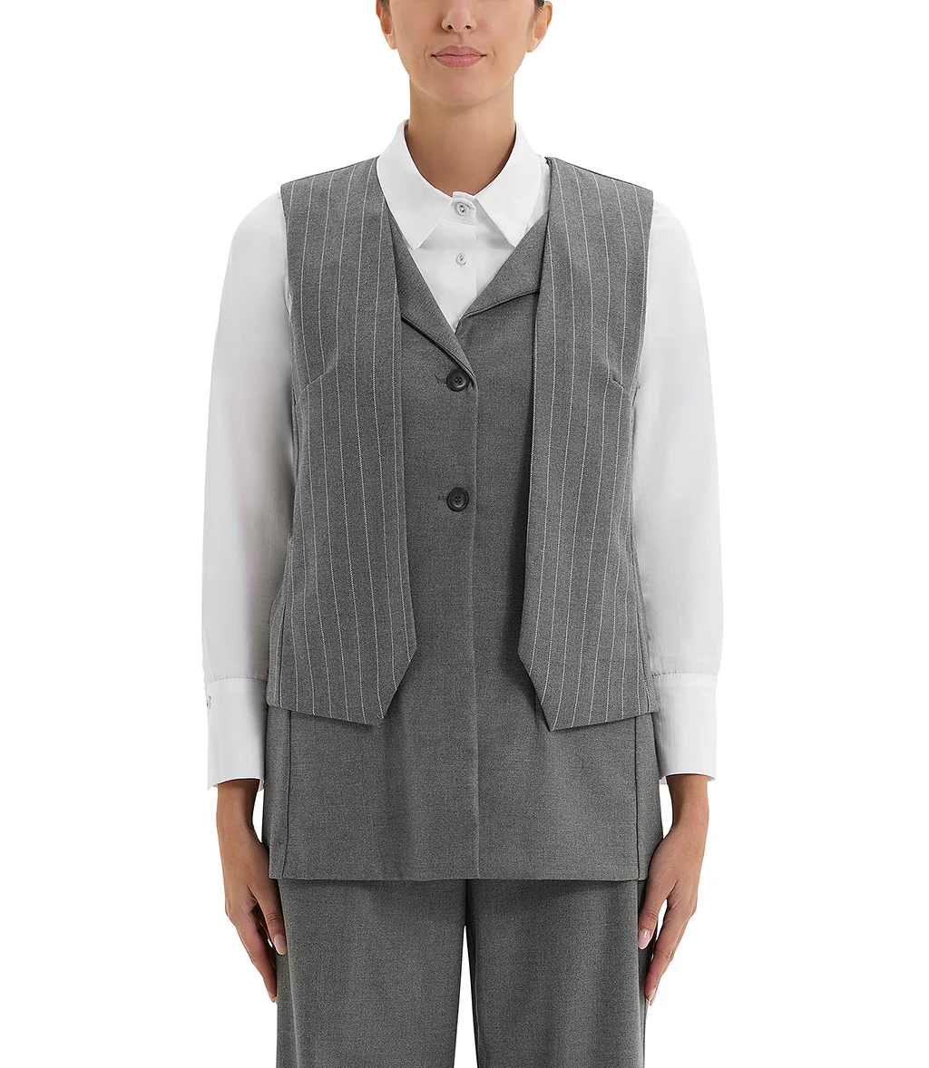 Doppia blusa, la parte superiore grigia gessata, smanicata, mentre, la parte sottostante si presenta con una rever classico con chiusura frontale a due bottoni. Design strutturato con taglio dritto.