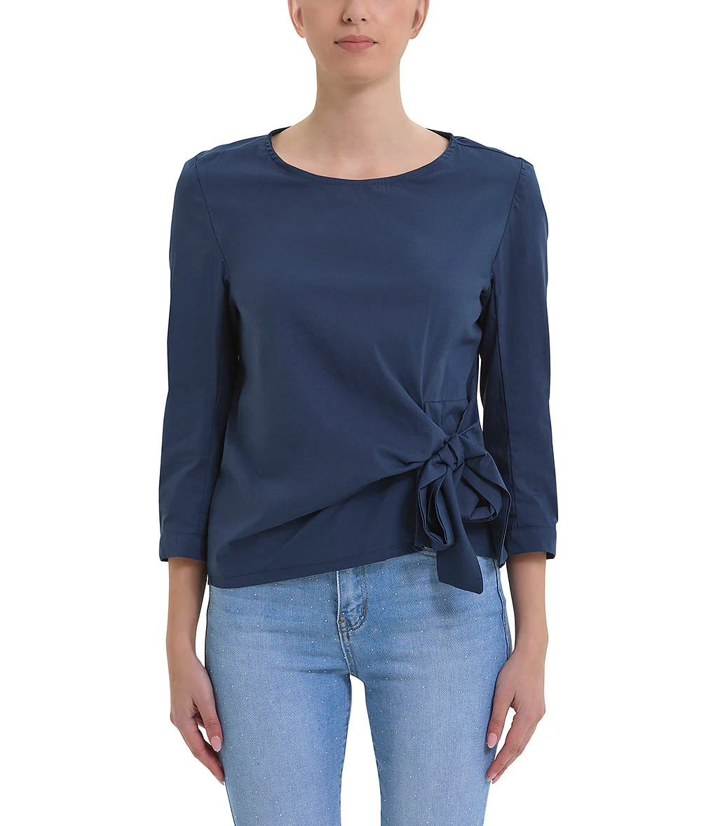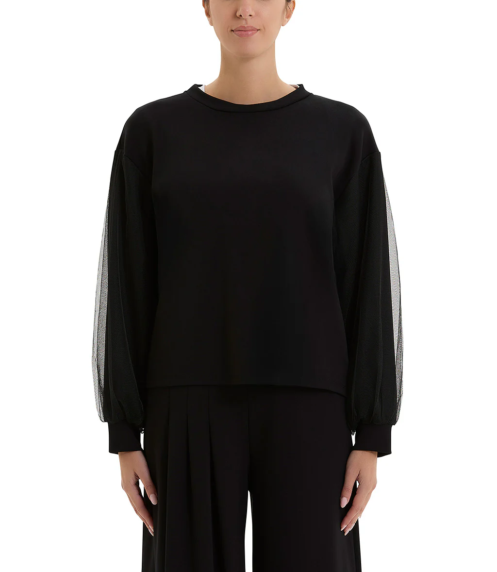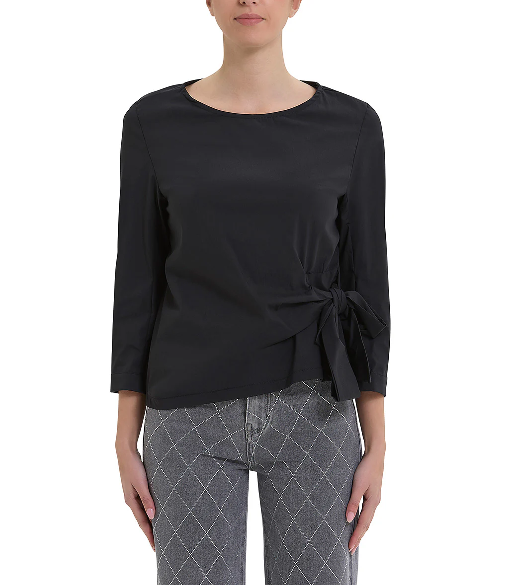 Doppia blusa, la parte superiore grigia gessata, smanicata, mentre, la parte sottostante si presenta con una rever classico con chiusura frontale a due bottoni. Design strutturato con taglio dritto.