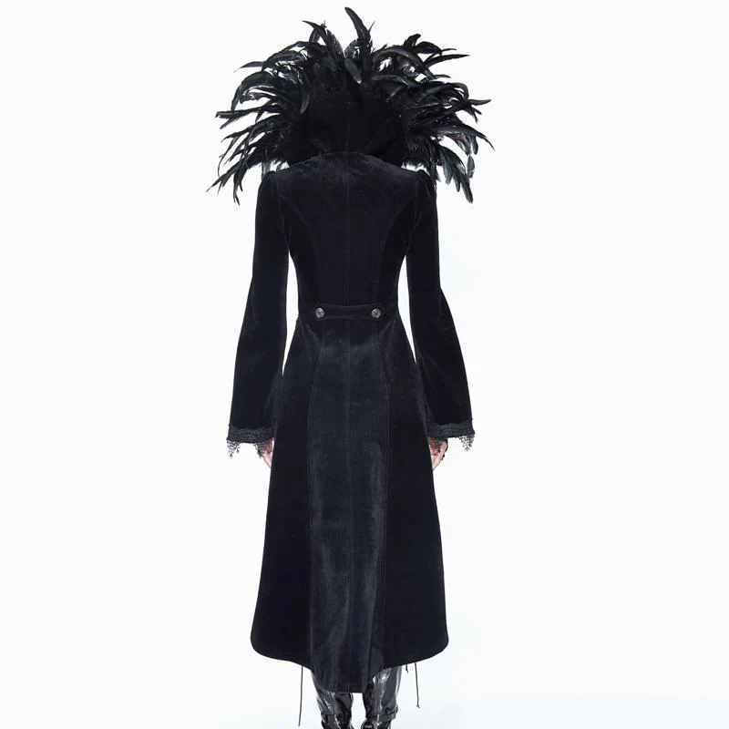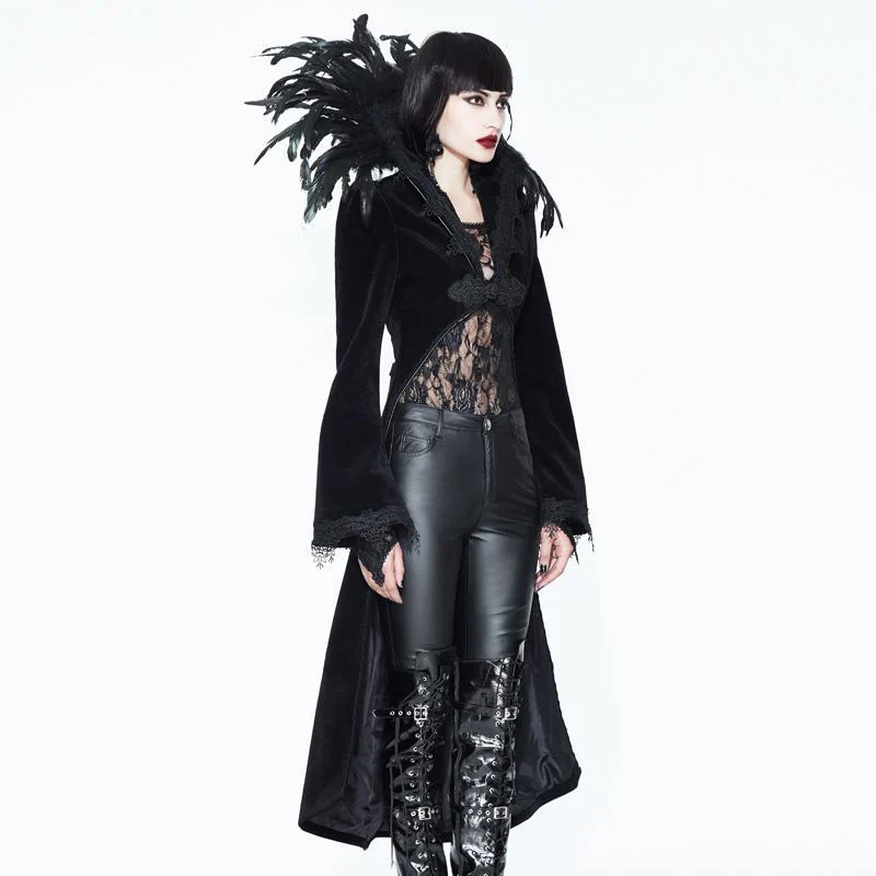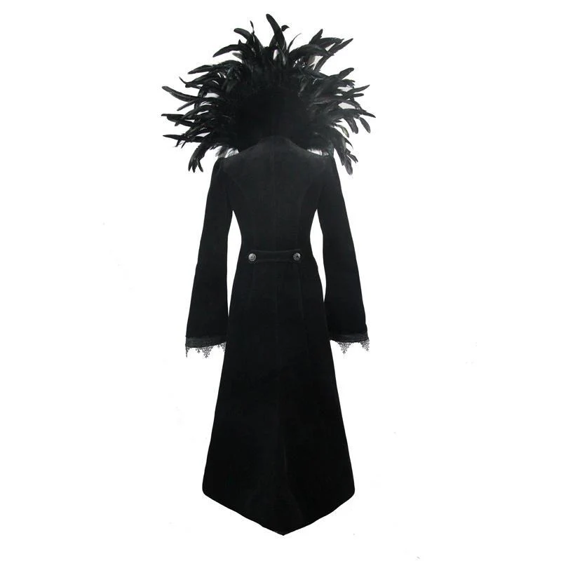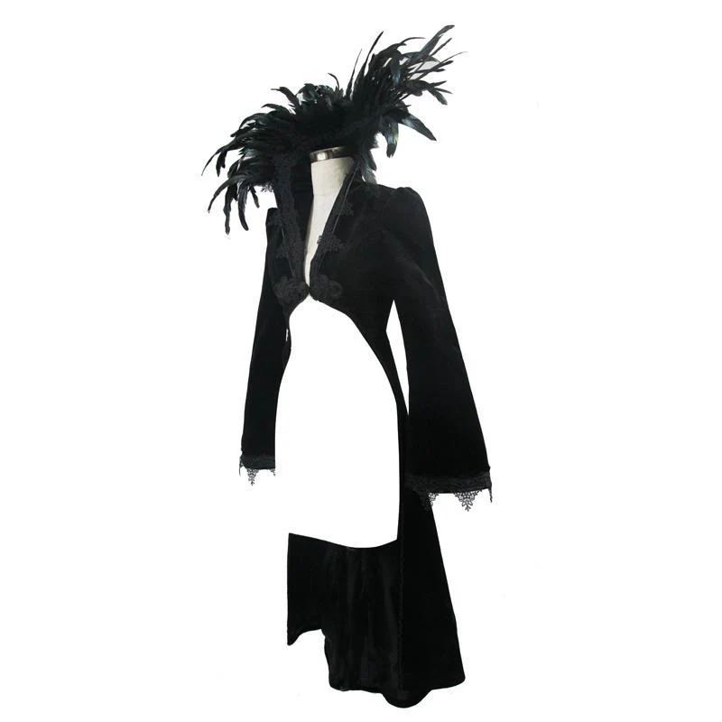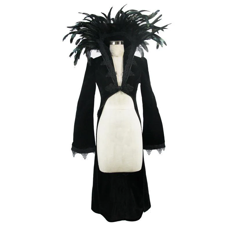 Descrizione:Quando cerchi un tocco di dramma, questa è la giacca che vuoi indossare. Lo splendido frac ha una giacca bolero molto corta sul davanti che si estende sul retro e sui lati fino a metà polpaccio. Tutto il dramma deriva da uno squisito colletto rialzato con piume che fornisce lo sfondo perfetto per il tuo viso. Il cappotto altamente decorato ha maniche a campana e dettagli di cordoncino.