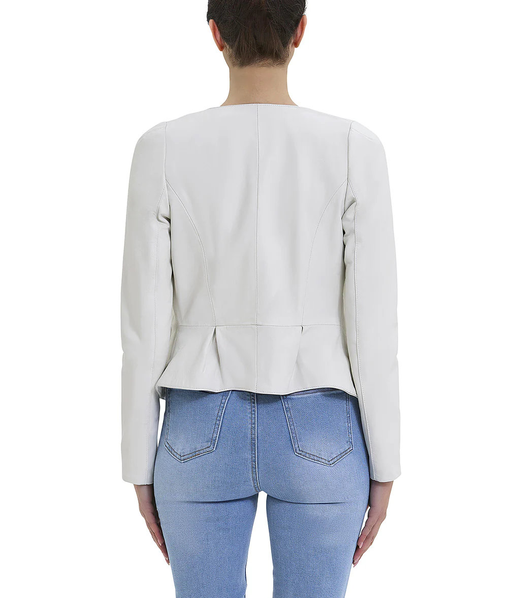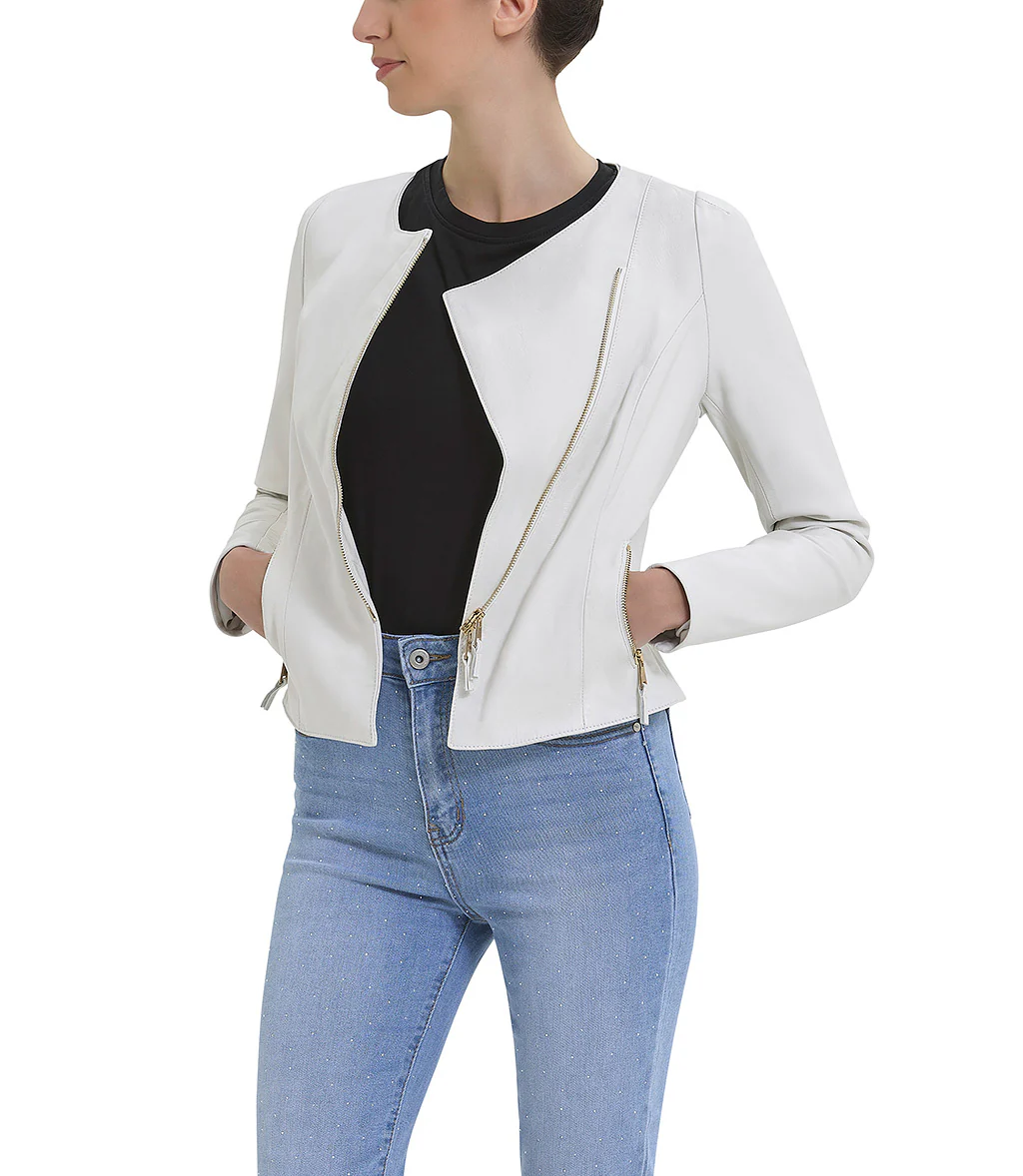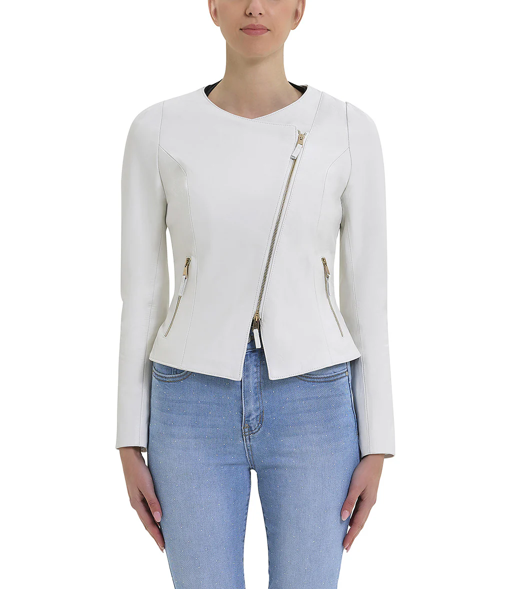Giacca bianca in pelle con tasche frontali e chiusura a zip obliqua