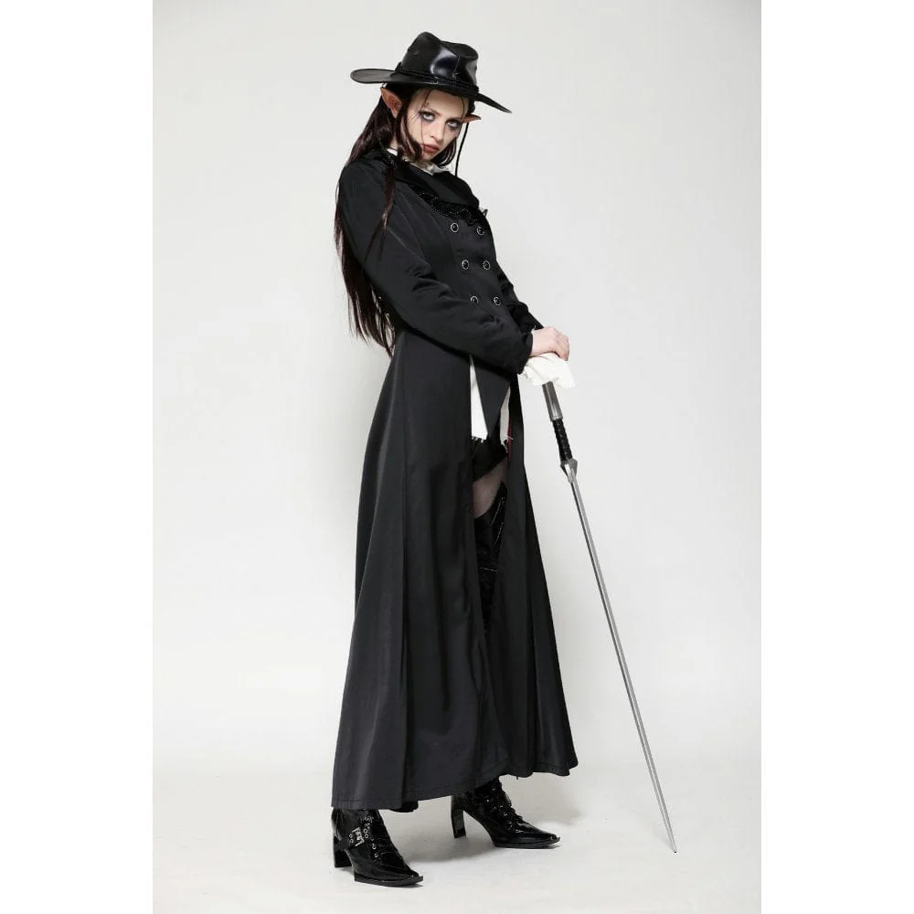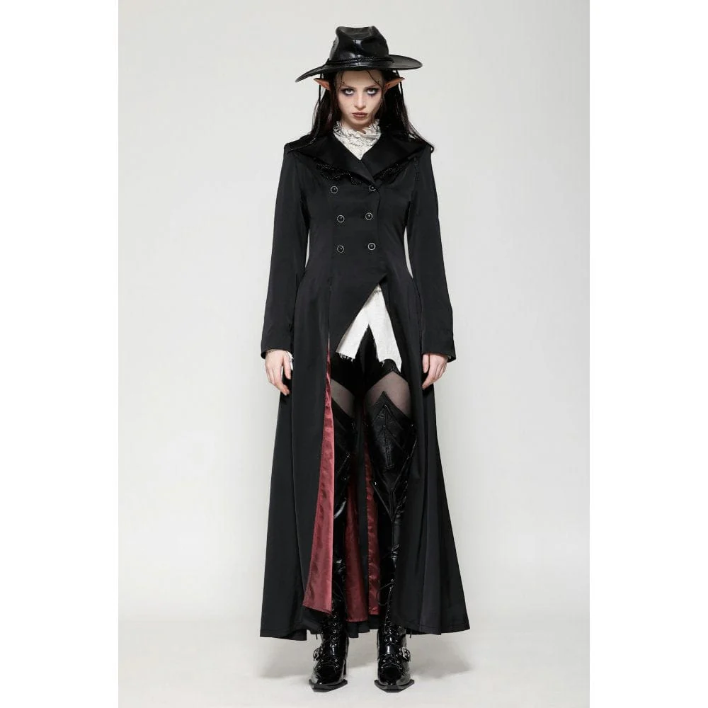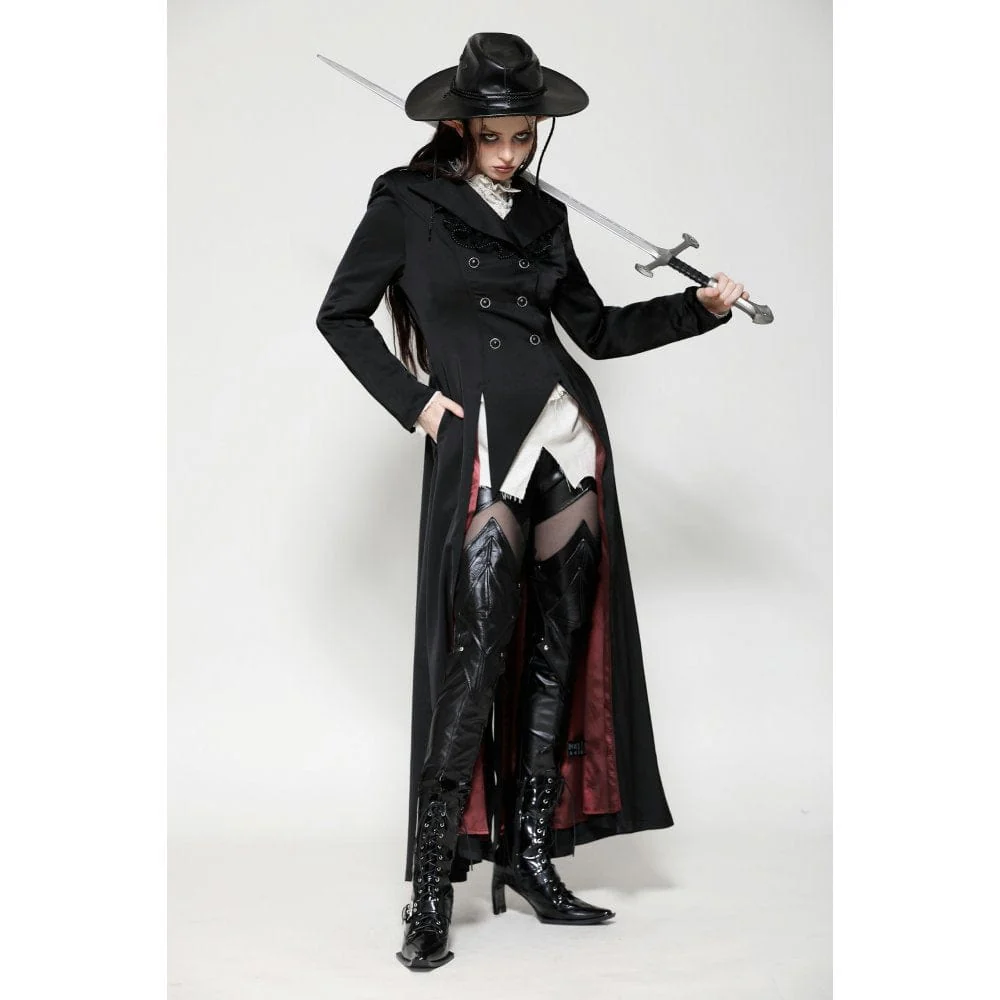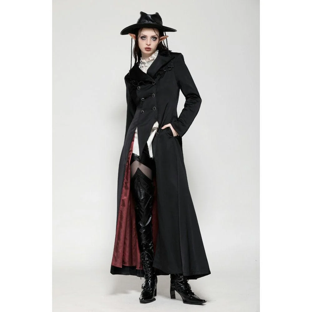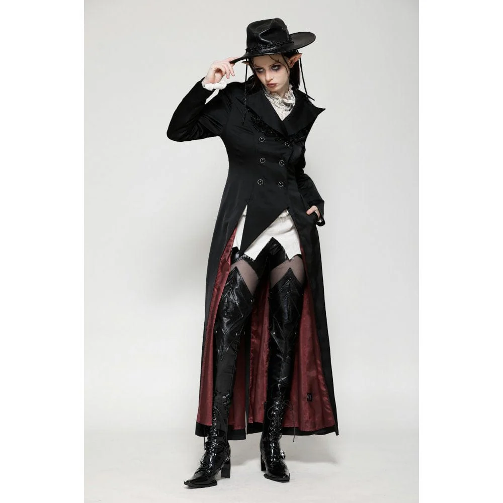 Questo trench è realizzato in tessuto satinato che mette in risalto un’aura aristocratica. Il dettaglio in pizzo con perline sul colletto aggiunge un tocco di lusso, mentre la silhouette alta e bassa rivela una fodera in raso rosso a ogni passo aggraziato. Perfetto per qualsiasi festa gotica, incarna il fascino di un conte vampiro.