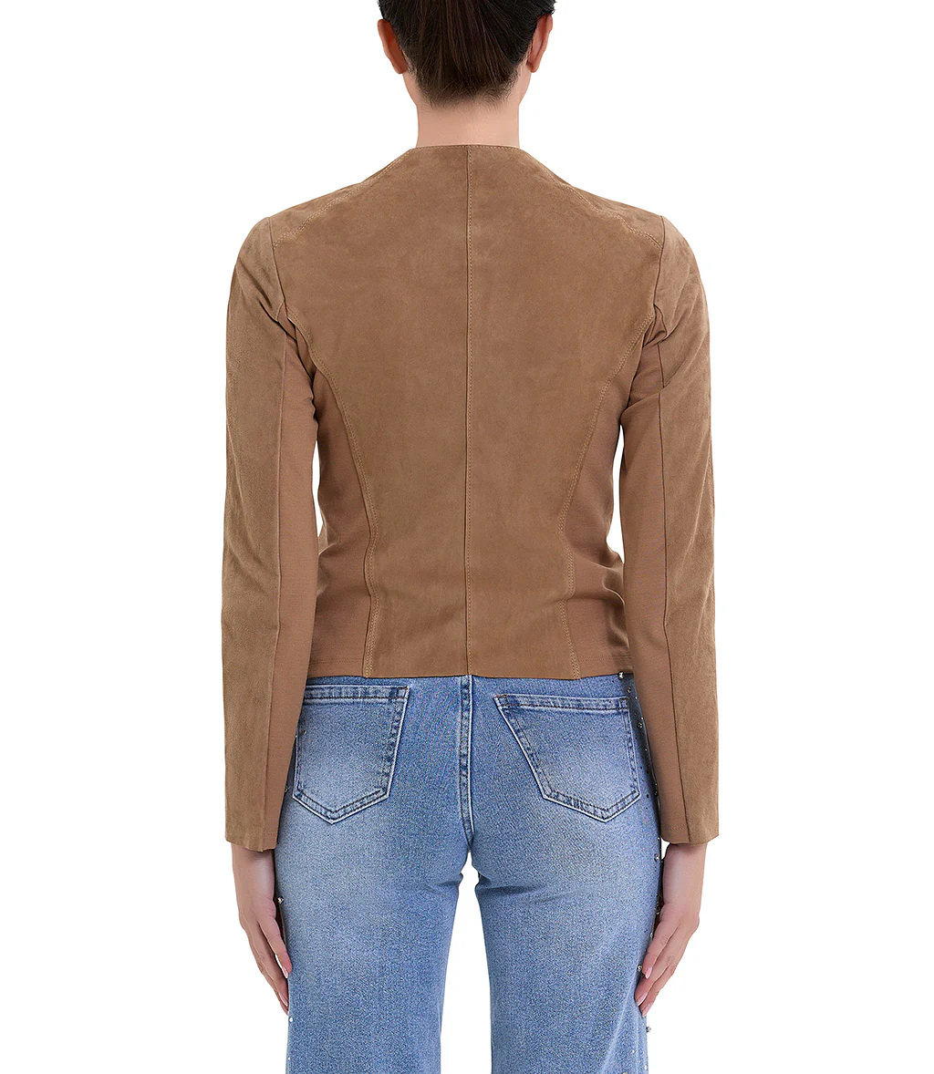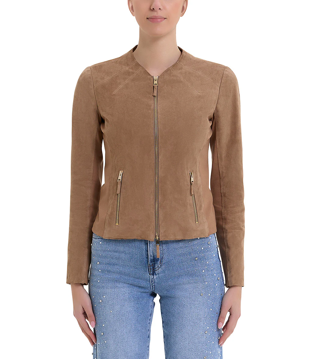 Giacca in pelle color marrone a manica lunga con chiusura cerniera zip frontale e sulle tasche, e cuciture asimmetriche laterali