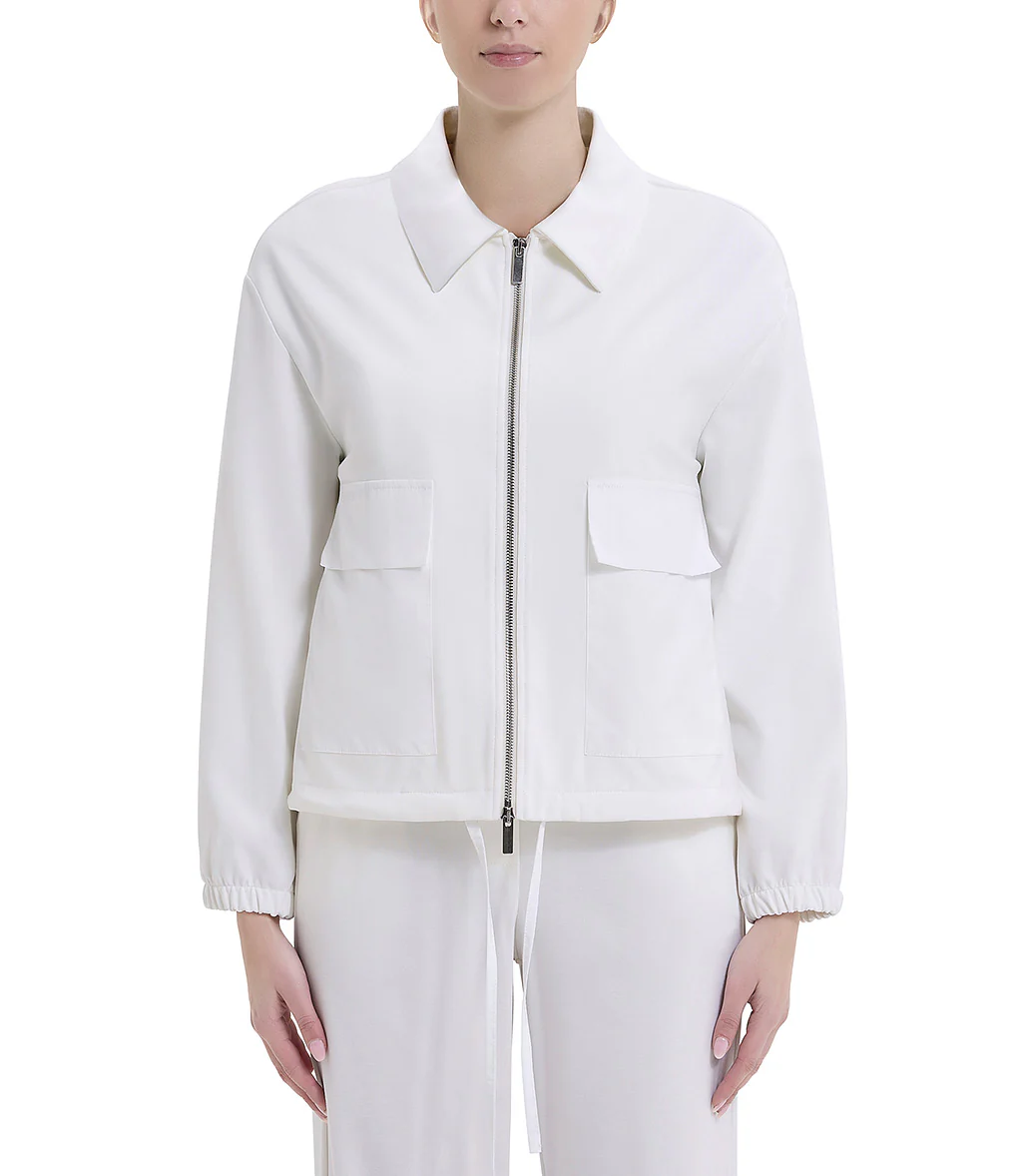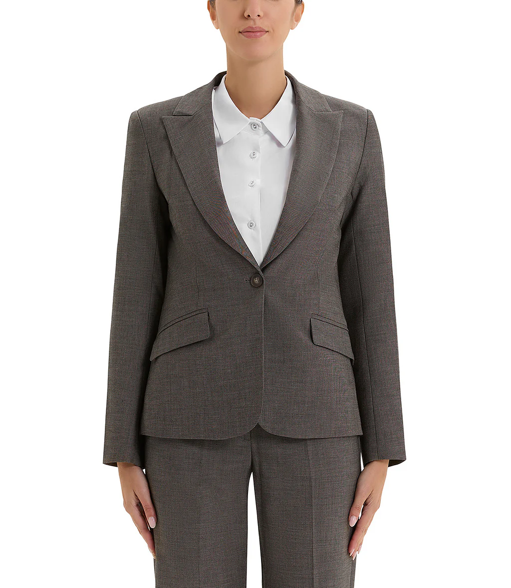 Giacca monopetto grigia con rever asimmetrico. Presenza di pince e tasche a filetto con pattina.
