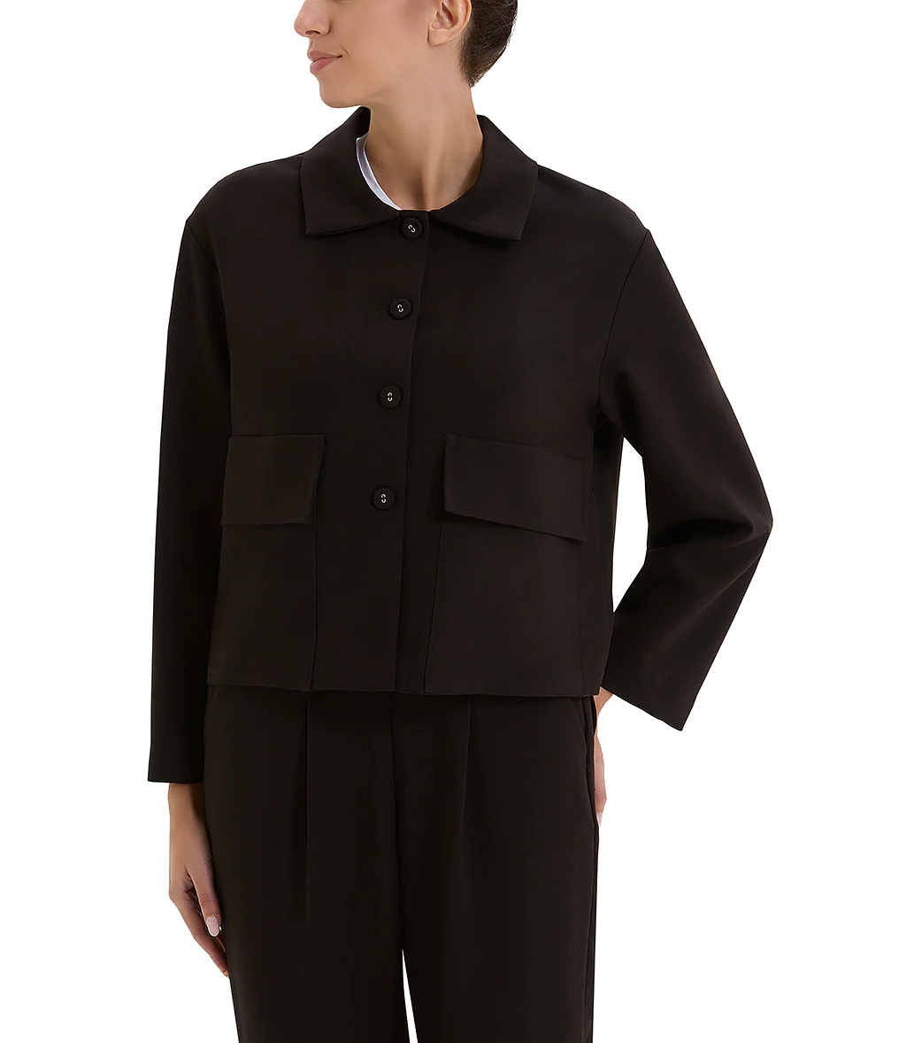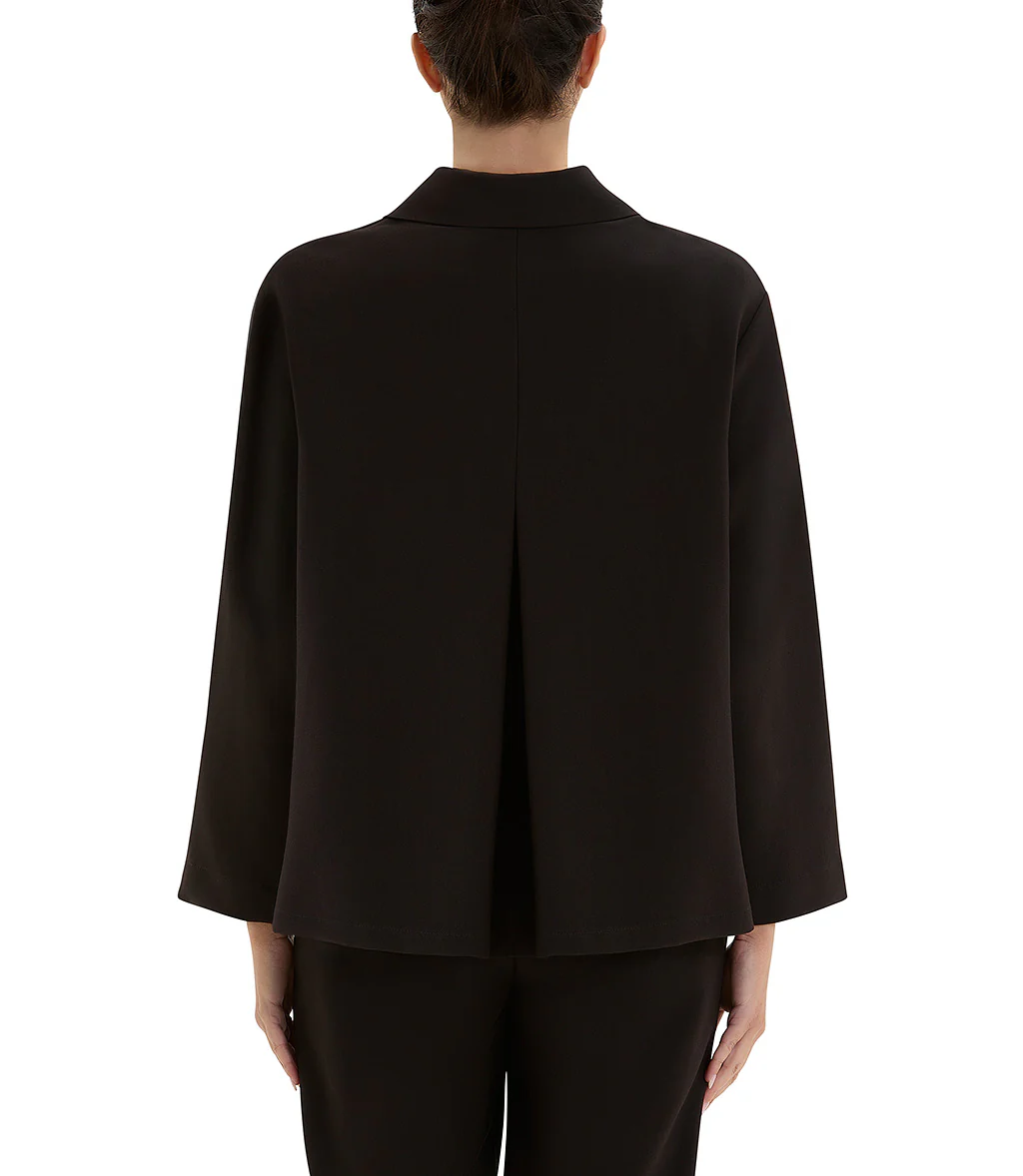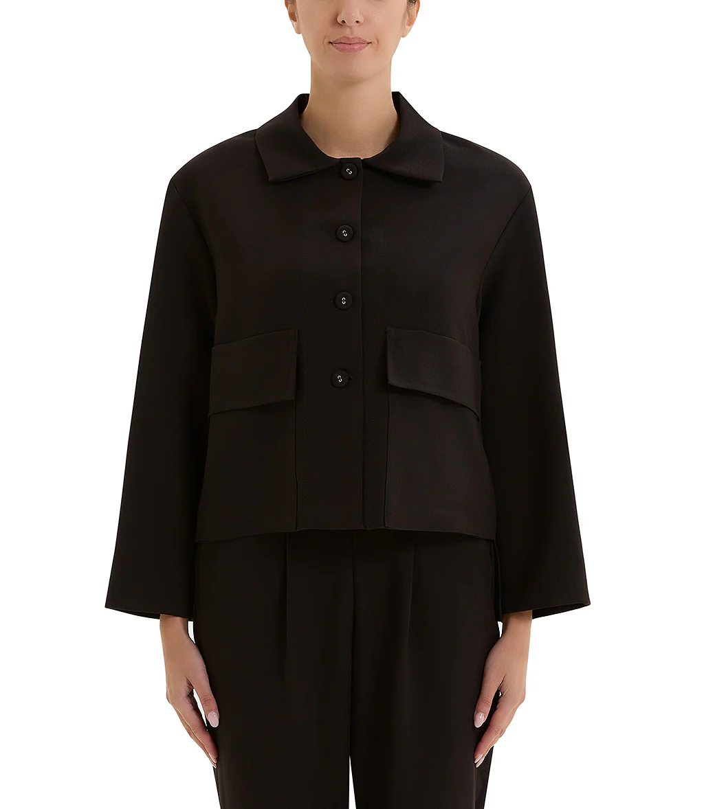Giacca nera con rever classico a maniche lunghe. Abbottonatura sul centro davanti con bottoni a due fori rivestiti in tessuto coordinato e due tasche a patta con pattina.