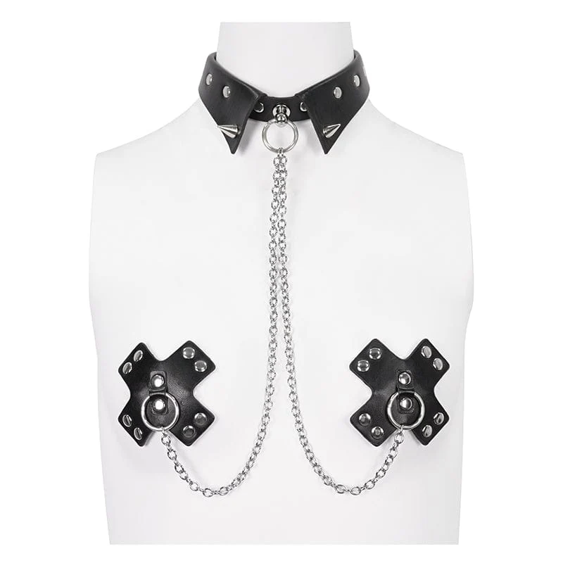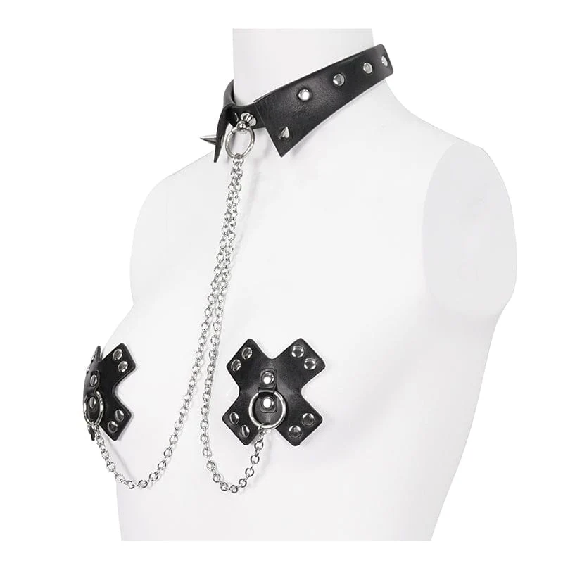 Questo girocollo gotico è con copriseno in ecopelle. Il girocollo è come un colletto rovesciato ed è progettato con borchie. Il girocollo e le coperture del seno sono collegate da una catena. Fibbia sul retro per la regolazione.