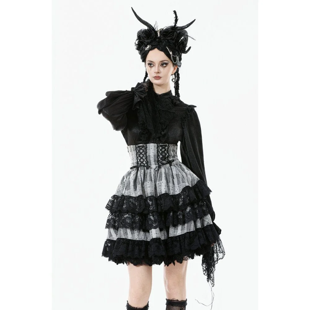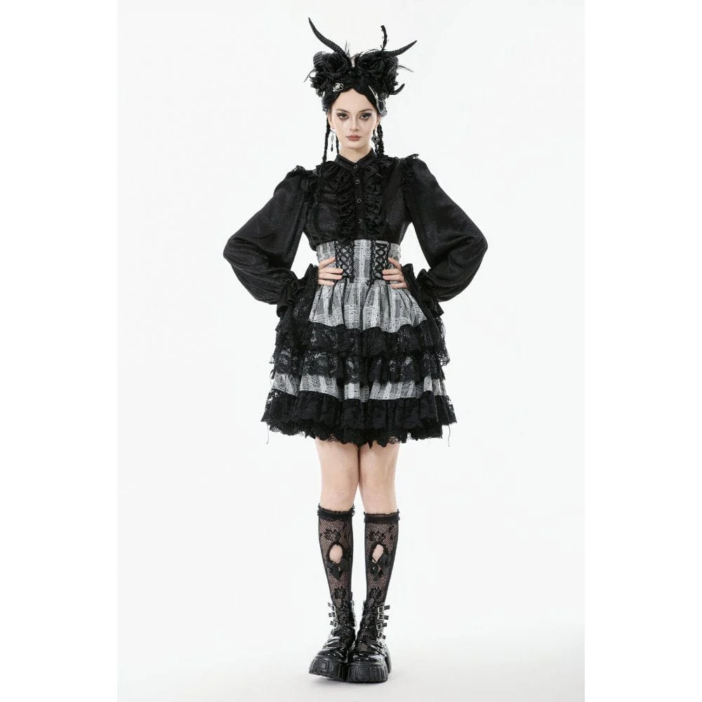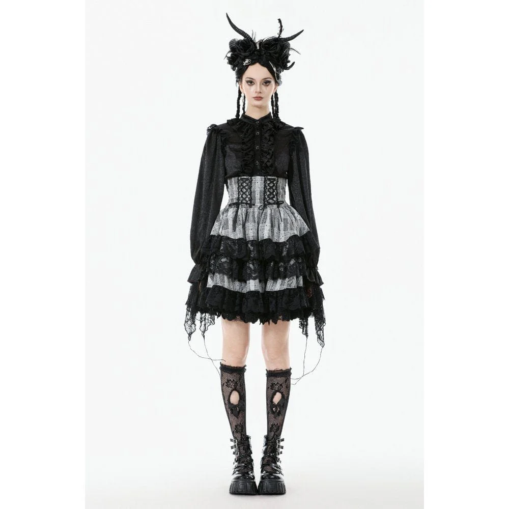Questa gonna Lolita in bianco e nero presenta un design a vita alta con finiture in pizzo e coulisse regolabili in vita. L’orlo a strati è decorato con vari bordi in pizzo, creando una silhouette soffice e a strati. Una cerniera laterale garantisce una facile indossabilità. Classico nel colore e dolce nello stile, è un capo versatile che bilancia dolcezza ed eleganza.