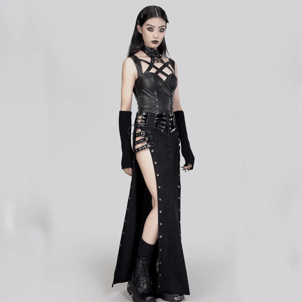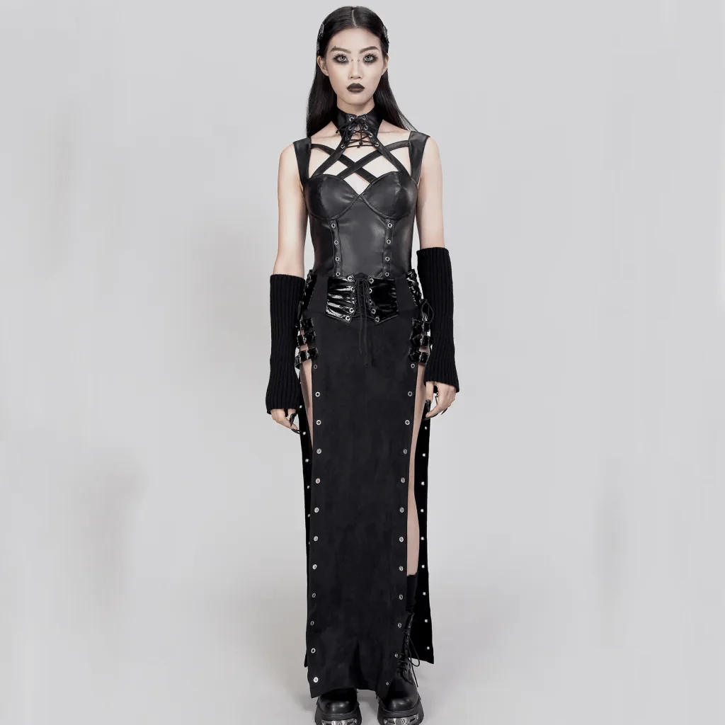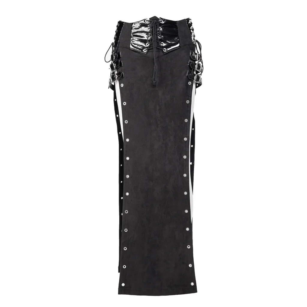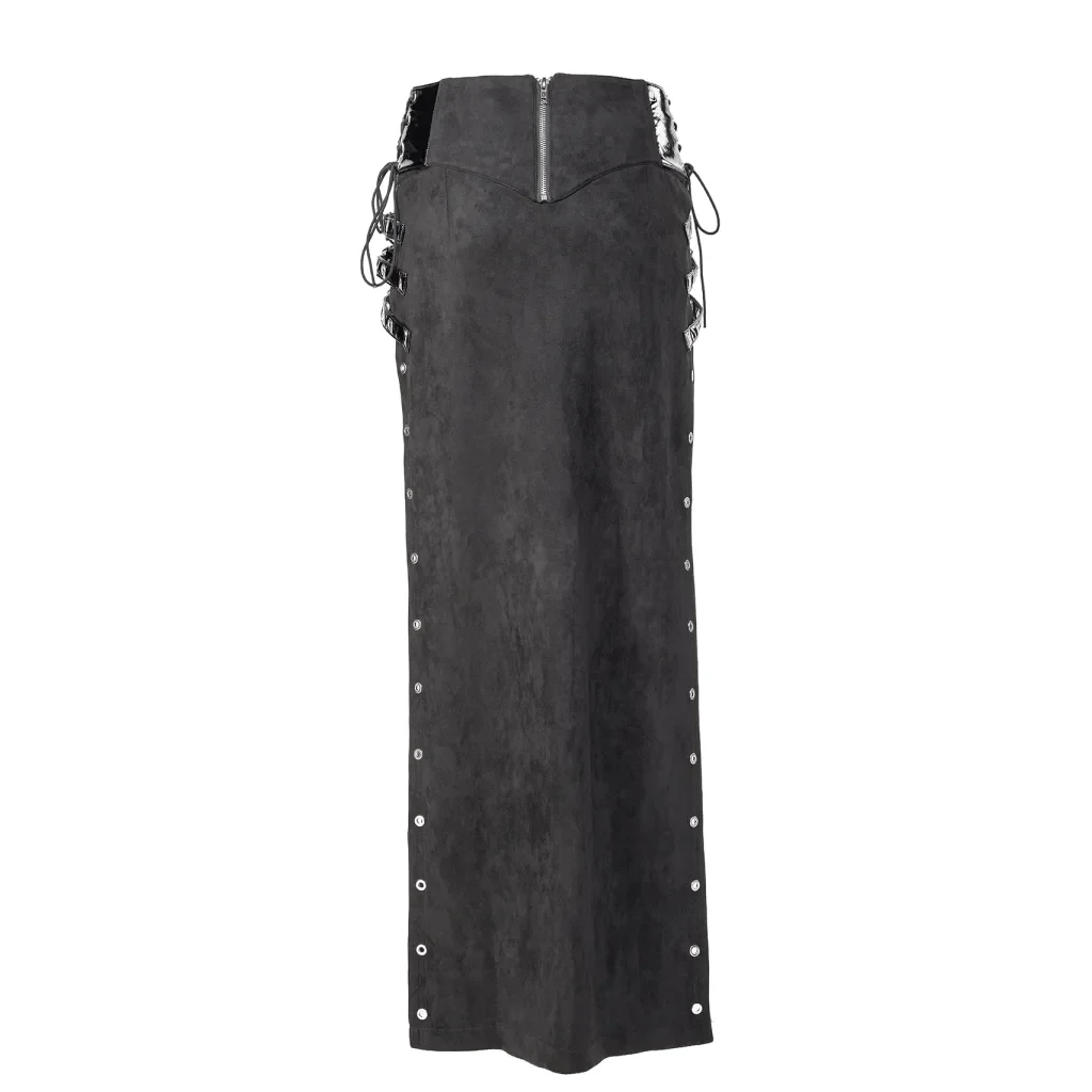 Una gonna lunga gotica con spalline e spalline in finta pelle scamosciata è un capo elegante e spigoloso. Realizzato in finta pelle scamosciata, emana un’atmosfera lussuosa ma ribelle. La gonna presenta spacchi strategici per un tocco di sensualità e movimento, mentre i dettagli con spalline aggiungono un ulteriore livello di intrigo. Con la sua estetica oscura e gotica, questa gonna è perfetta per fare una dichiarazione in varie occasioni, fondendo raffinatezza con un pizzico di stile alternativo