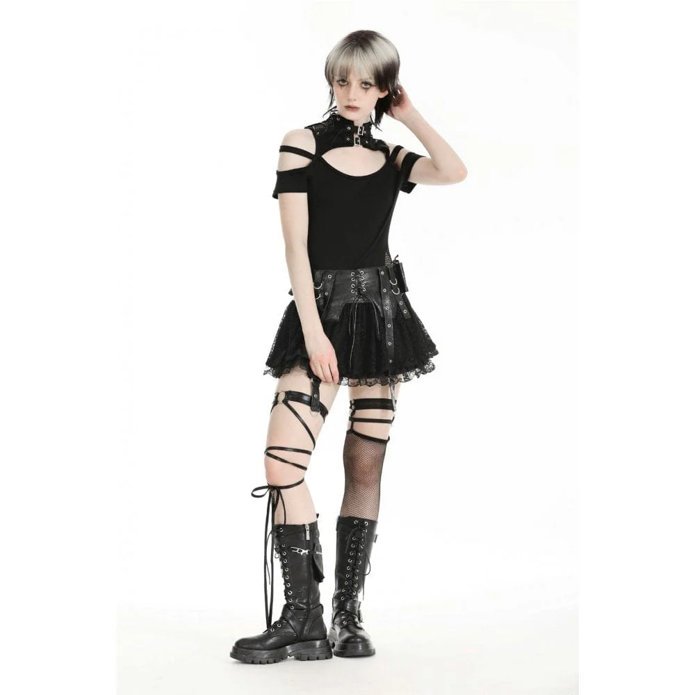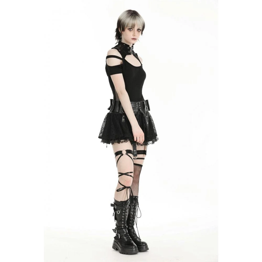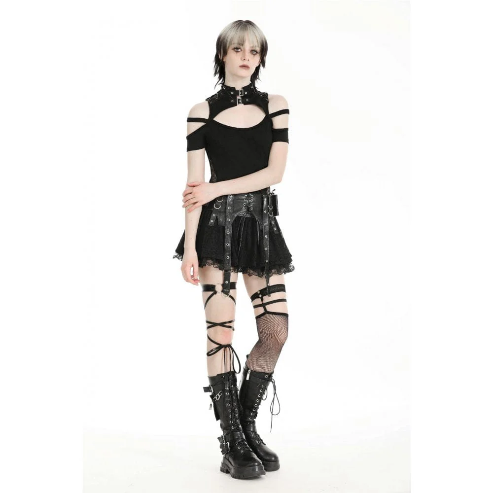 Le cinghie con occhielli in vita fungono da accenti decorativi, esaltando l’atmosfera punk della gonna. Questi cinturini aggiungono un tocco di stile ispirato all’hardware contribuendo al contempo al look spigoloso generale.