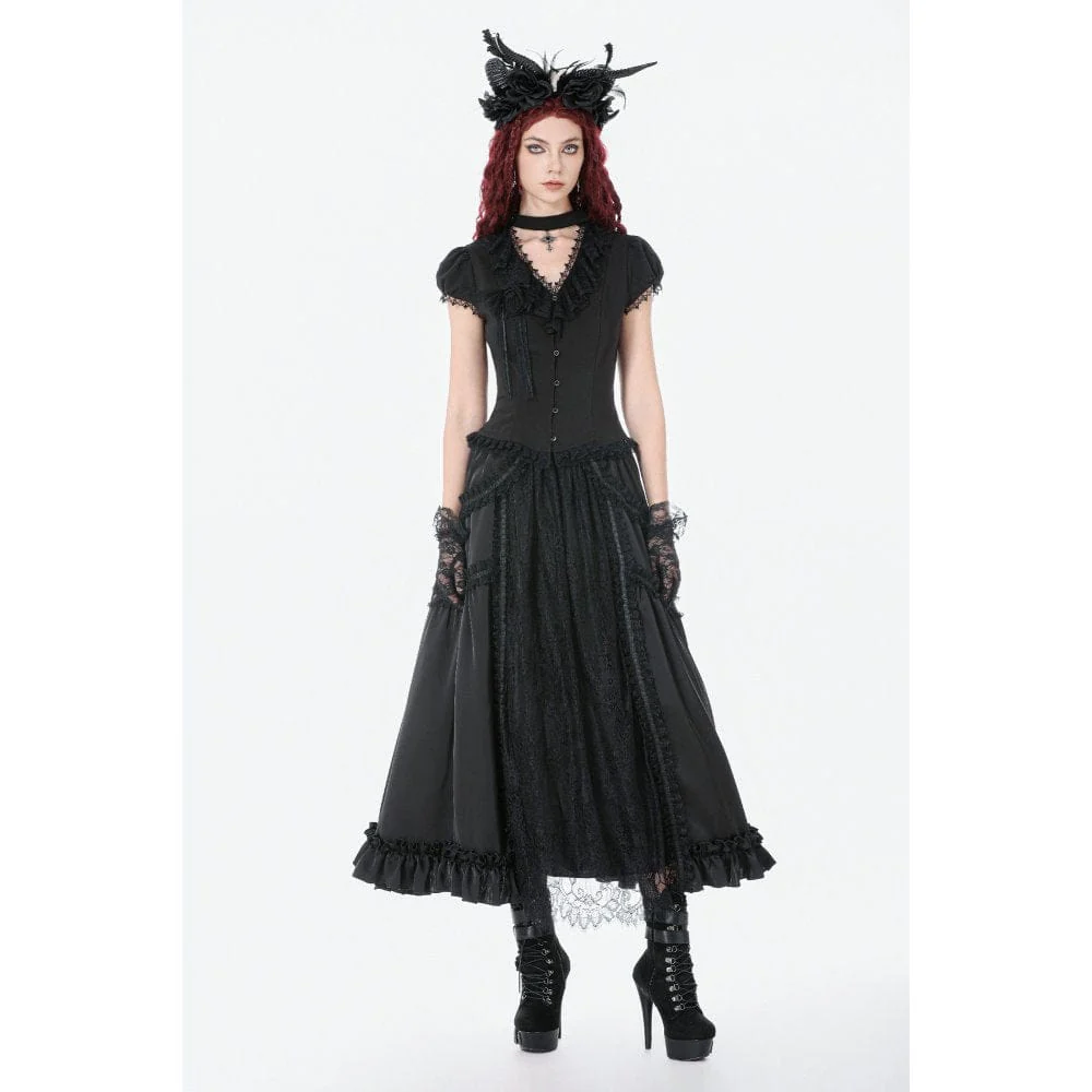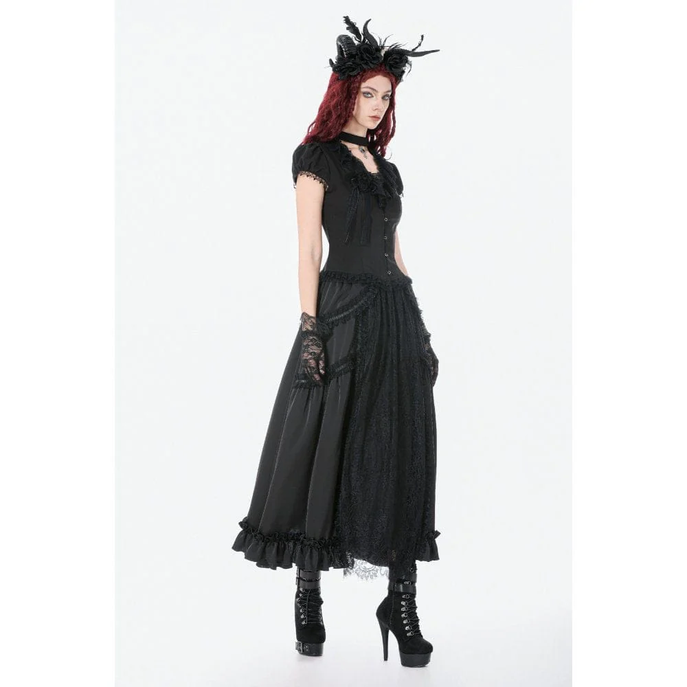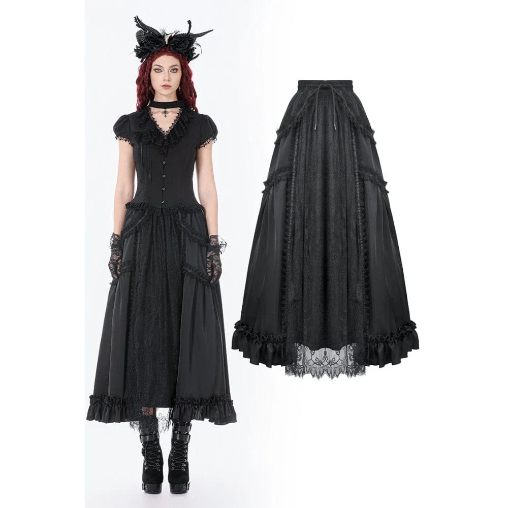 Gonna lunga con balze e arricciature in pizzo gotico da donna, nera