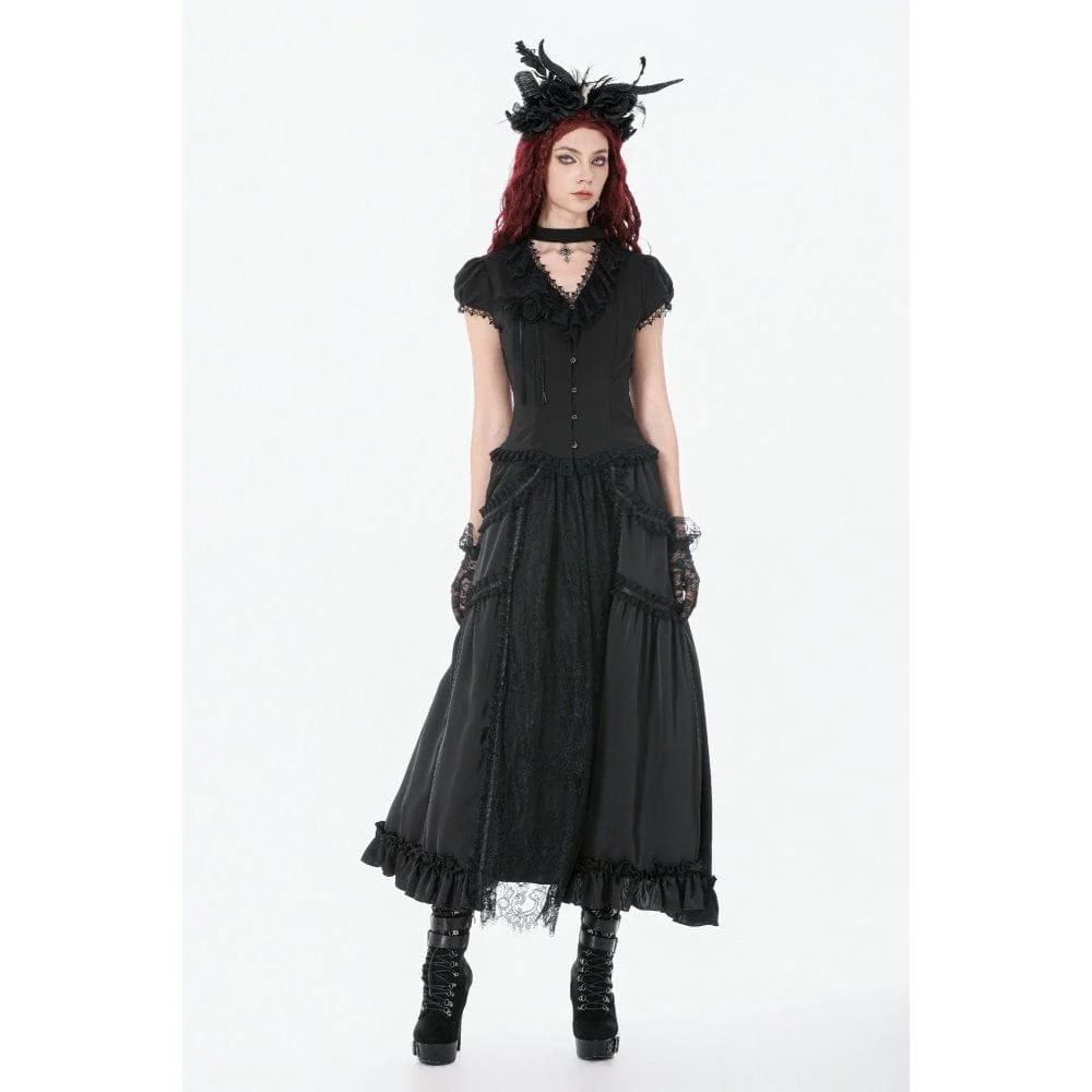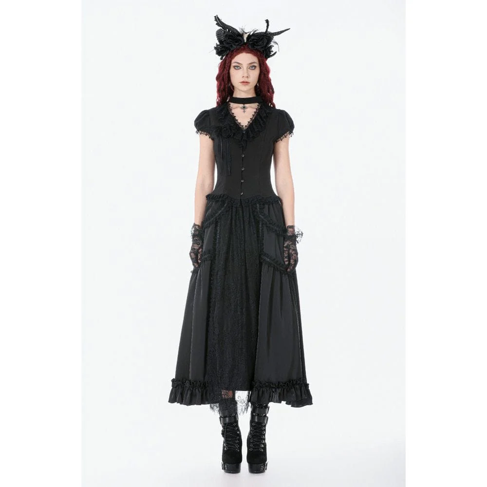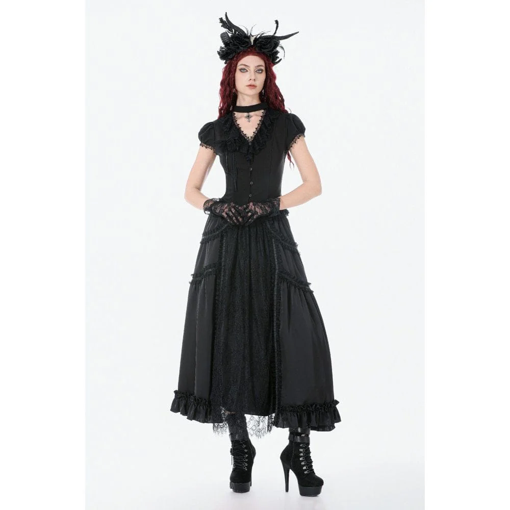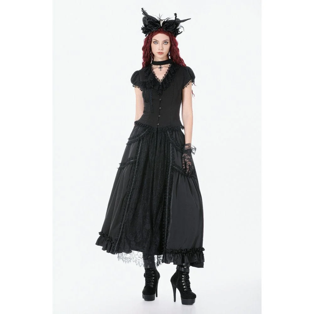 Gonna lunga con balze e arricciature in pizzo gotico da donna, nera