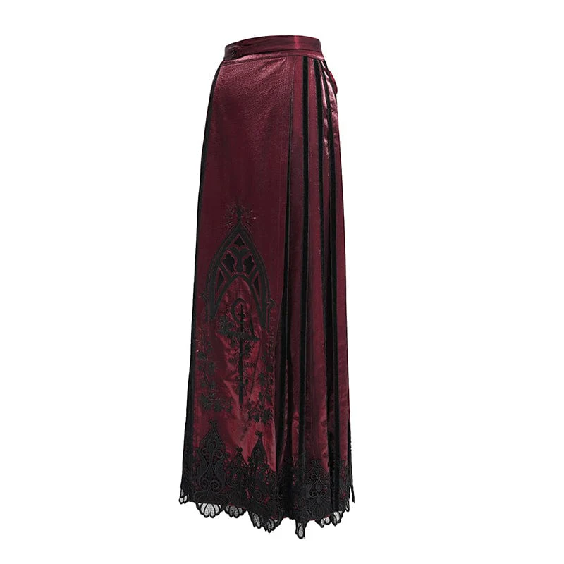 Il sontuoso tessuto rosso vino funge da spettacolare tela per intricati ricami gotici neri: pensate a motivi in pizzo ombrosi e motivi ispirati ad archi che sussurrano un mistero medievale. Abbinatelo a un top in velluto nero stile corsetto e stivaletti a punta, completando il tutto con gioielli a croce in argento antico per sprigionare un’aura regale e ultraterrena, perfetta per una serata gotica.