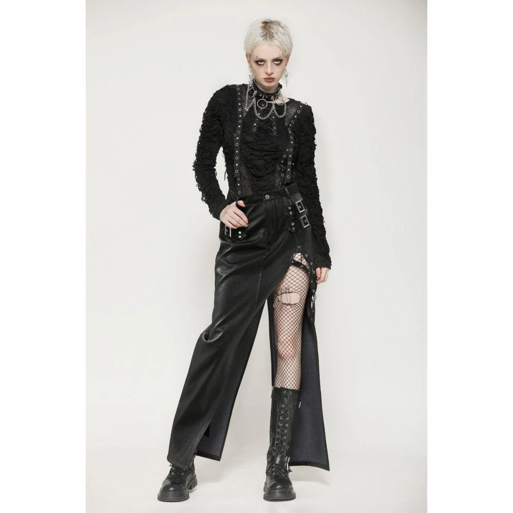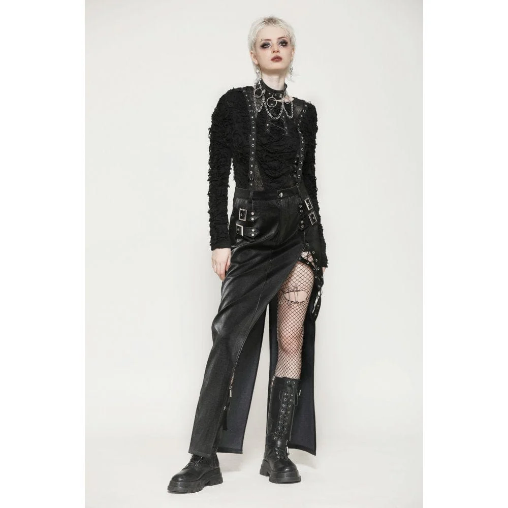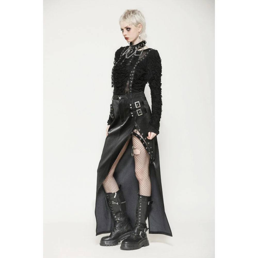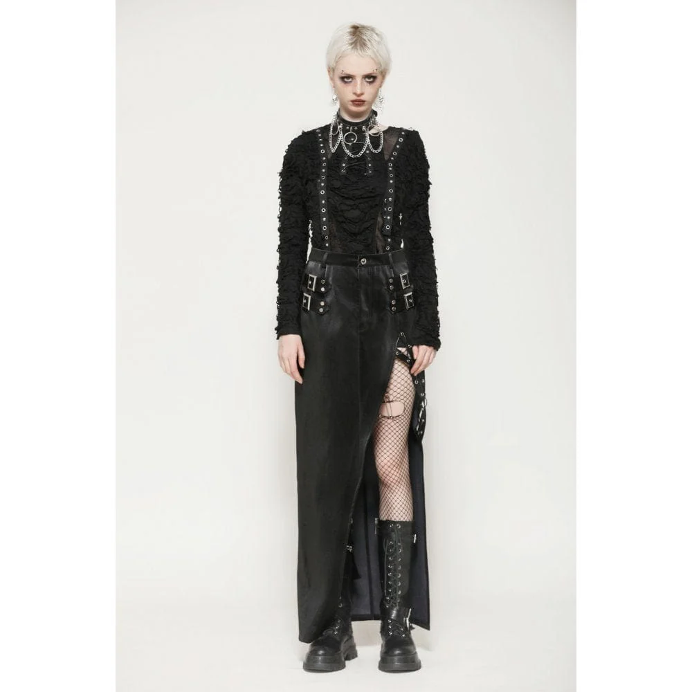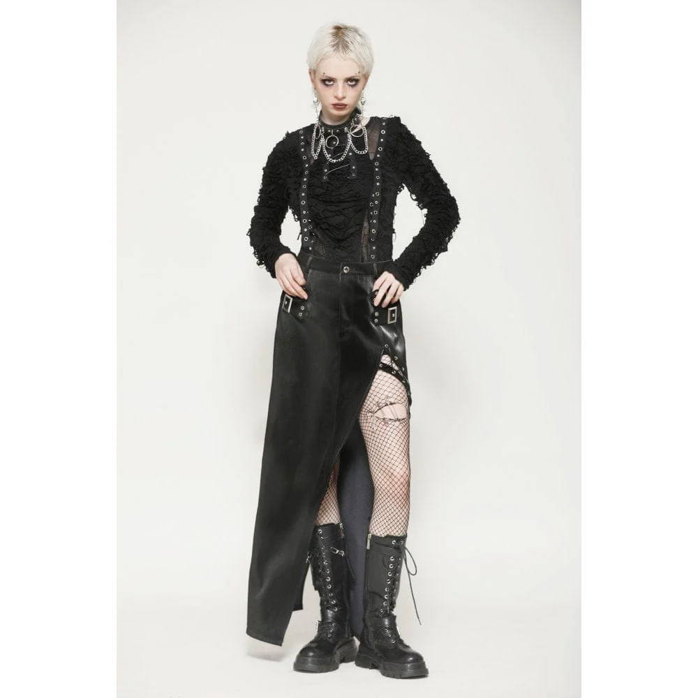 Questa gonna attillata è realizzata in pelle con texture denim, che mostra un tocco e uno stile unici. Le cinghie metalliche su entrambi i lati aggiungono un tocco di personalità e audacia, evidenziando perfettamente la silhouette alla moda. Il design con spacco profondo sull’orlo non solo esalta la sensualità, ma eleva anche l’aspetto generale con dettagli di allacciatura a occhiello. Questa gonna è perfetta per gli outfit quotidiani in stile punk, consentendoti di esprimere ribellione e individualità nella moda.