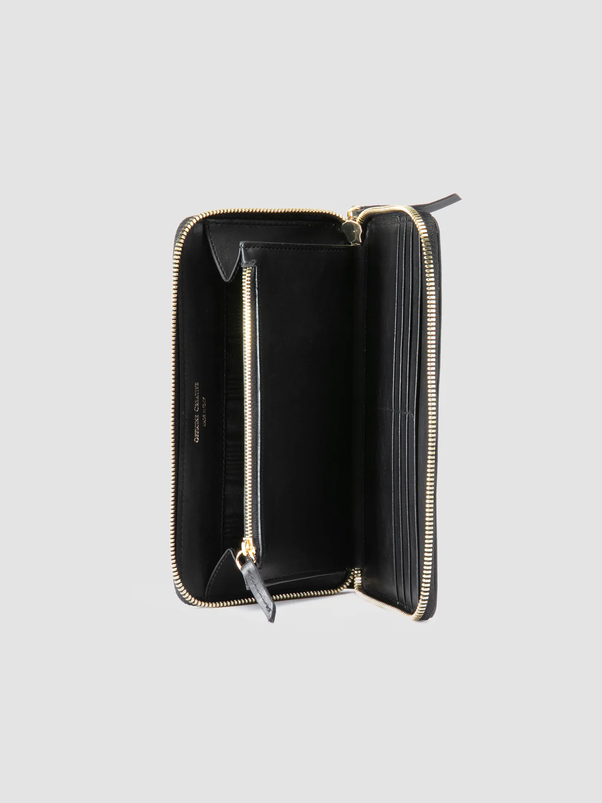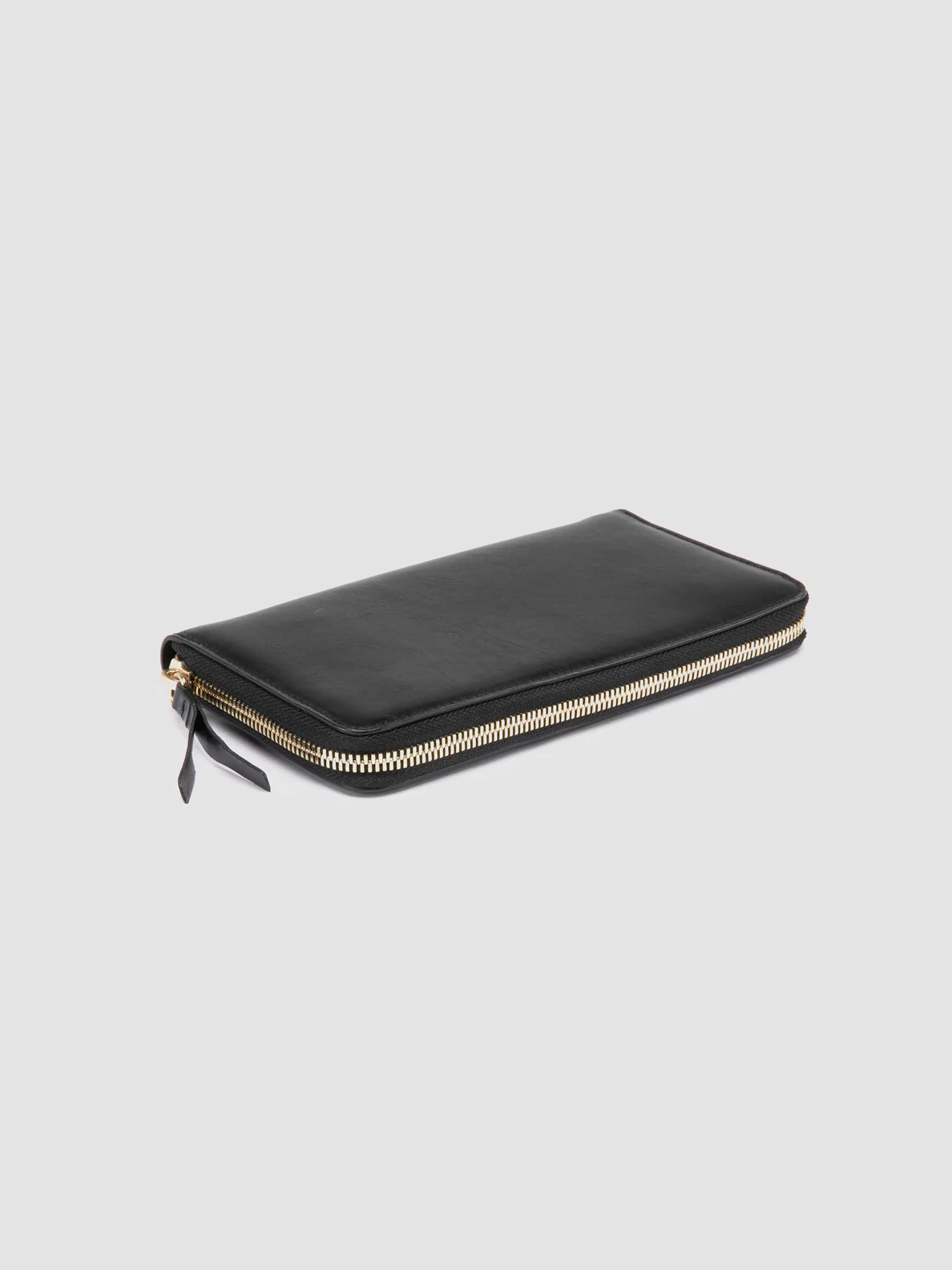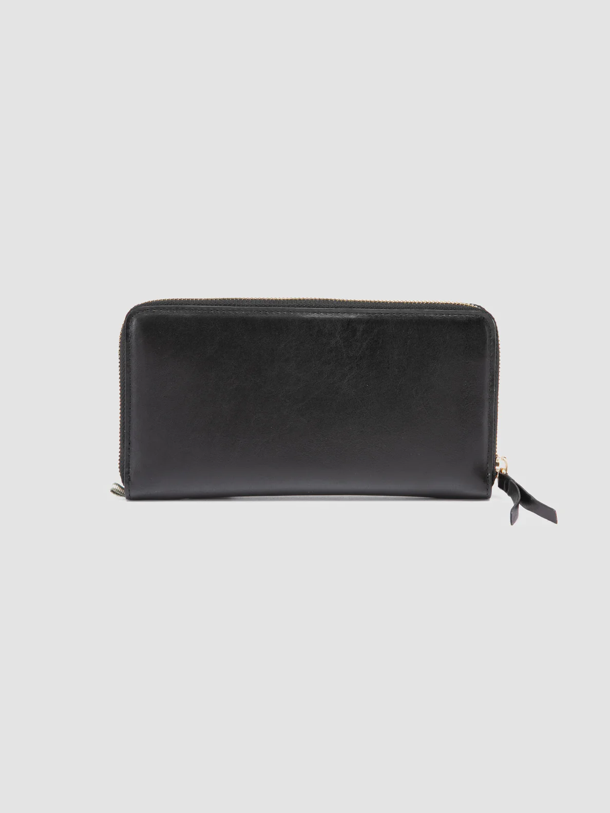 Il nostro portafoglio Juliet riesce a coniugare linee classiche e praticità. Realizzato a mano in pregiata pelle nera, presenta il nostro elegante logo a caratteri color oro stampato sul davanti, una zip a chiusura completa, una tasca interna con zip, uno scomparto aperto e numerosi scomparti porta carte.