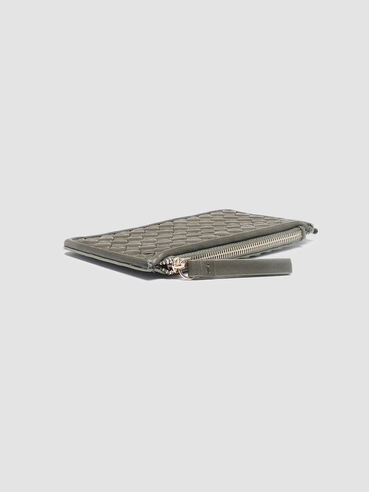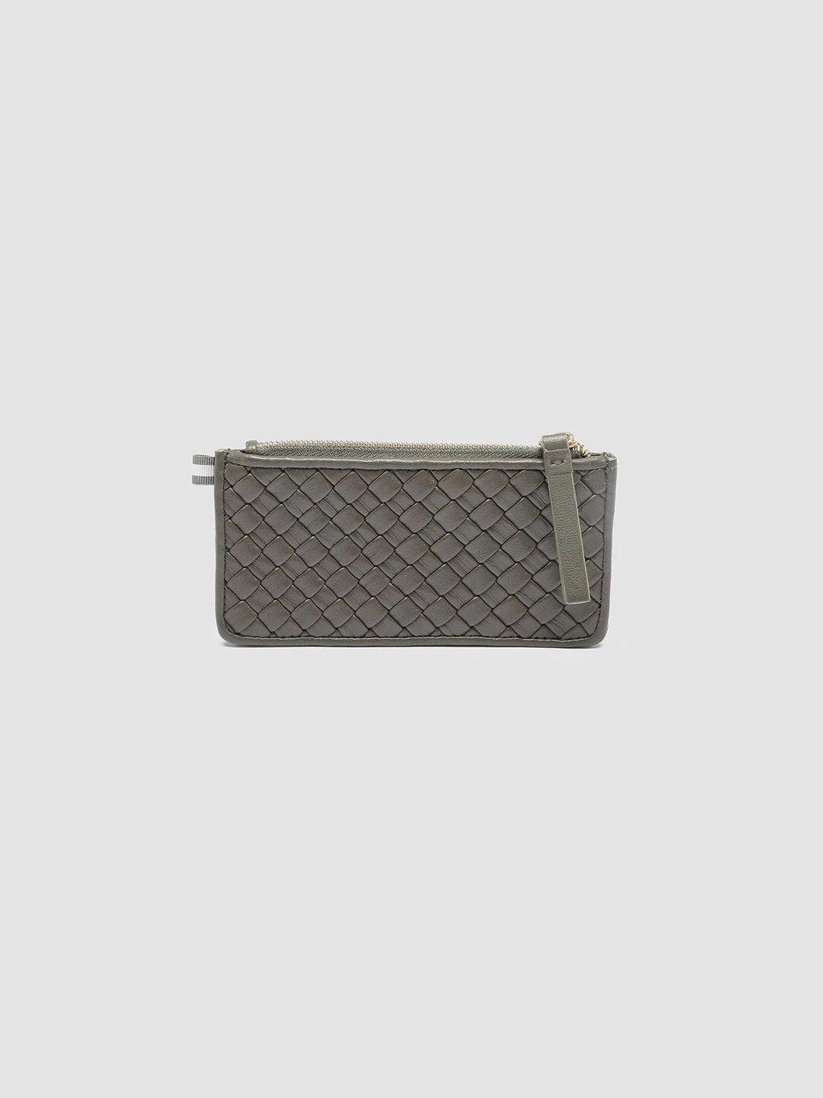 Realizzato interamente a mano nei nostri laboratori, il nostro portacarte Juliet si distingue per il motivo intrecciato in pregiata pelle color kaki. Presenta uno scomparto con chiusura a zip in galvanica oro, sei scomparti porta carte, la stampa del nostro logo a caratteri sul davanti e l’inconfondibile fettuccia in gros-grain sul lato.