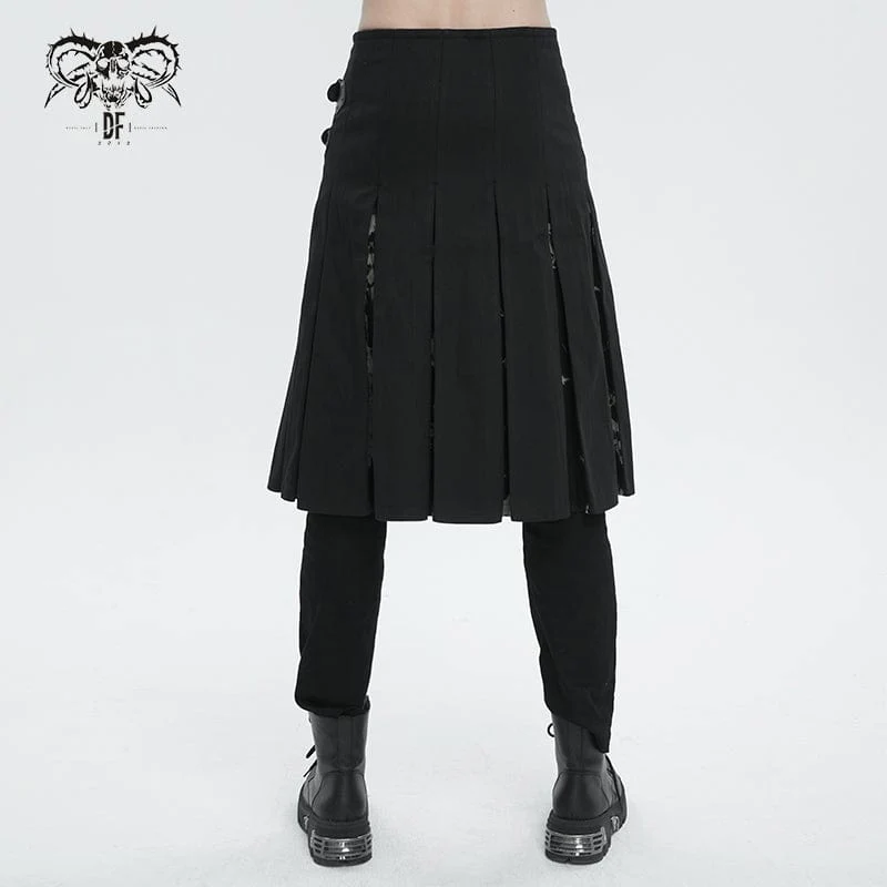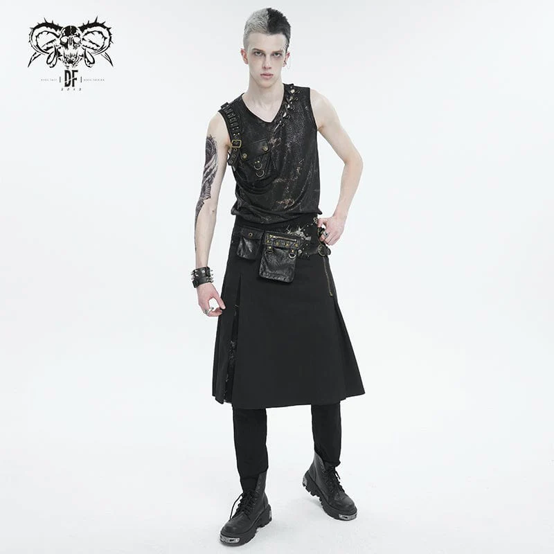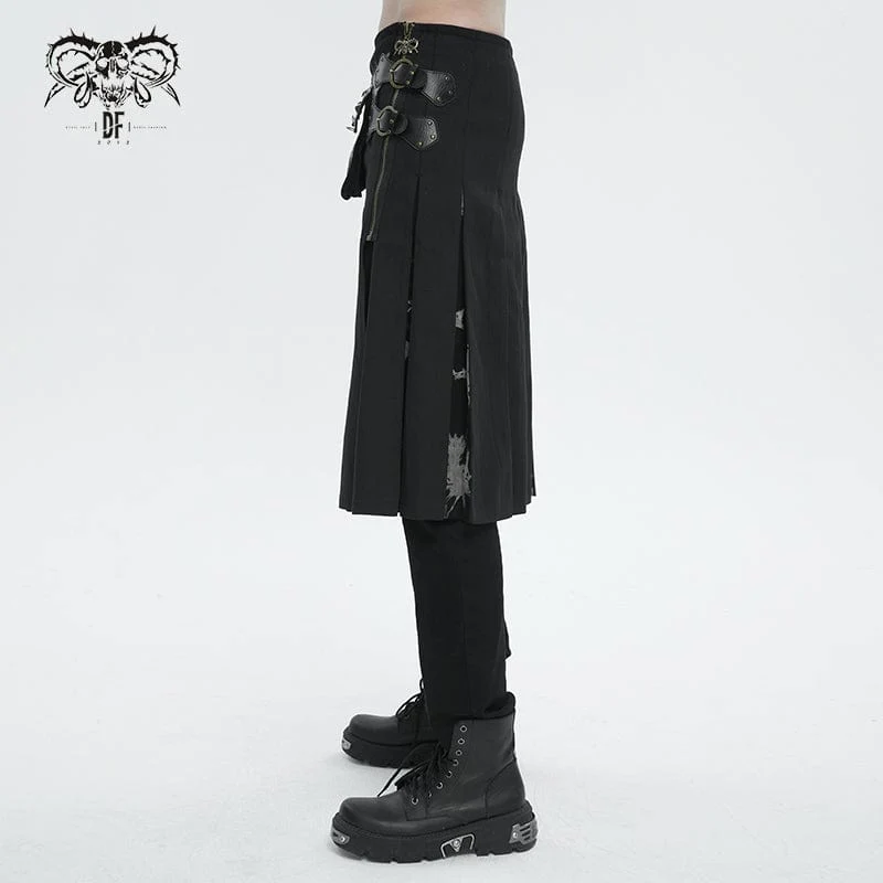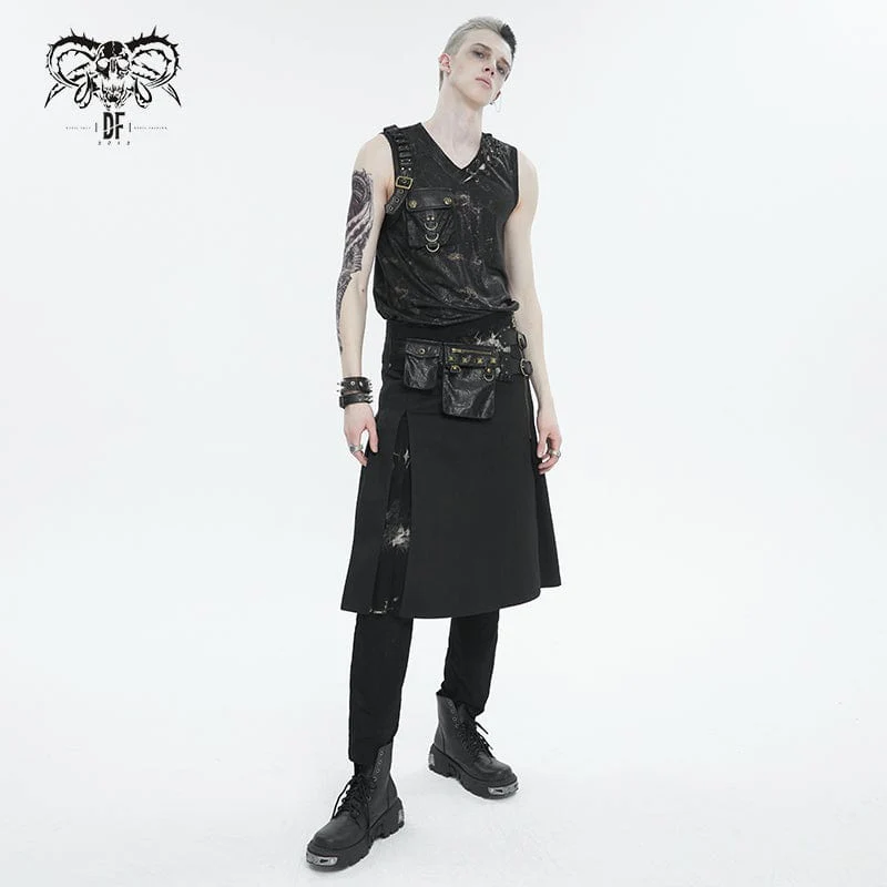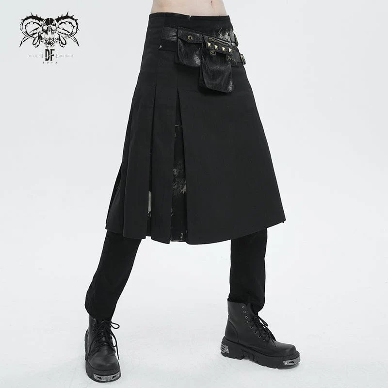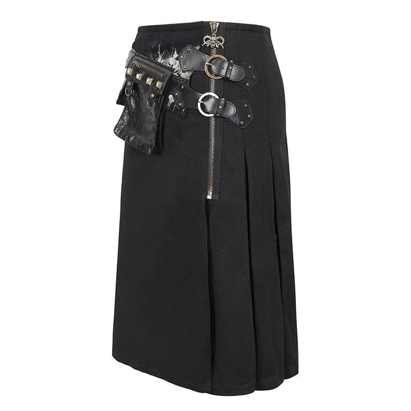 Questa gonna gotica è patchwork con due marsupi borchiati. Fibbie a doppio strato e cerniera a teschio sul lato sinistro. Spacco sui lati e sul retro. Sagoma a trapezio.