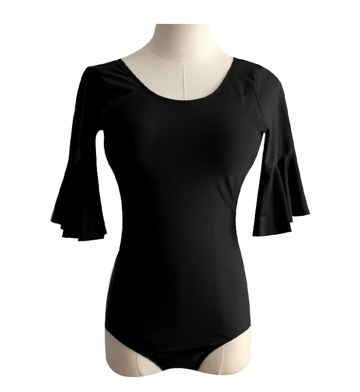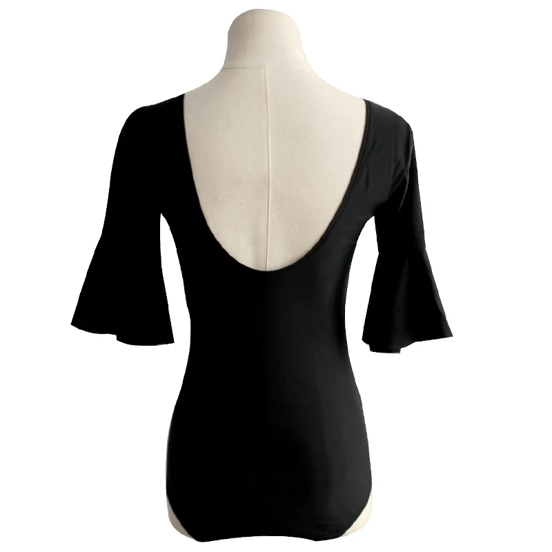 Questo bellissimo body da bagno presenta una scollatura sulla schiena e una fmaniche a campana 3 / 4 che aggiungono un tocco di drammaticità.