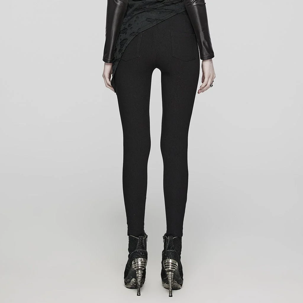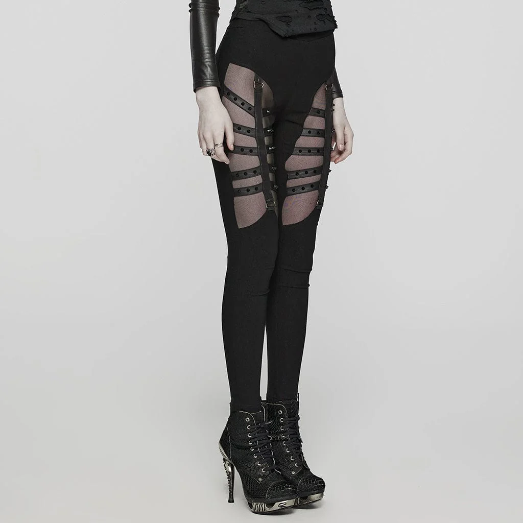I leggings fantastici e distintivi sono realizzati in tessuto twill elastico e tessuto a rete. Lo spacco sexy con rete e borchie selvagge a spirale rappresenta lo spirito rock e punk. Silhouette aderente e buon tessuto elastico.
