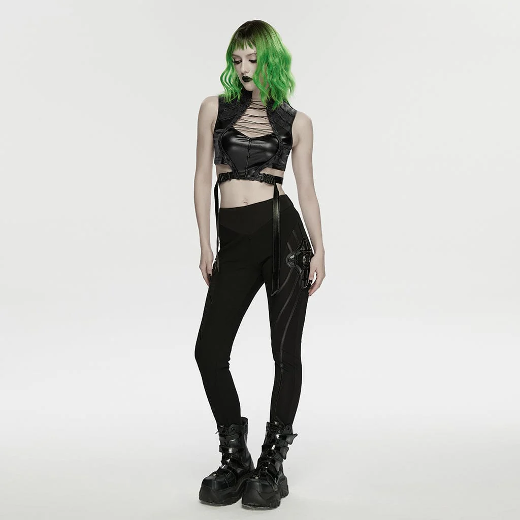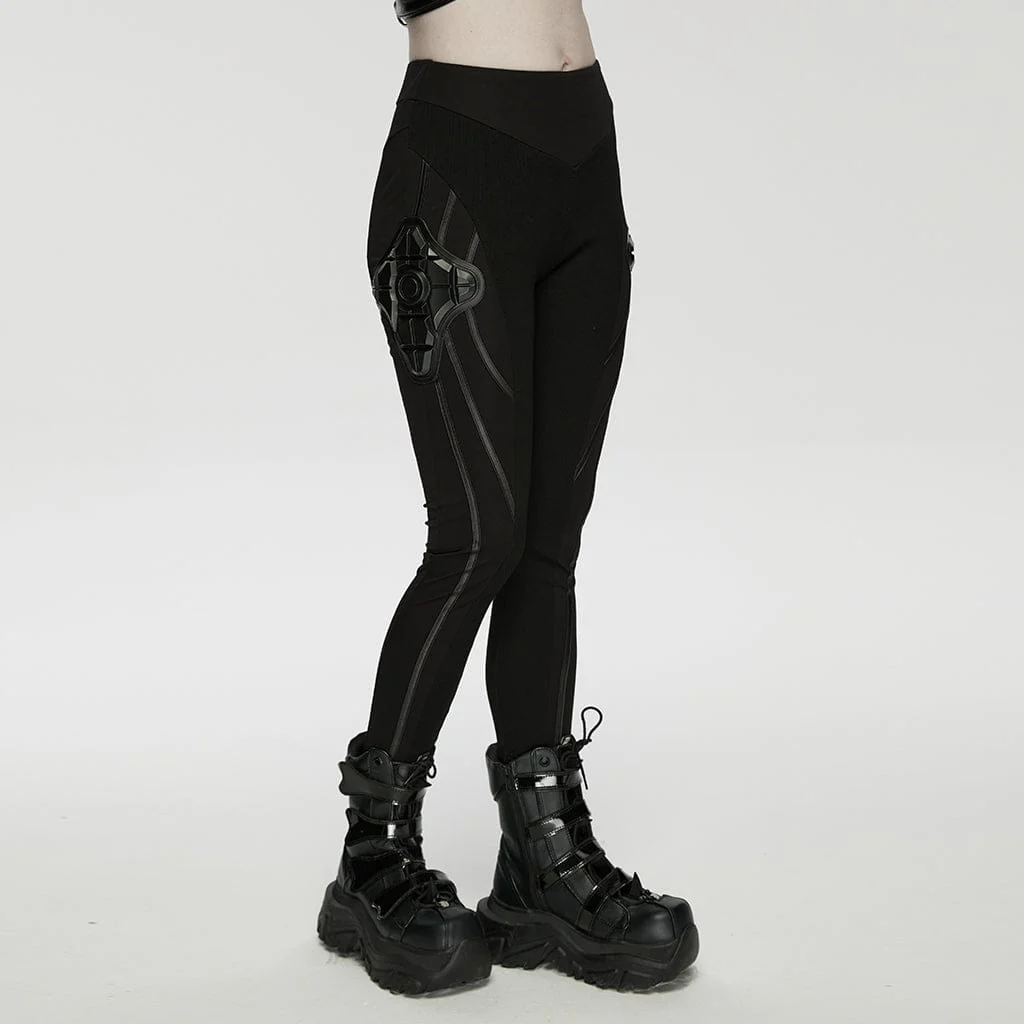 Immergiti nel futuristico mondo del cyberpunk con questi leggings da donna con pannelli e dettagli in stile armatura cyberpunk, un capo che fonde il fascino punk goth con un tocco strutturato in stile steampunk. Realizzati in un mix elasticizzato di poliammide ed elastan, vantano una silhouette aderente che abbraccia le curve, impreziosita da dettagli audaci: pannelli angolari in similpelle avvolgono le gambe, mentre dettagli geometrici in stile armatura aggiungono la grinta grezza del punk rock.