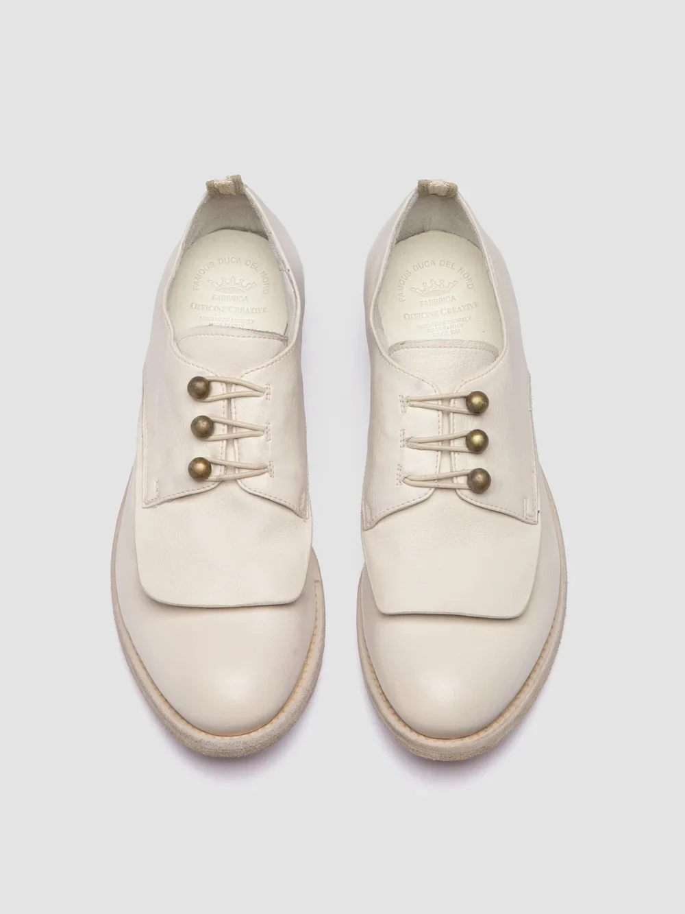 Le scarpe derby Lexikon 554 sono realizzate a mano in pelle bianca pregiata. Caratterizzate da linee delicatamente asimmetriche, presentano occhielli in metallo anticato, un dettaglio con linguetta ripiegata e una suola in cuoio a strati con inserto in gomma. CODICE: LEXIKON/554 IGNIS T. NEBBIA