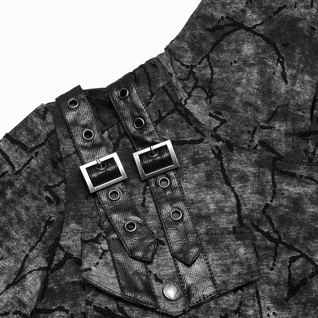La silhouette aderente di questa t-shirt avvolge il corpo, esaltandone le forme e garantendo una vestibilità comoda ed elastica grazie al tessuto elastico di alta qualità. L’elemento di design che spicca è l’ampia tasca in similpelle sul petto, impreziosita da eleganti cinturini con fibbia e chiusure a scatto in metallo. Questi pratici dettagli esaltano l’atmosfera punk, offrendo al contempo ulteriore praticità e personalizzazione.
