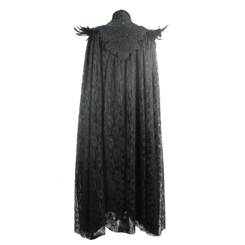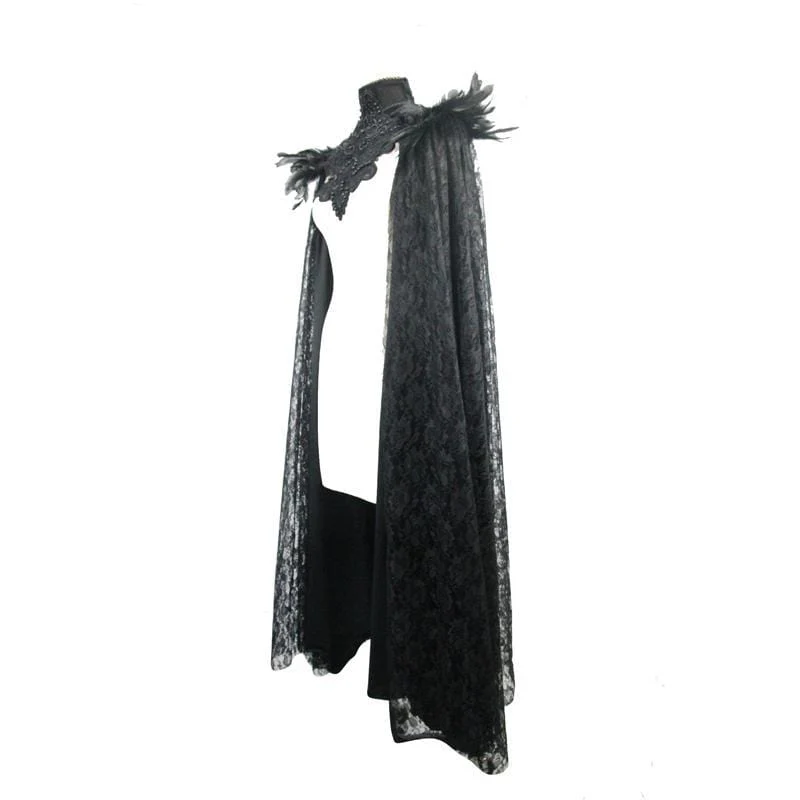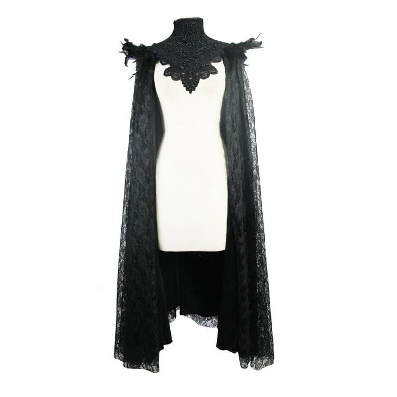 Descrizione: Ecco un capo perfetto per completare il tuo look gotico. Questo mantello è progettato per soddisfare anche il più particolare dei Goti con la sua sovrapposizione di pizzo e lo straordinario elemento ricamato che copre il torace e il collo. Il mantello presenta rifiniture piumate intorno alla spalla che esaltano il fascino gotico del capo.