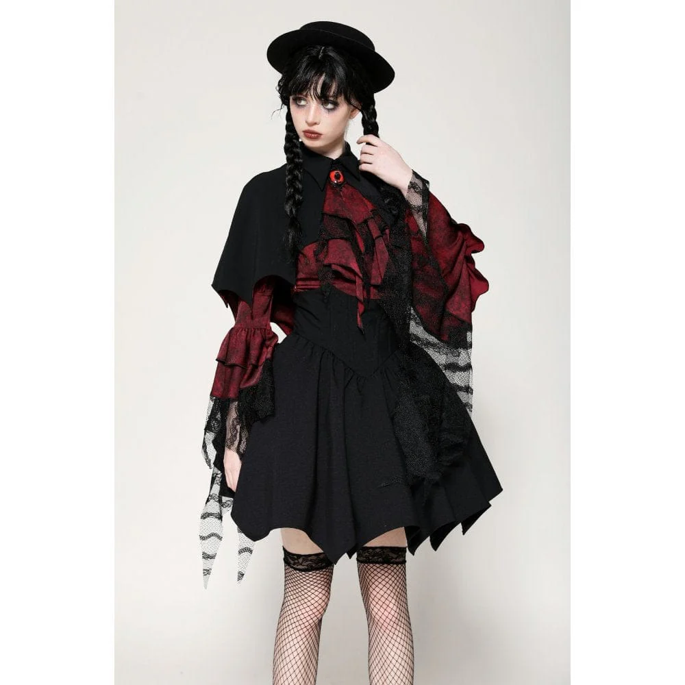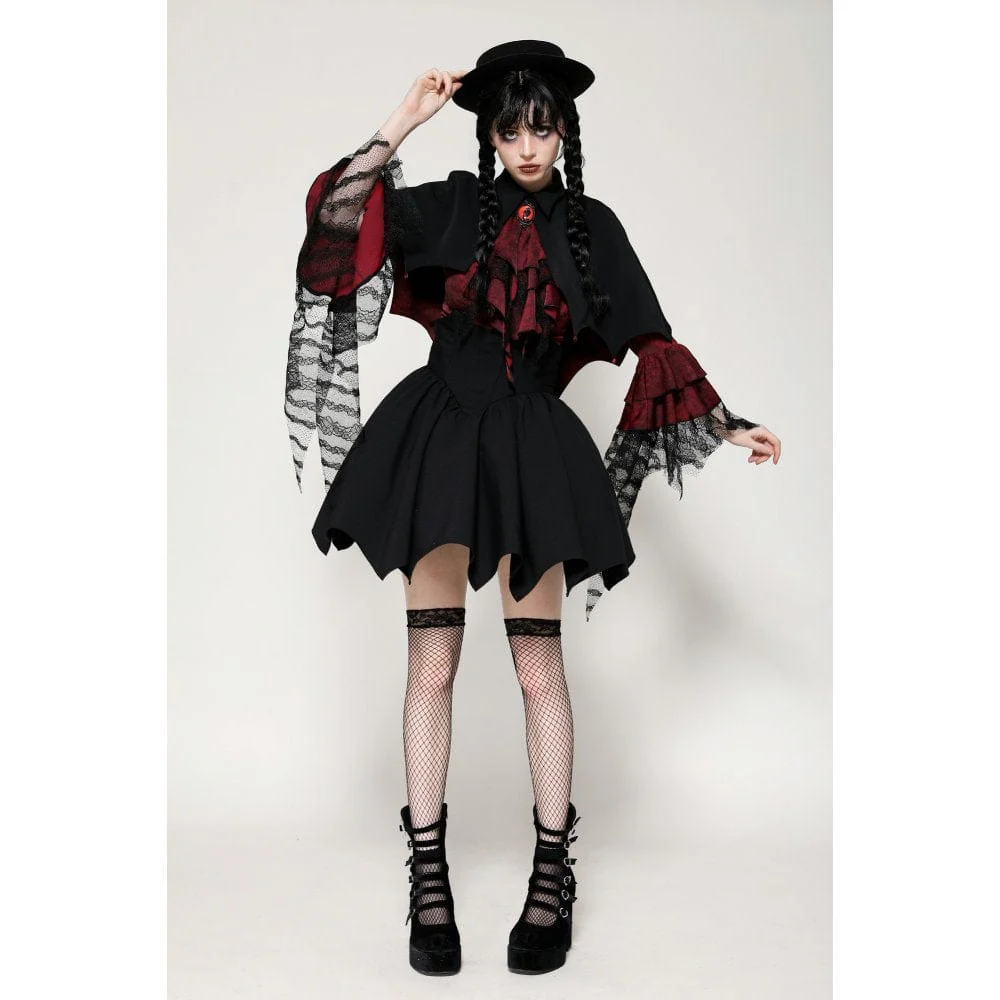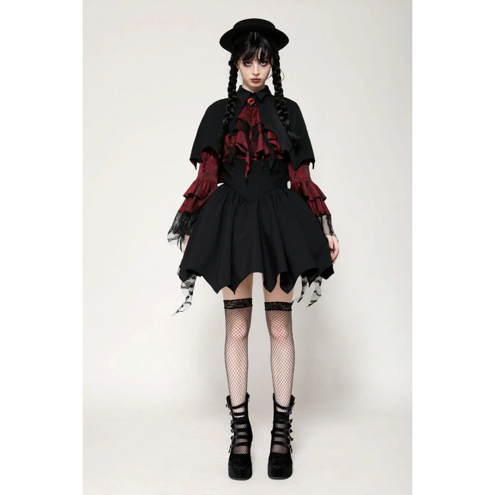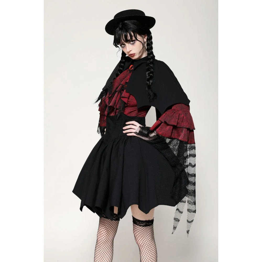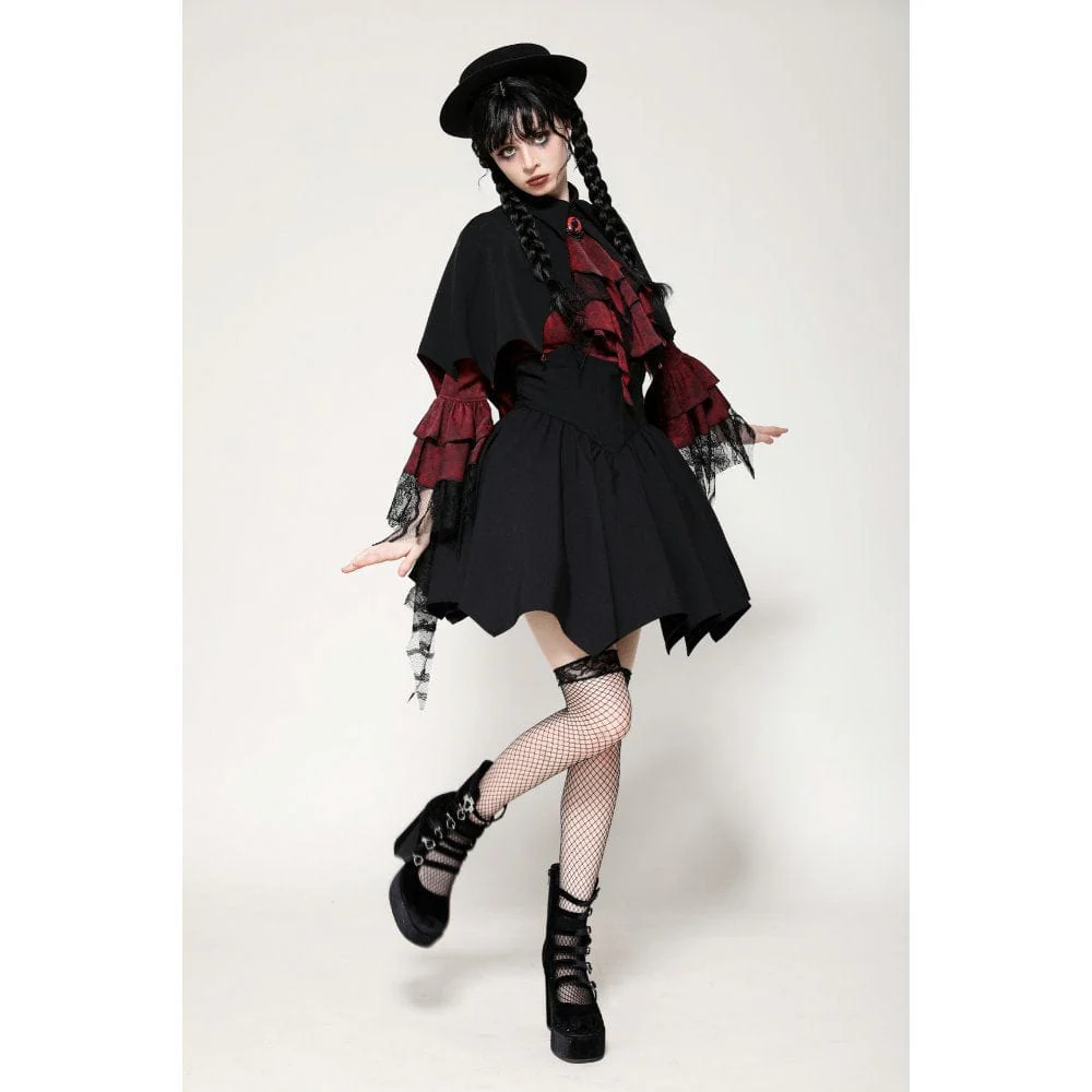 Questo mantello ispirato ai vampiri presenta un sorprendente contrasto tra il tessuto esterno nero e la fodera rossa, incarnando sia il mistero che il lusso. Il design alto-basso aggiunge profondità e strati al pezzo. L’orlo a forma di pipistrello è una dichiarazione audace, ulteriormente esaltata dalle perline a forma di goccia che pendono dalle estremità, che ricordano il sangue che gocciola, aggiungendo un fascino inquietante ma accattivante.