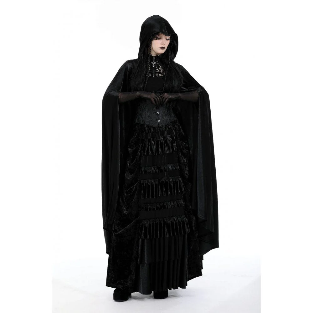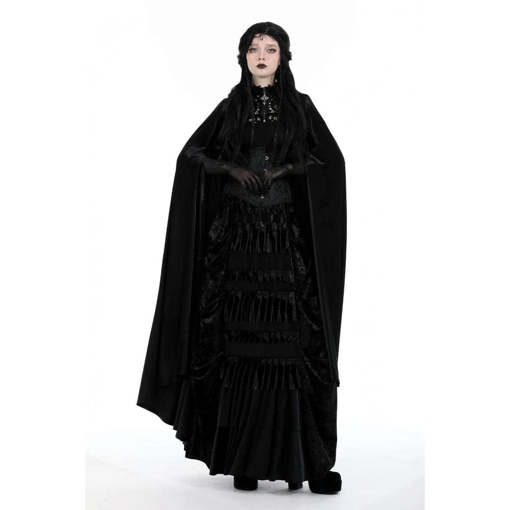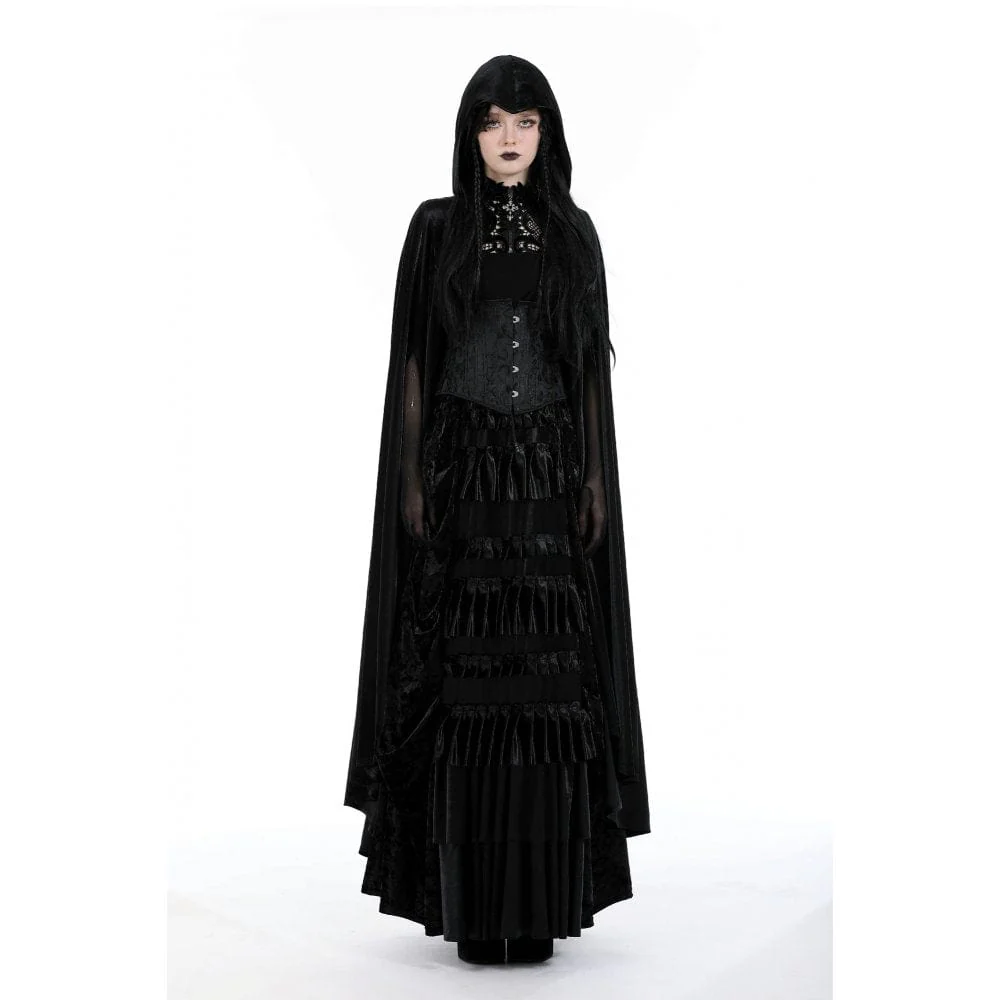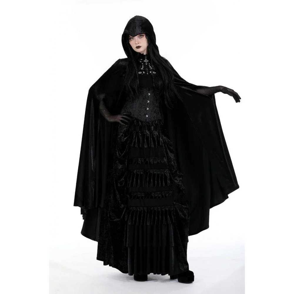 Questo mantello gotico è realizzato in tessuto di velluto. Ha un cappuccio e un design alto-basso. Ricami floreali sullo scollo. Una cerniera trasversale in rilievo per la chiusura. La silhouette aderente e l’assenza di tessuto elastico.