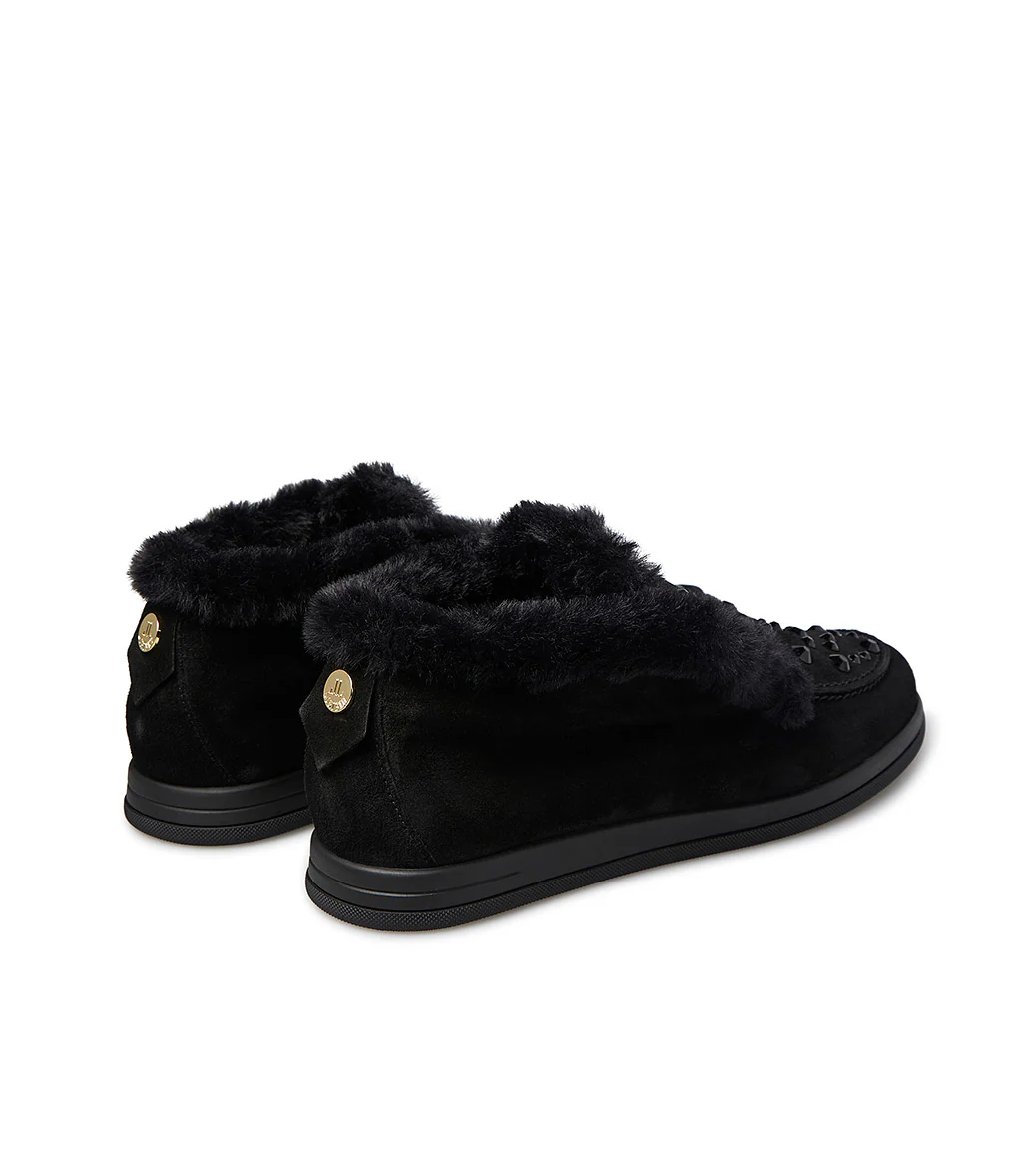 Realizzati in Italia in morbida pelle scamosciata nera, i nostri mocassini sono foderati e rifiniti in calda eco pelliccia tone-on tone e personalizzati dai luminosi cristalli applicati sulla tomaia. Poggiano su di una suola in gomma flat e rivelano una punta a mandorla arrotondata. Perfetti da indossare durante le giornate più fredde della stagione.