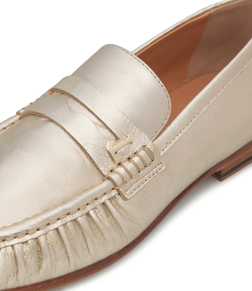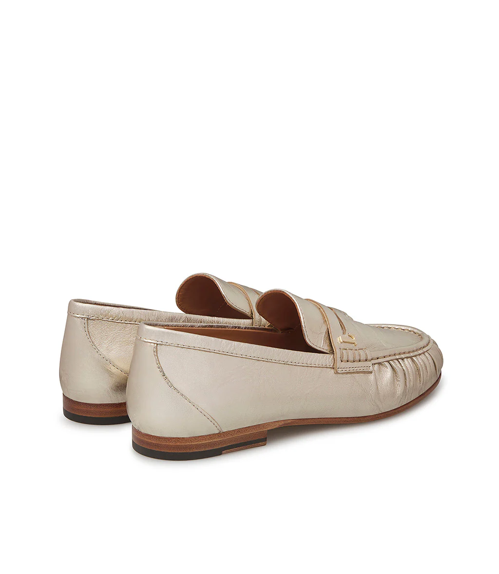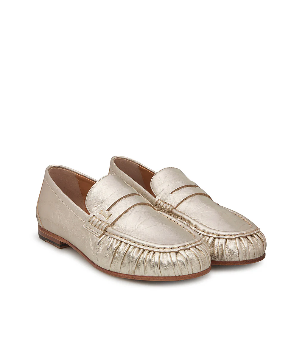 Realizzati in Italia. I nostri mocassini in nappa platino, presentano una silhouette impeccabile e senza tempo. Poggiano su di una suola in cuoio e rivelano una punta arrotondata dalla linea arricciata sottolineata dalla cucitura in rilievo. Ideale per l’outfit giornaliero.