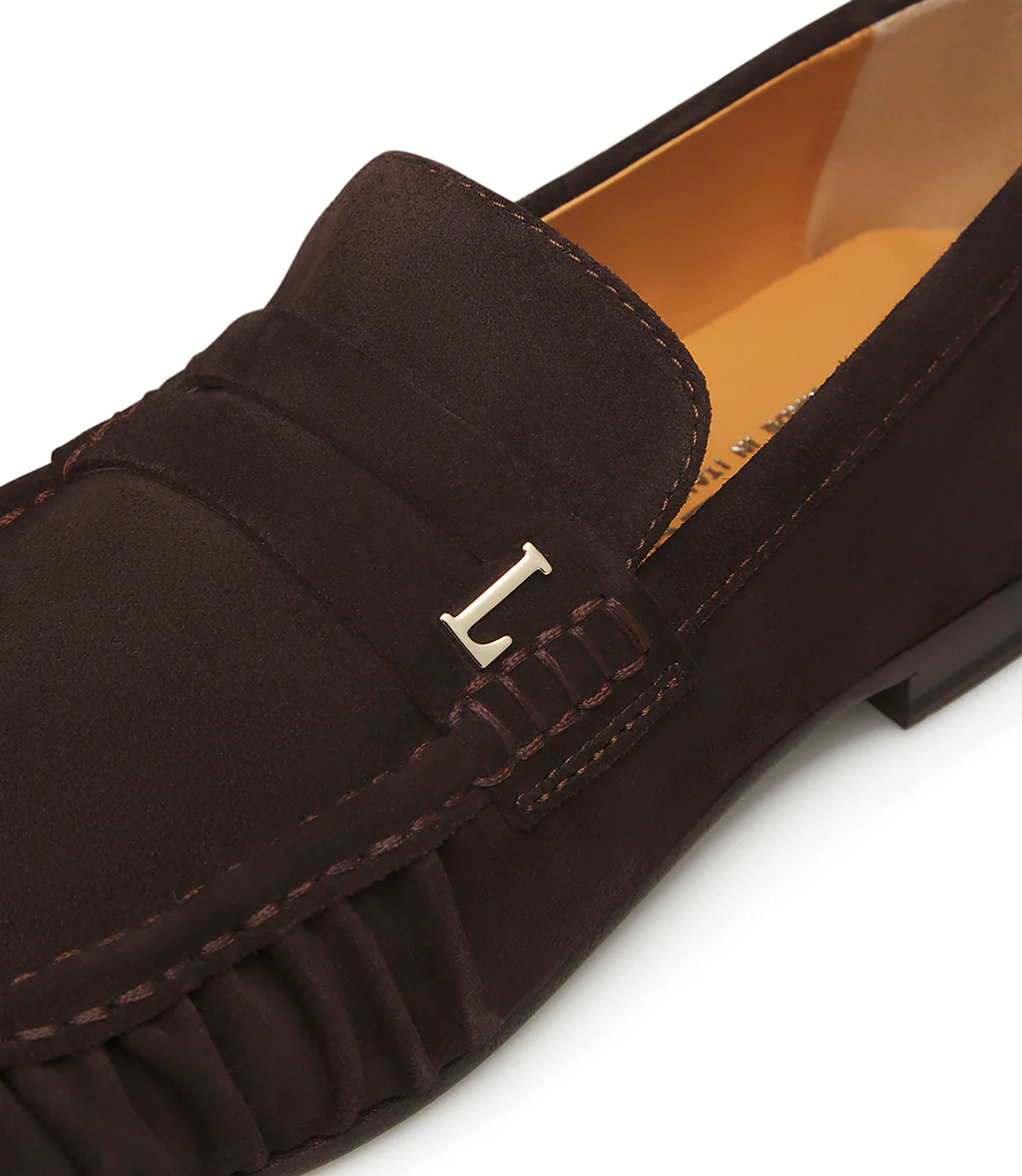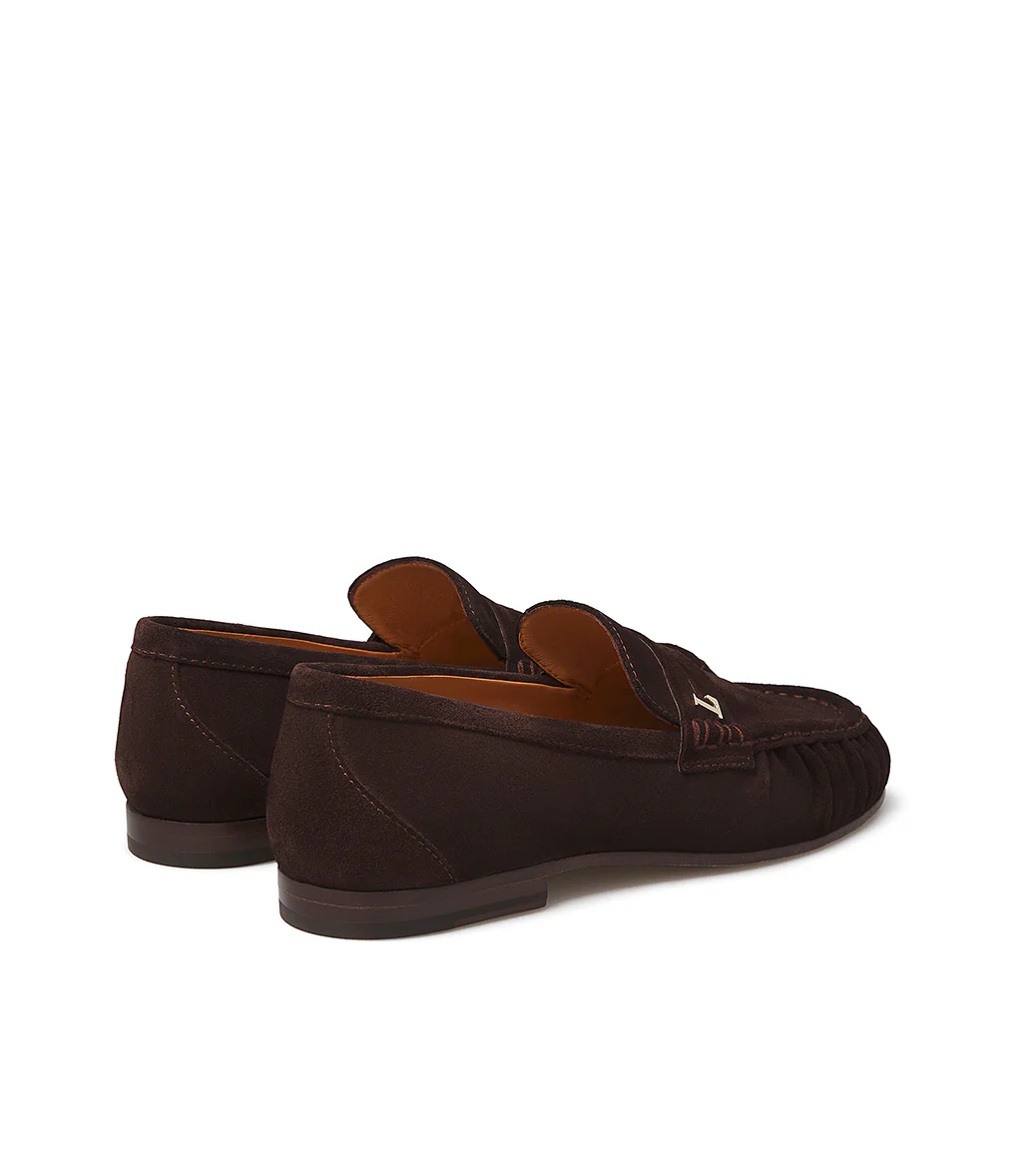 Realizzati in Italia in pregiato camoscio moro, i nostri confortevoli mocassini presentano una silhouette impeccabile e senza tempo. Poggiano su di una suola in cuoio e rivelano una punta arrotondata dalla linea arricciata sottolineata dalla cucitura in rilievo. Ideale per l’outfit giornaliero.