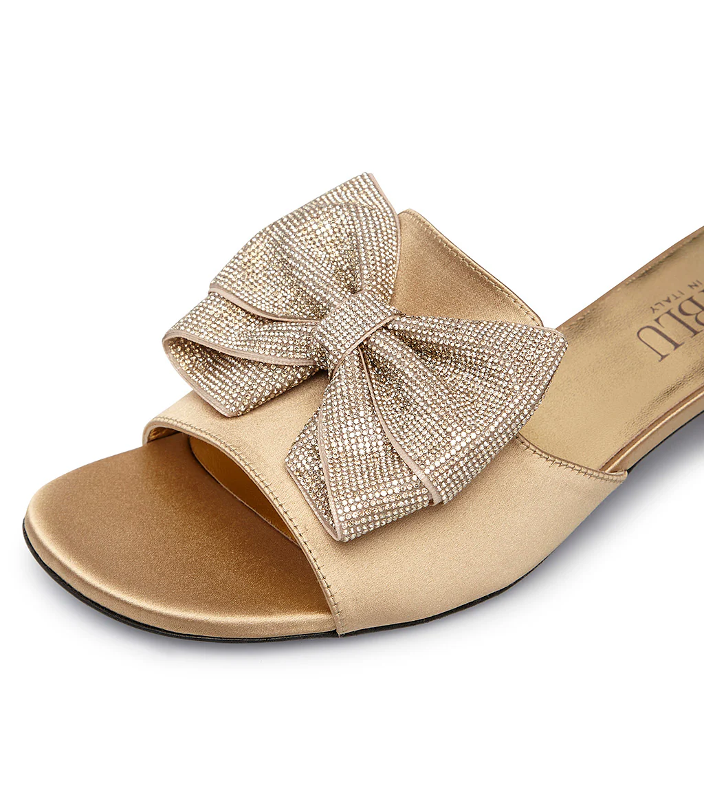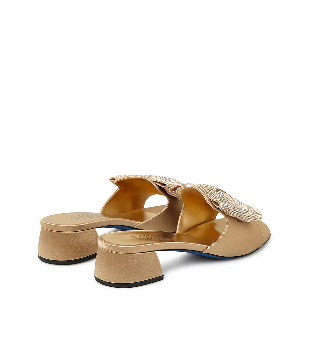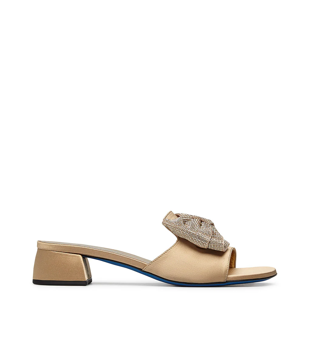 Realizzate in Italia, le nostre mules in raso oro spiccano per lo scintillante fiocco impreziosito da micro cristalli, il tacco a blocco leggermente svasato e la nostra iconica suola in cuoio blu completano questo modello dall’eleganza senza tempo.
