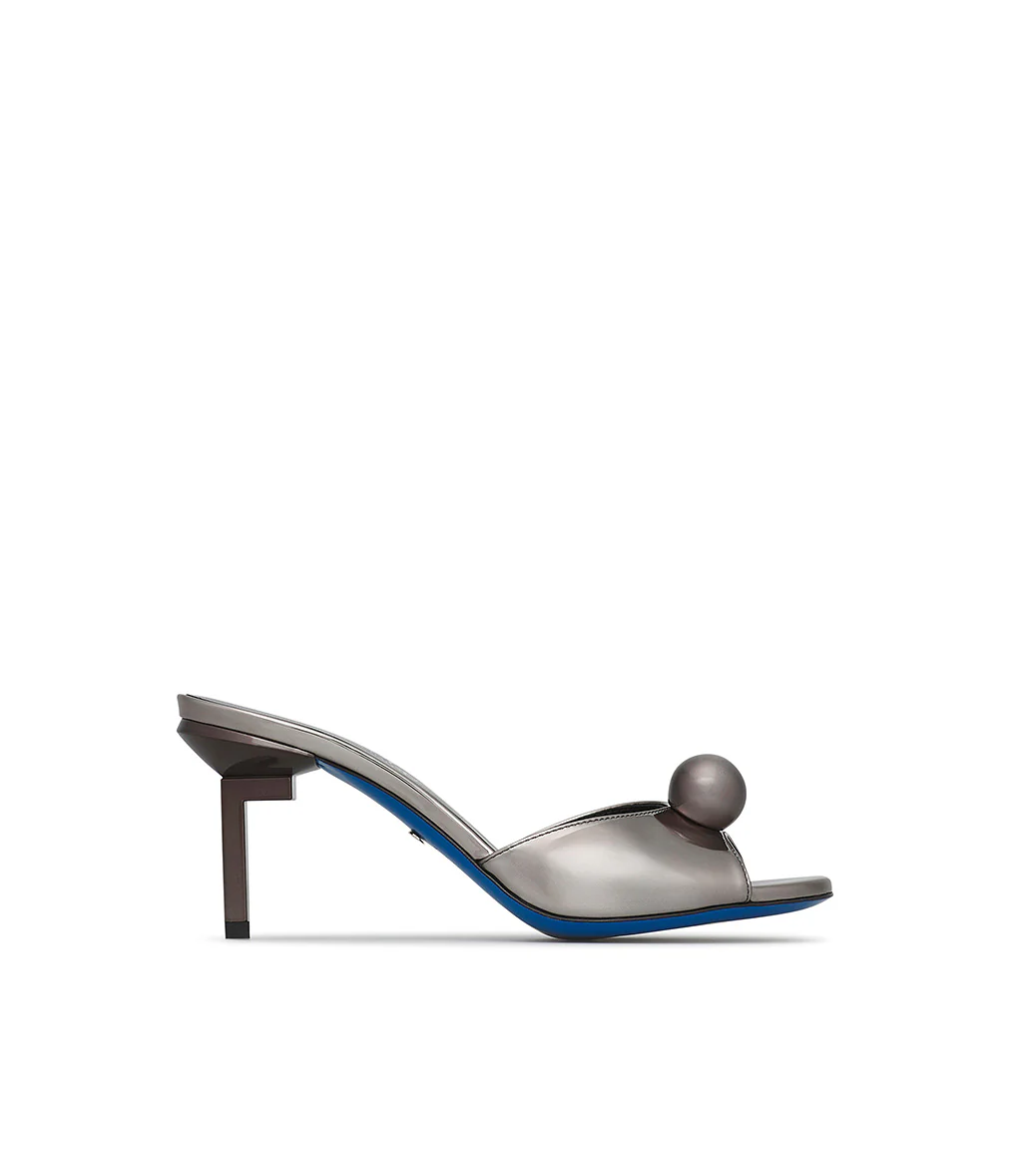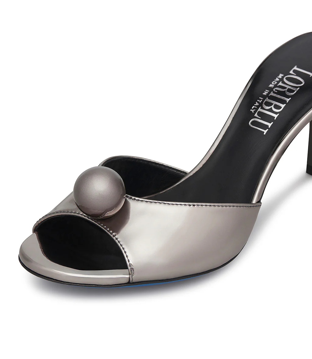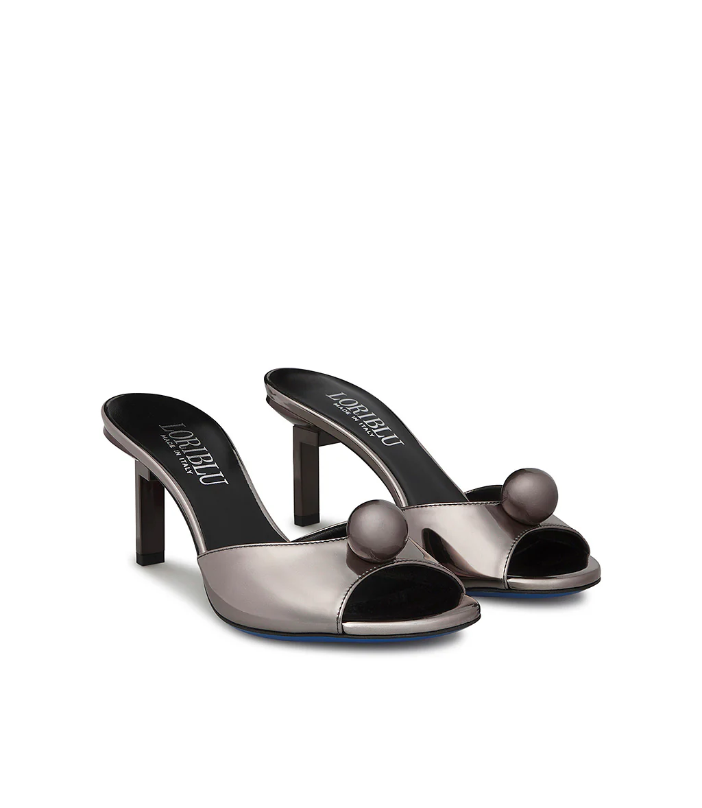 Uno stile untramontabile contraddistingue le nostre mules in vernice color antracite. Ampia fascia frontale impreziosita da un originale accessorio sferico, comodo tacco midi a L rovesciata in metallo e iconica suola Loriblu. Rendile protagoniste dei tuoi outfits escusivi della nuova stagione.