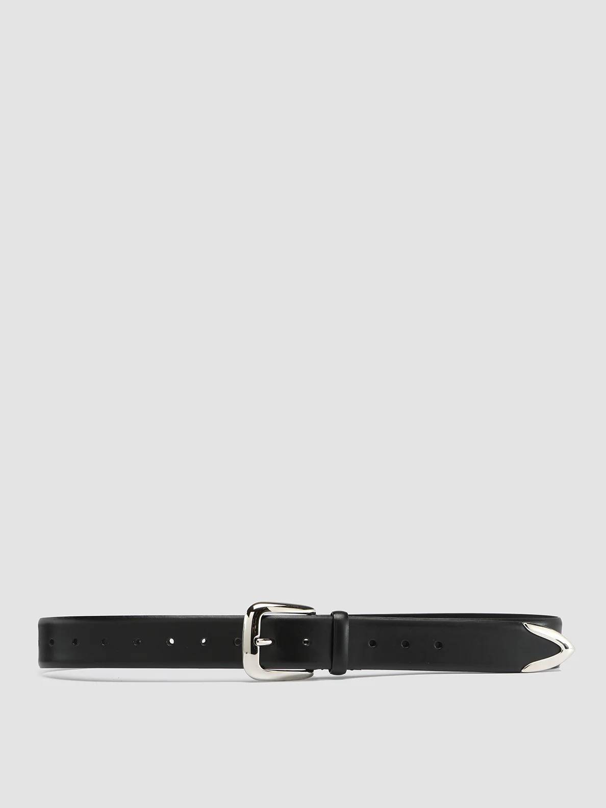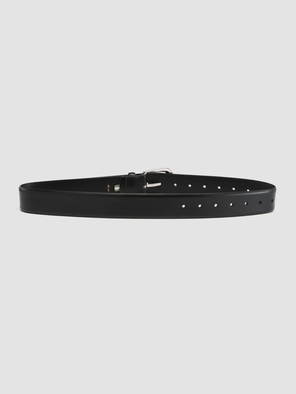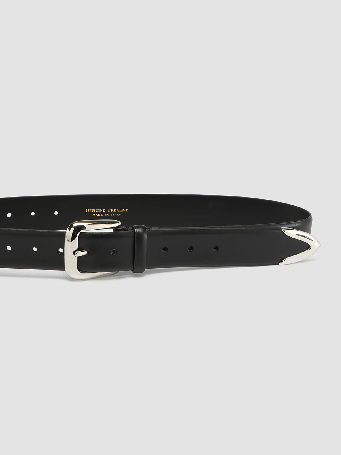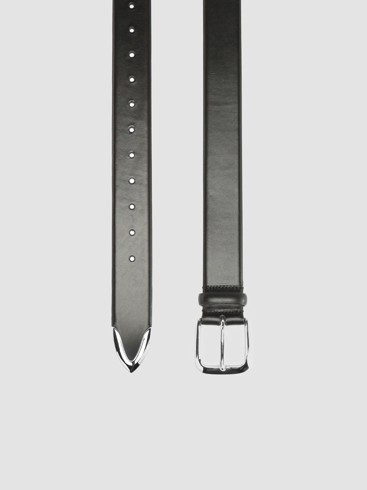 La nostra cintura OC Strip, di fattura artigianale in pelle nera si distingue grazie alla fibbia rettangolare in metallo argentato lucido e al terminale a V. Perfetta da abbinare ad abiti sartoriali e look sofisticati per il tempo libero, rivela il nostro logo con caratteri color oro impressi all’interno.