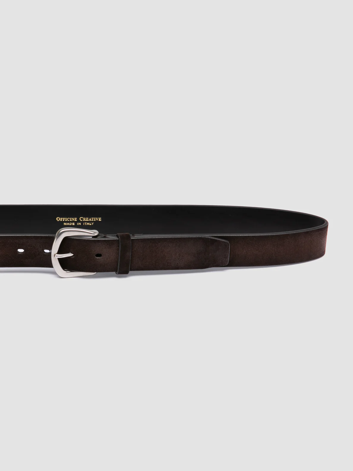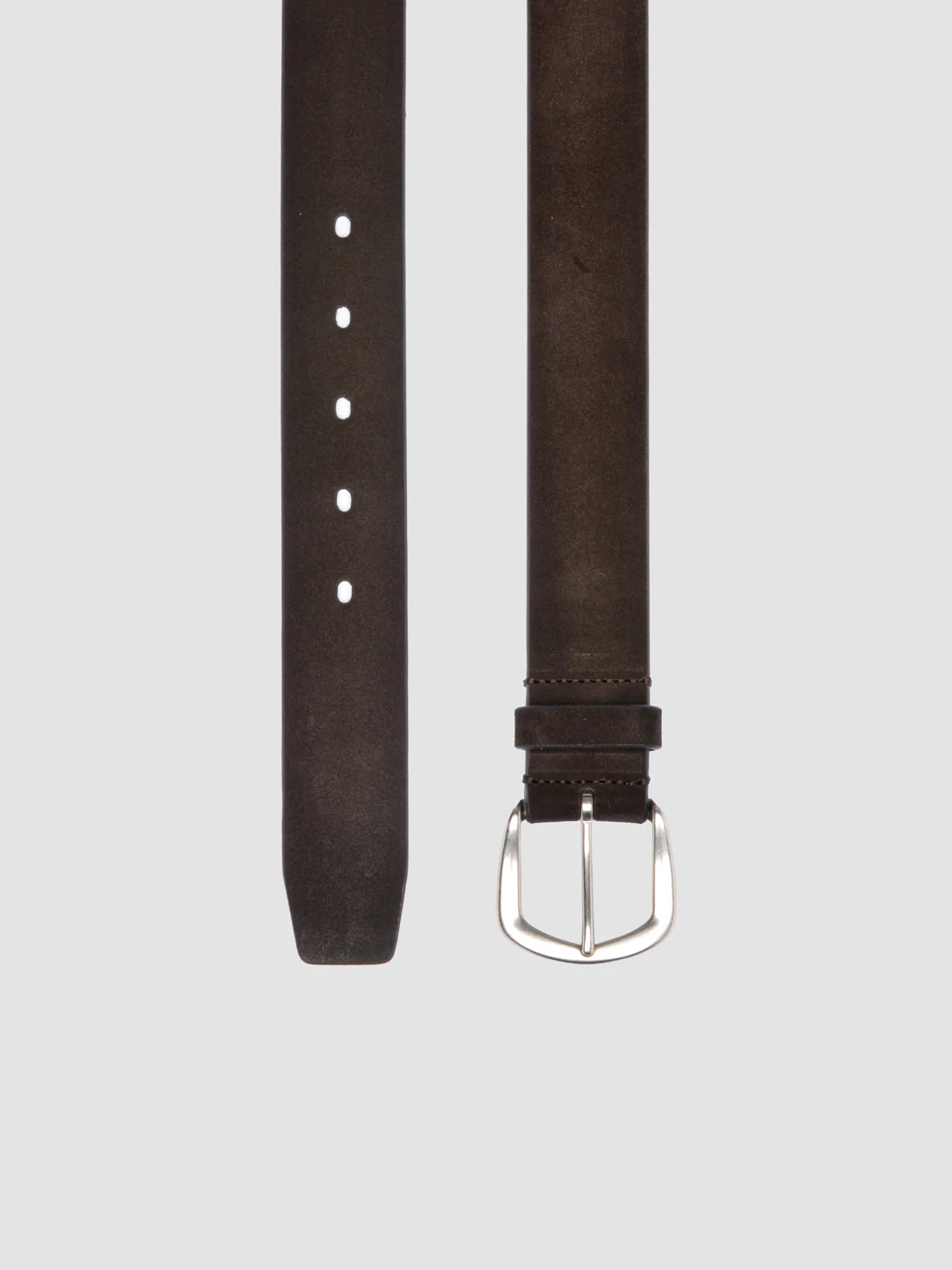 Lavorata a mano in Italia, la cintura OC Strip 083 sfoggia un elegante camoscio marrone scuro con finitura aerografata. Il design minimalista si completa con una fibbia in metallo color argento, le cuciture pulite e il terminale a punta che ne esalta il fascino raffinato.