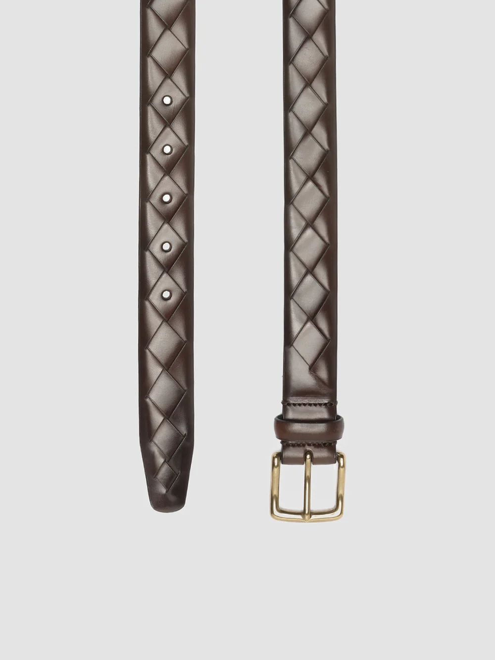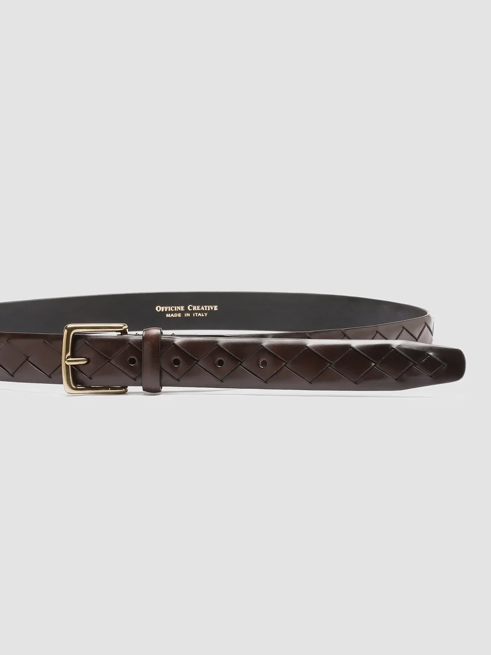 Caratterizzata da un raffinato design in pelle intrecciata, la nostra cintura OC Strip è sapientemente realizzata a mano in pregiata pelle aerografata nei toni del marrone scuro. Presenta una classica fibbia quadrata in metallo dorato con logo stampato all’interno e la nostra caratteristica linguetta ad anello in gros-grain.