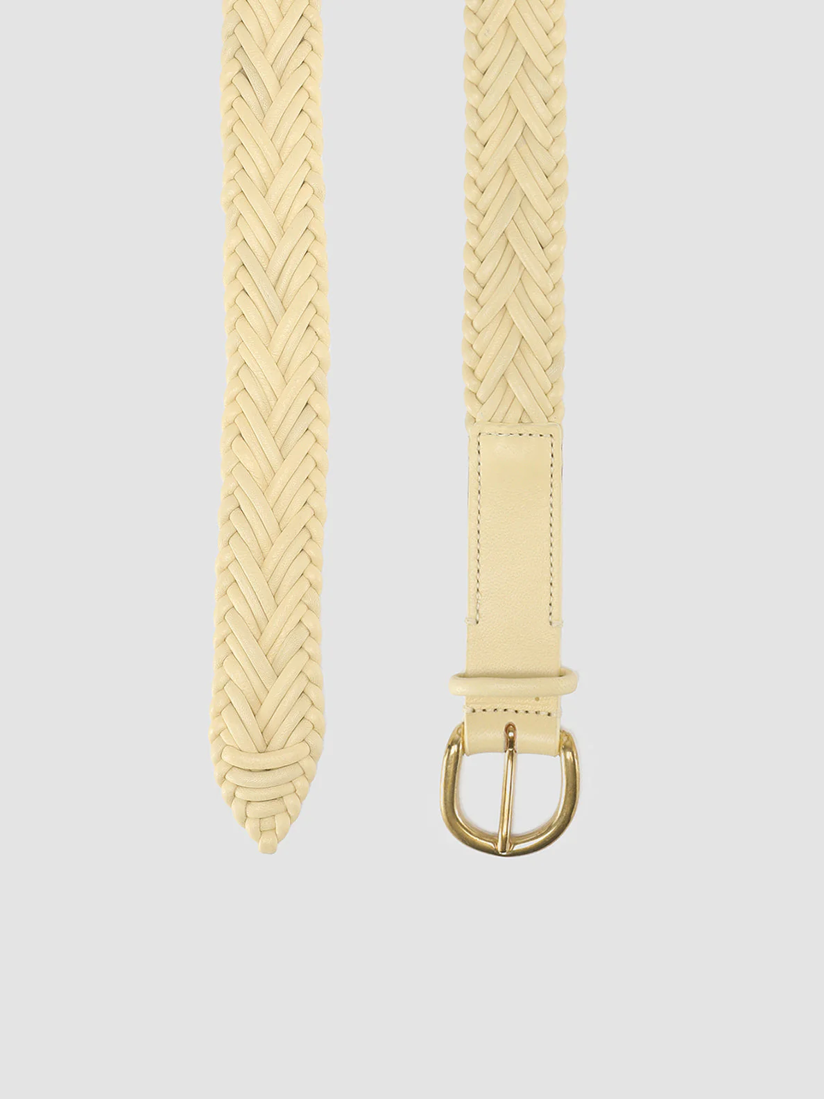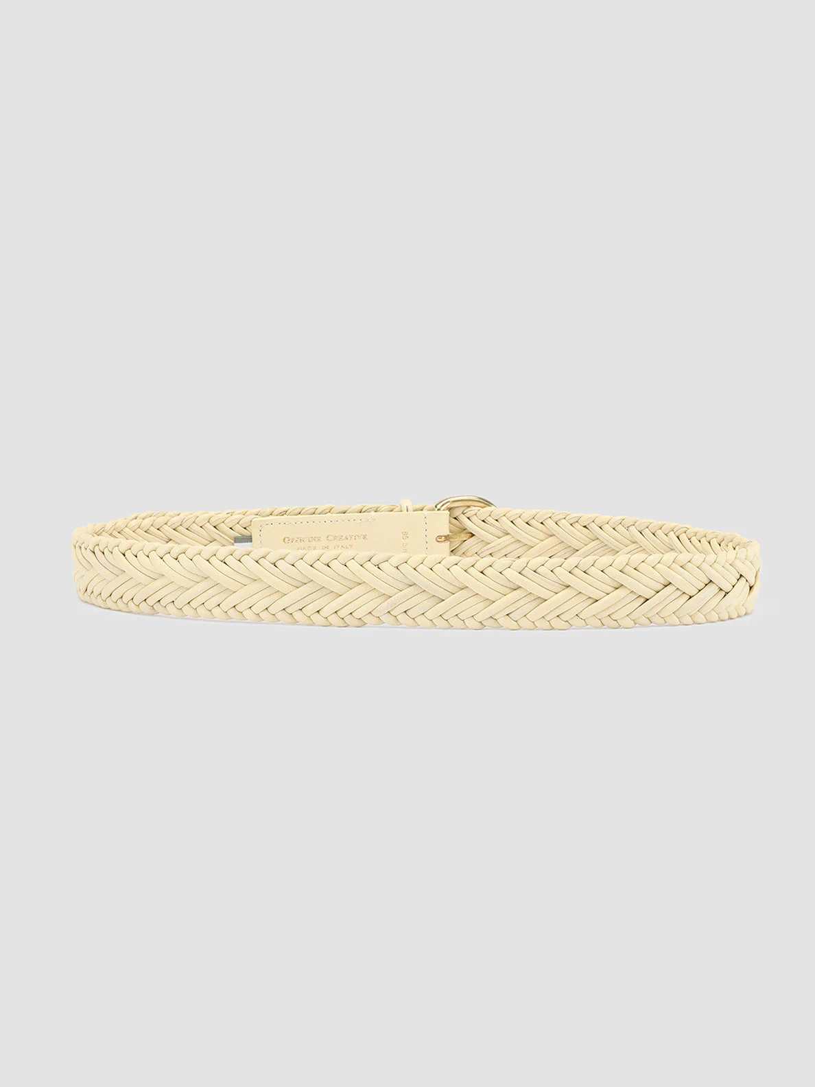 La nostra cintura OC Strip è un prodotto artigianale unico che si distingue grazie al raffinato motivo intrecciato. Perfetta per gli stili casual e formali, è disponibile nei toni crema ed è caratterizzata dalla fibbia arrotondata in metallo color oro, il logo con caratteri stampati all’interno e l’inconfondibile passante in gros-grain.
