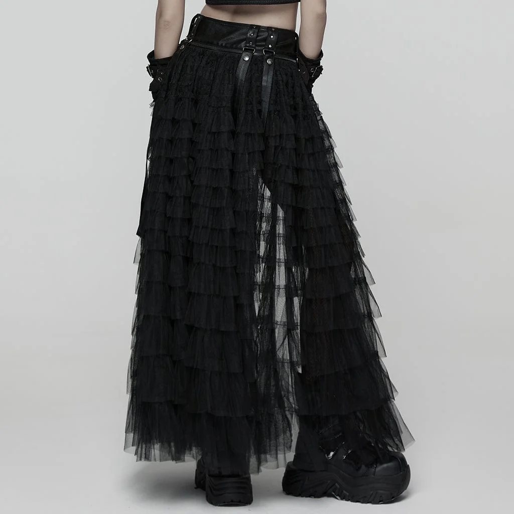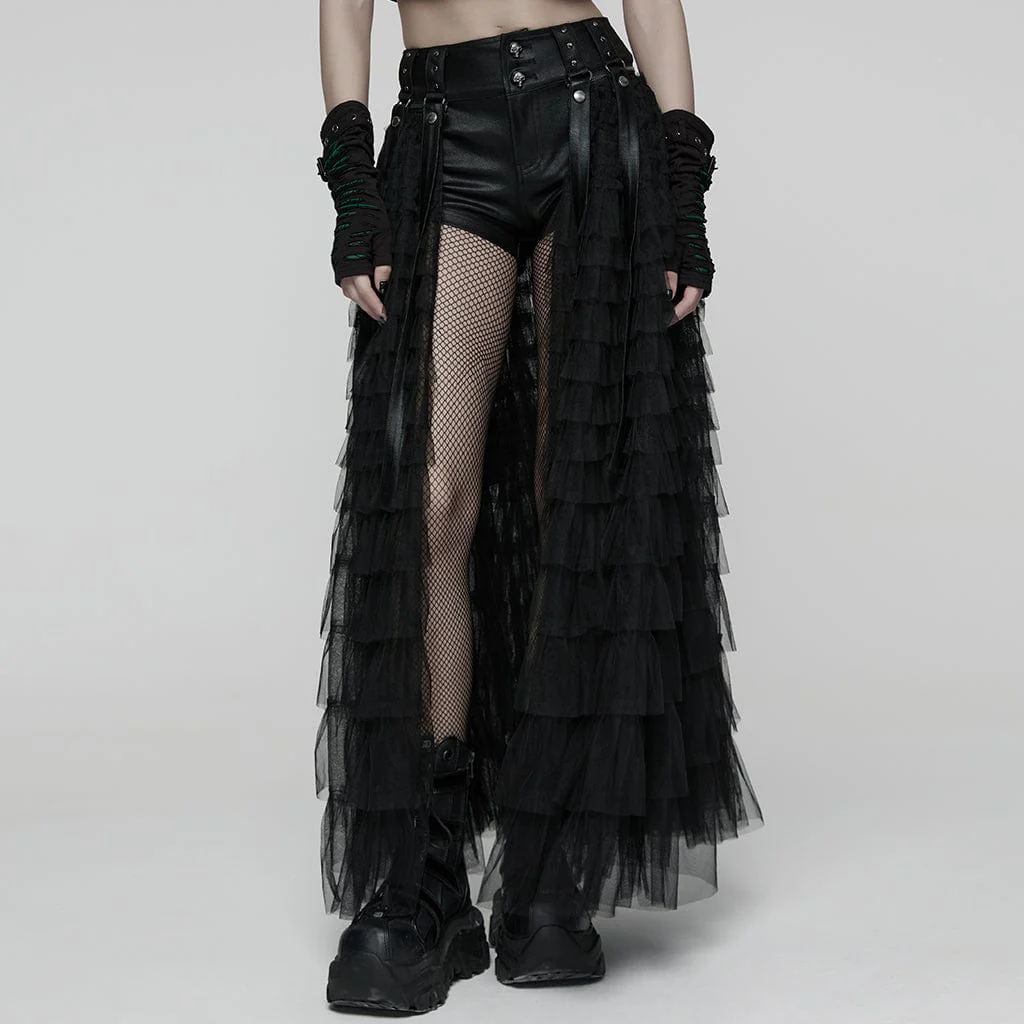 L’orlo staccabile della gonna lunga in rete è collegato agli shorts tramite zip. Il contrasto tra la leggerezza della rete e lo stile robusto è massimizzato. Grazie alla caratteristica “monopezzo, multiuso”, crea un look punk di grande impatto, nascondendo la ribellione nella struttura mutevole.