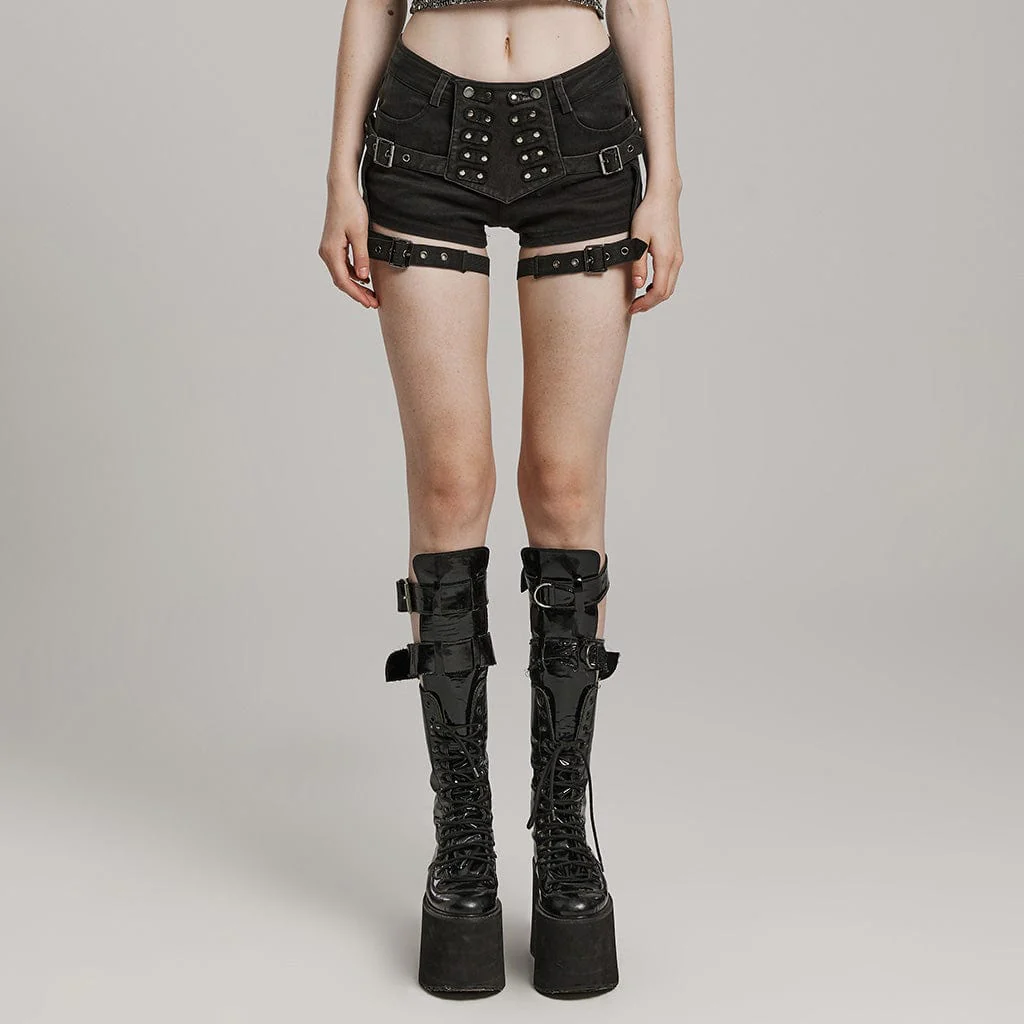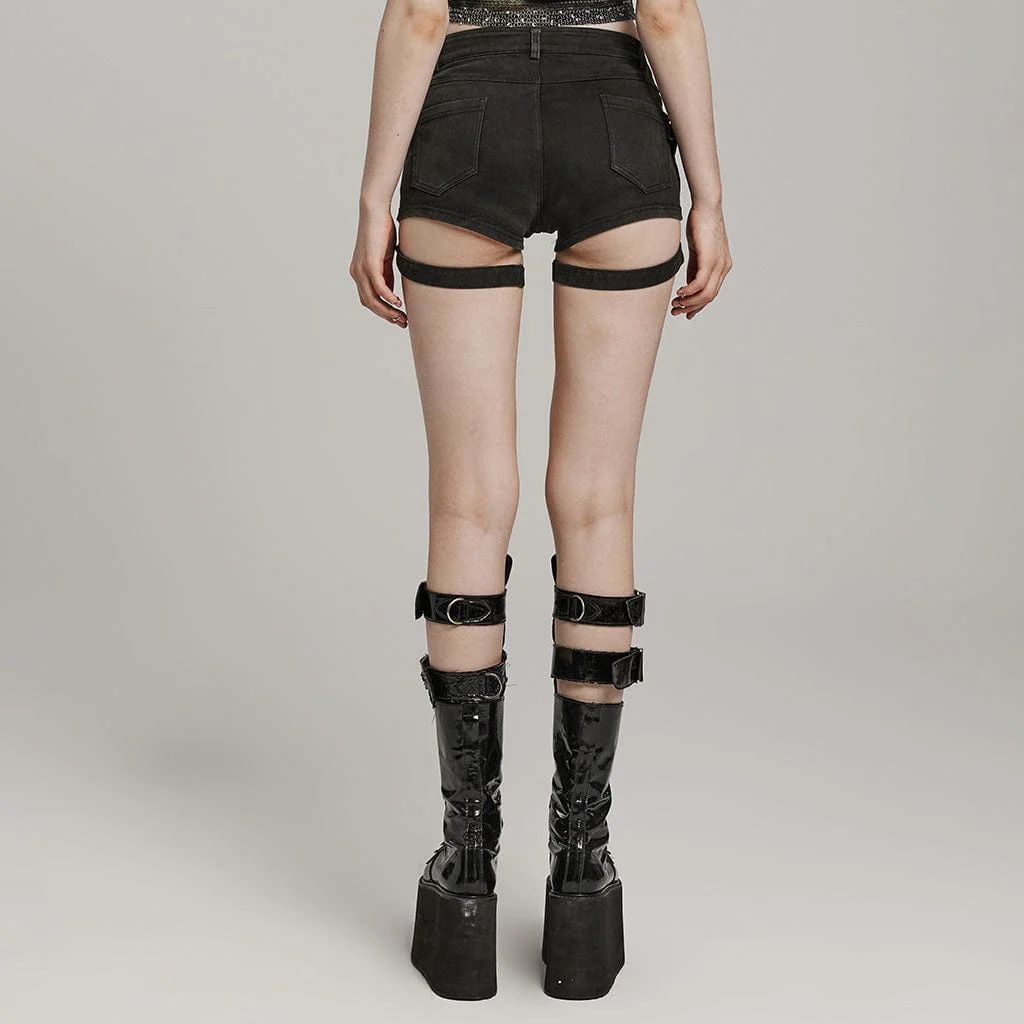 Questi pantaloncini attillati sono realizzati in tessuto denim elastico. Ha bottoni simmetrici sul davanti per la decorazione. Questi pantaloncini da ragazza sexy dalla vestibilità attillata hanno due fibbie regolabili su entrambi i lati.