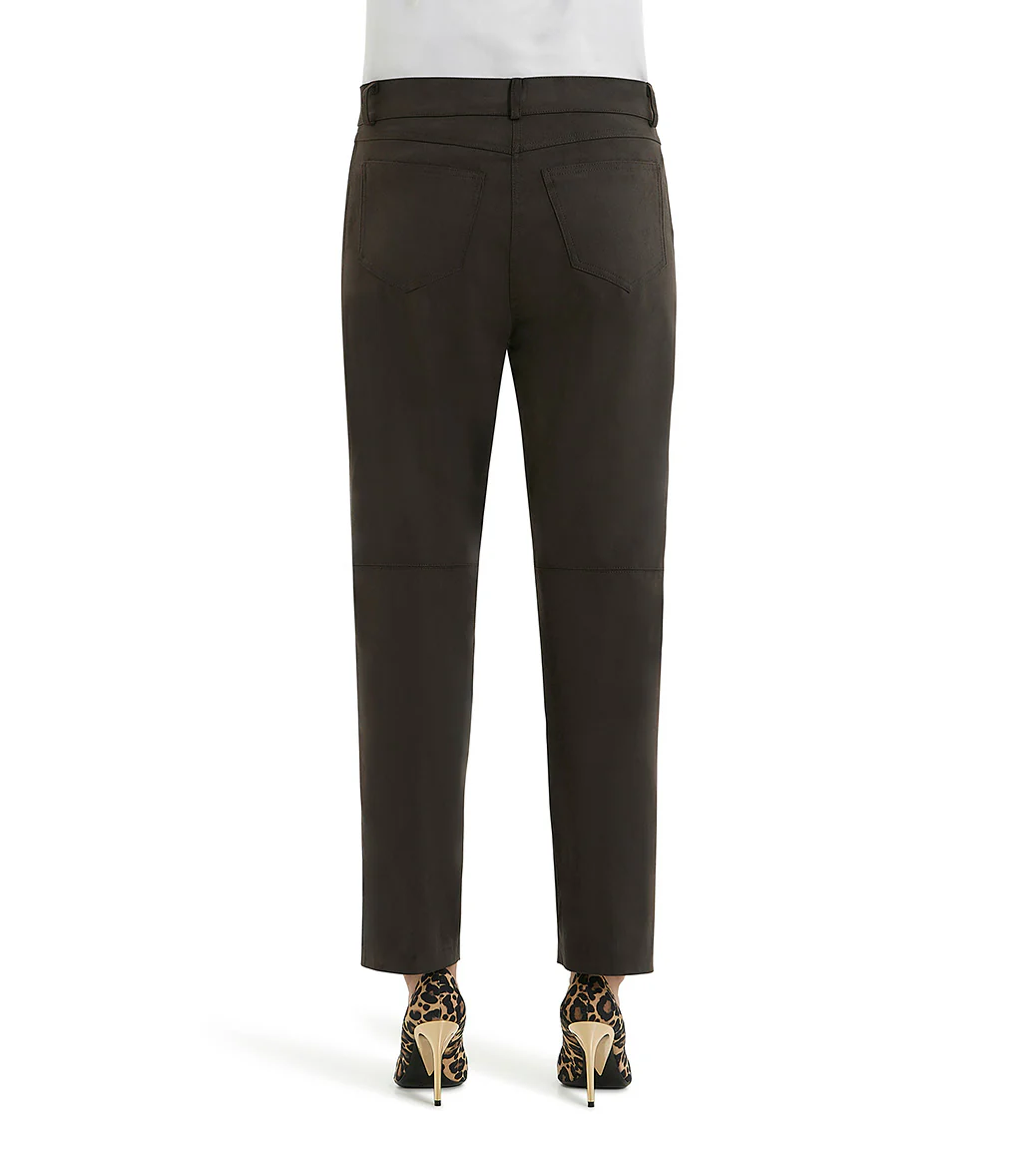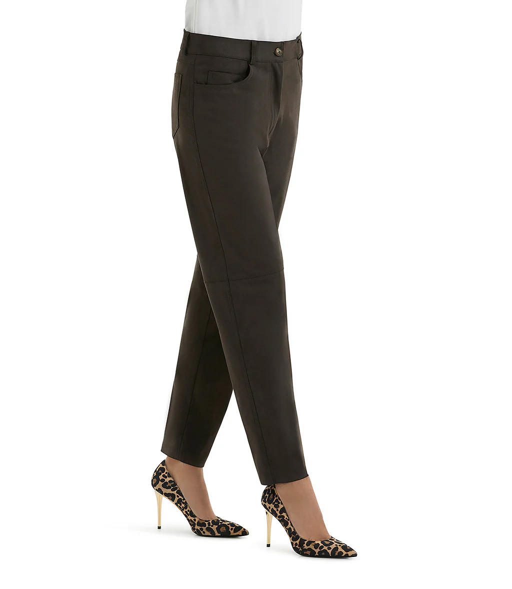 Pantalone in poliestere effetto camoscio colore chocolat, con vestibilità dritta, cinque tasche classiche e un elegante taglio all’altezza del ginocchio.