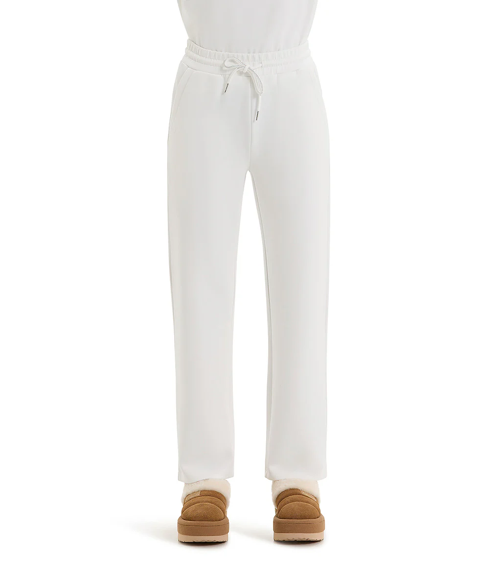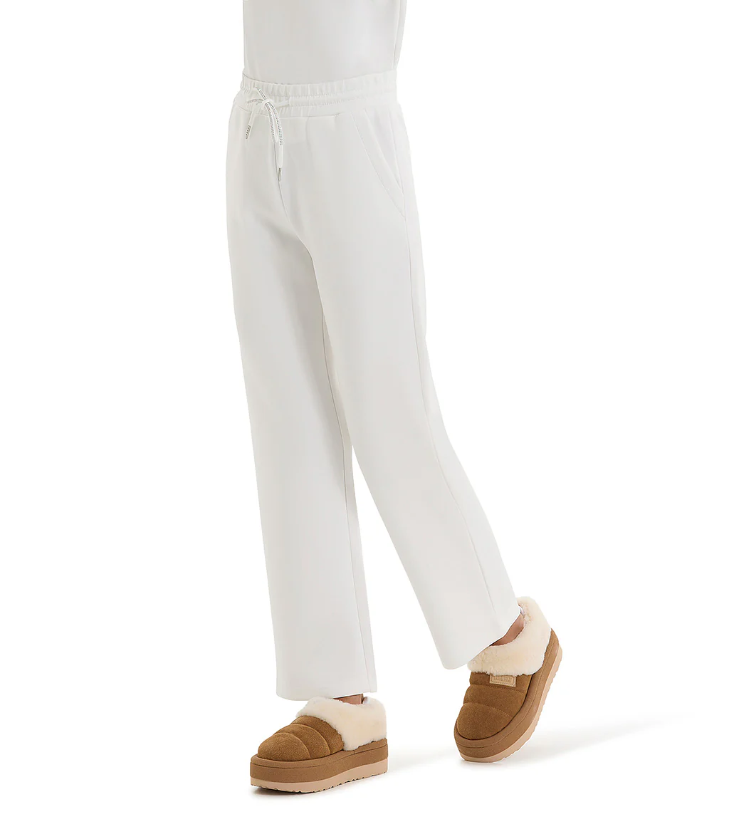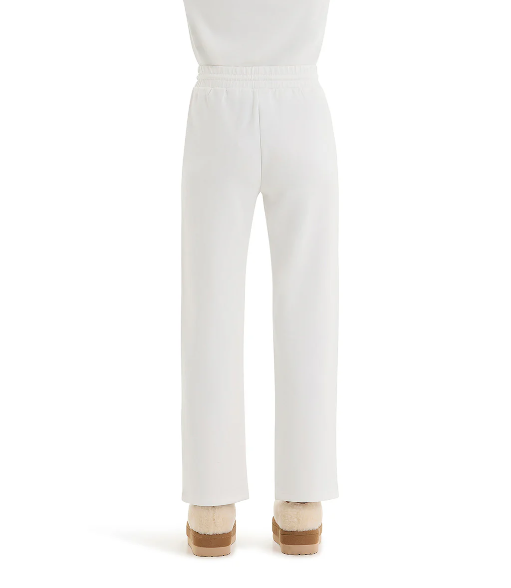 Pantalone in viscosa e poliestere color vaniglia, dritto elasticizzato. Presenza di lacci in vita con brillanti colorati, tasche alla francese decorate con il punto overlock con filo lucente.