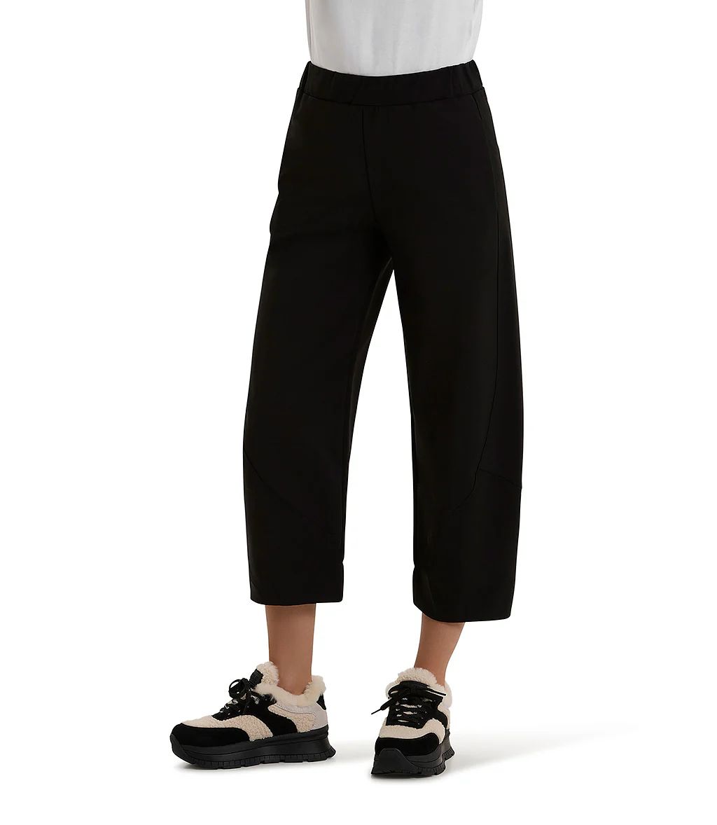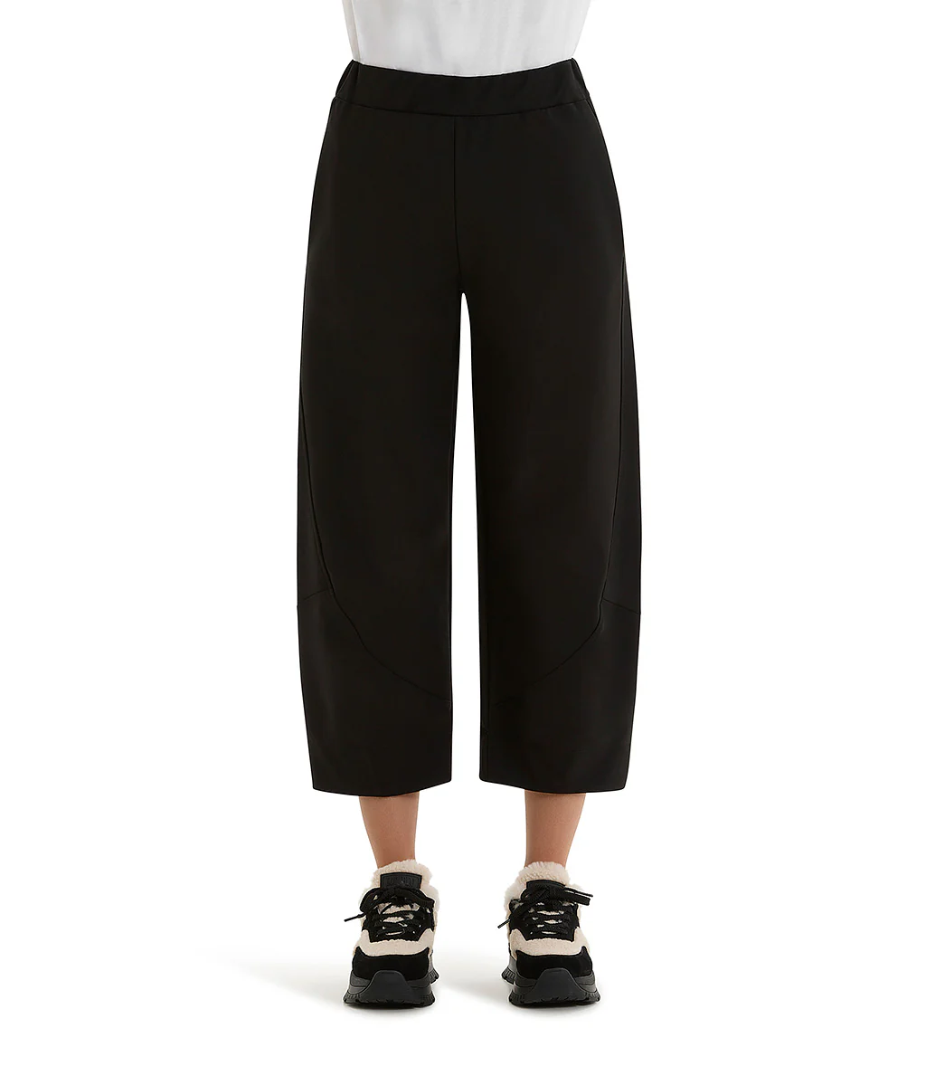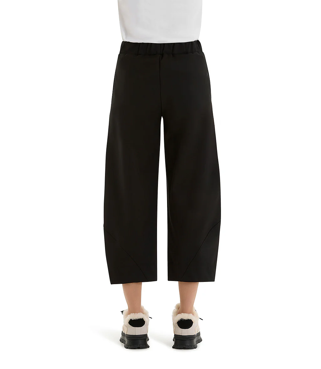 Pantalone nero in cotone con cinturino elasticizzato in vita, tasche a filetto sui fianchi, tagli simmetrici sul fondo.
