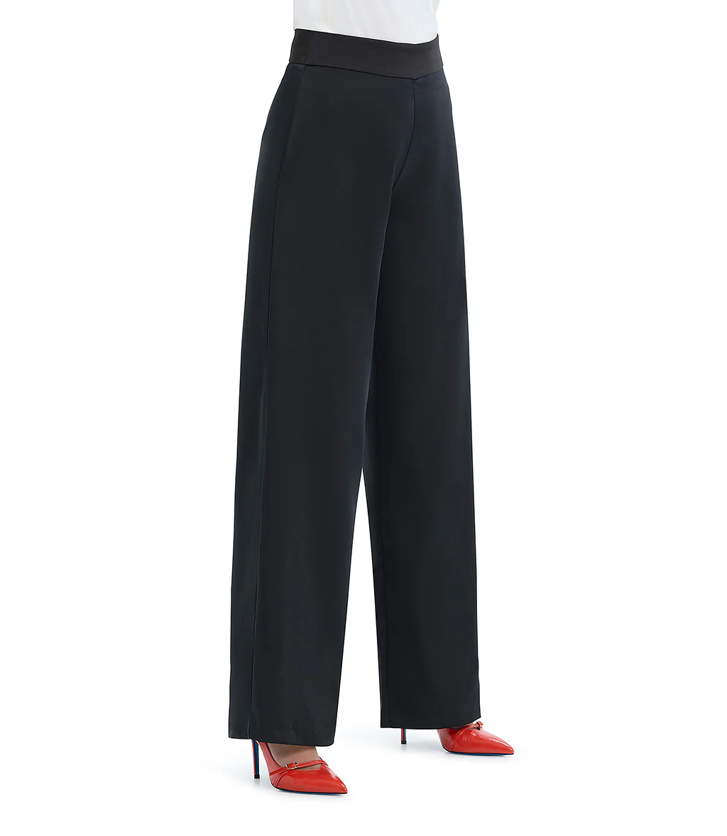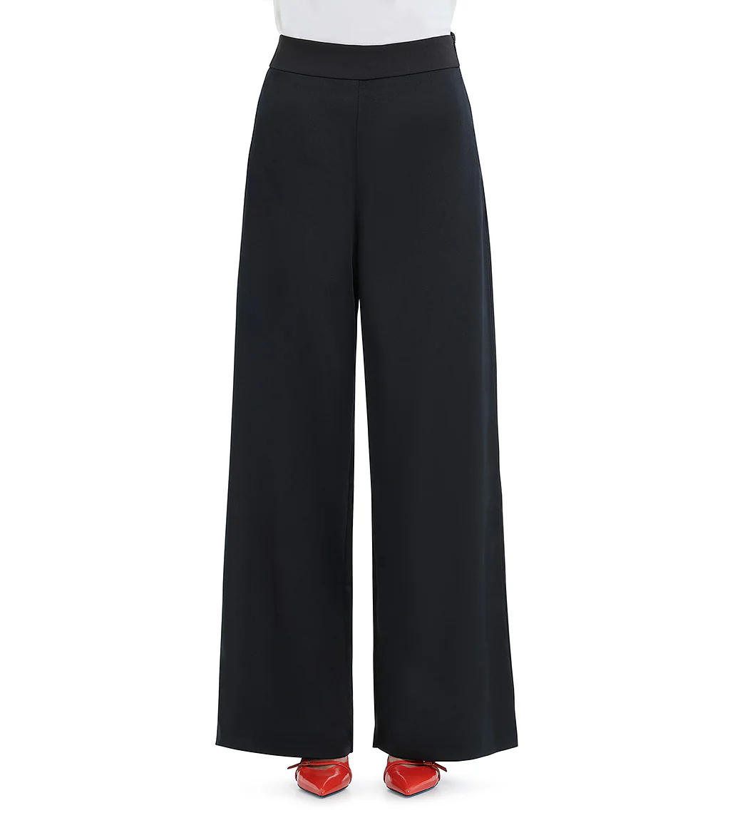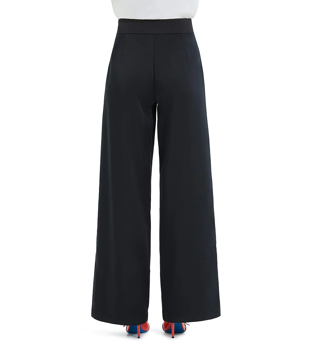 Pantalone palazzo nero elegante con zip laterale. In abbinamento alla giacca smoking in pizzo