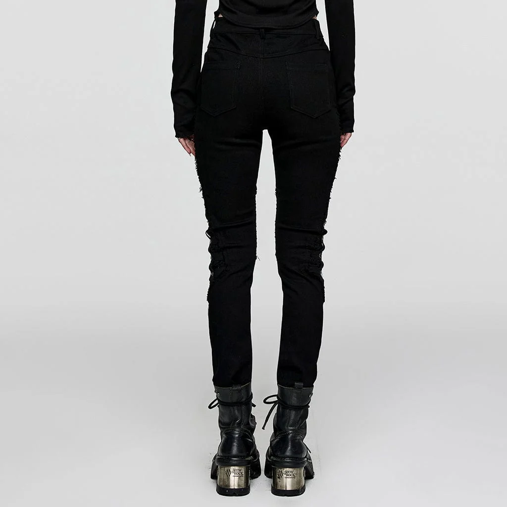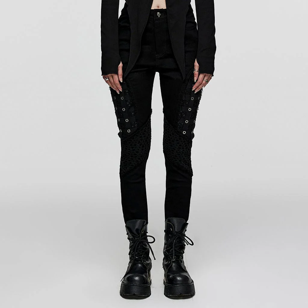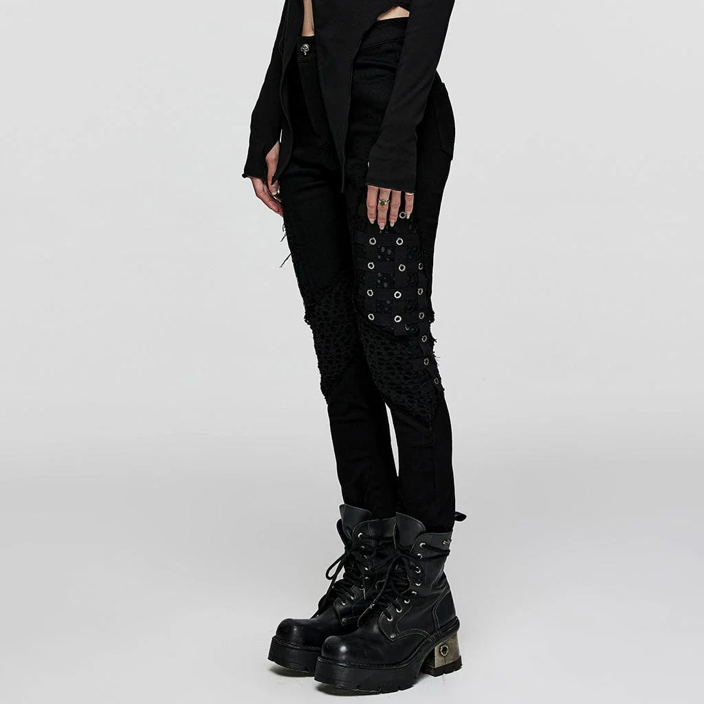 Questo paio di pantaloni punk è realizzato in tessuto twill. Design dettagliato con patchwork di cinturino in rete e occhielli sul davanti. Silhouette aderente e buon tessuto elastico.